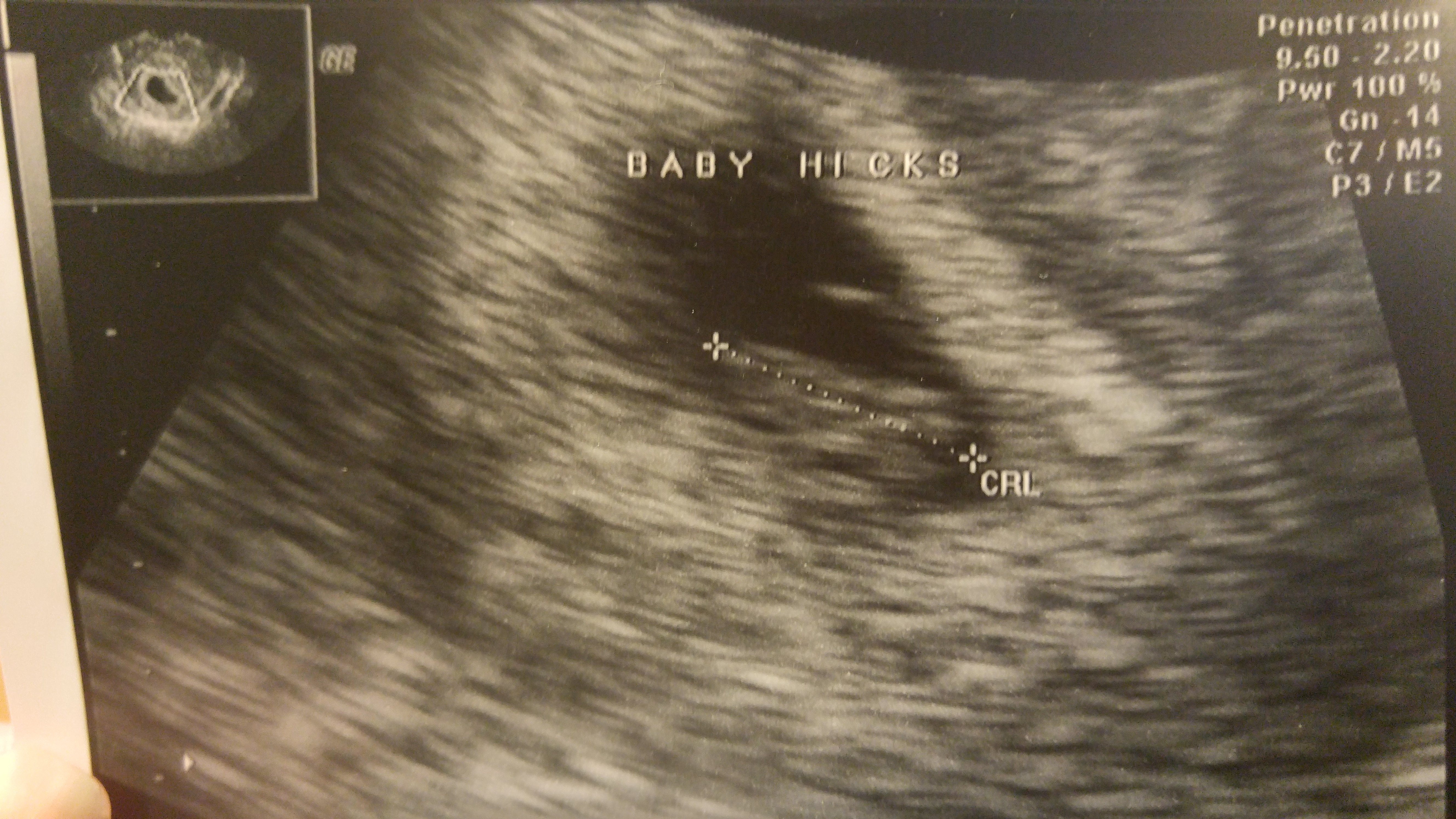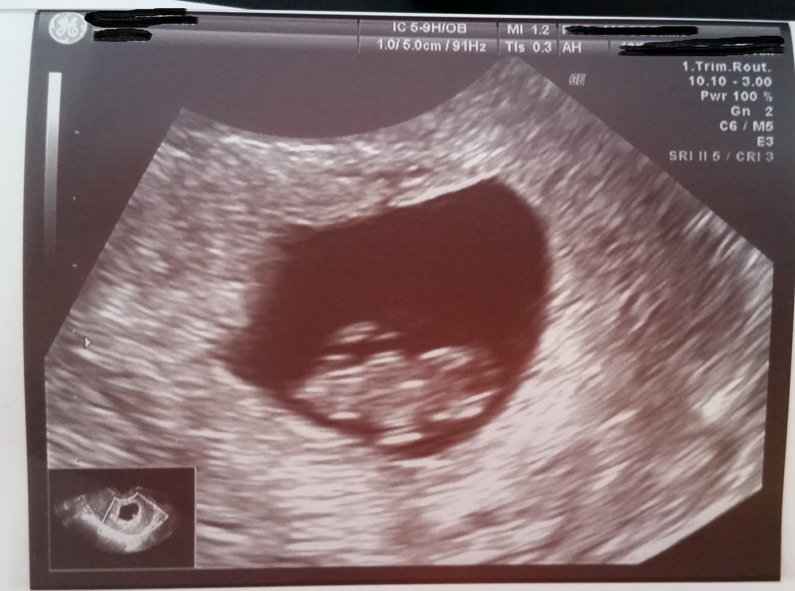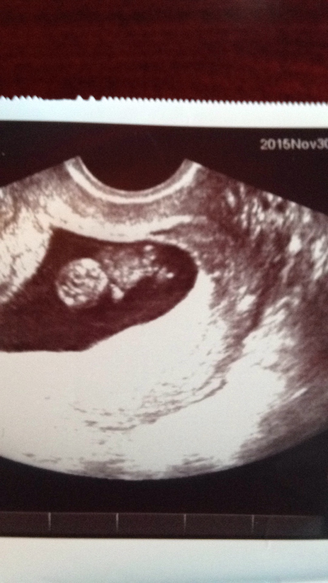 My first ultrasound pic at 9w3d. Measured a few days small. Doctor pointed out that I had twins, but one was not able to stick around We're sad about this, but we're thrilled to see our other healthy little baby! So in love!