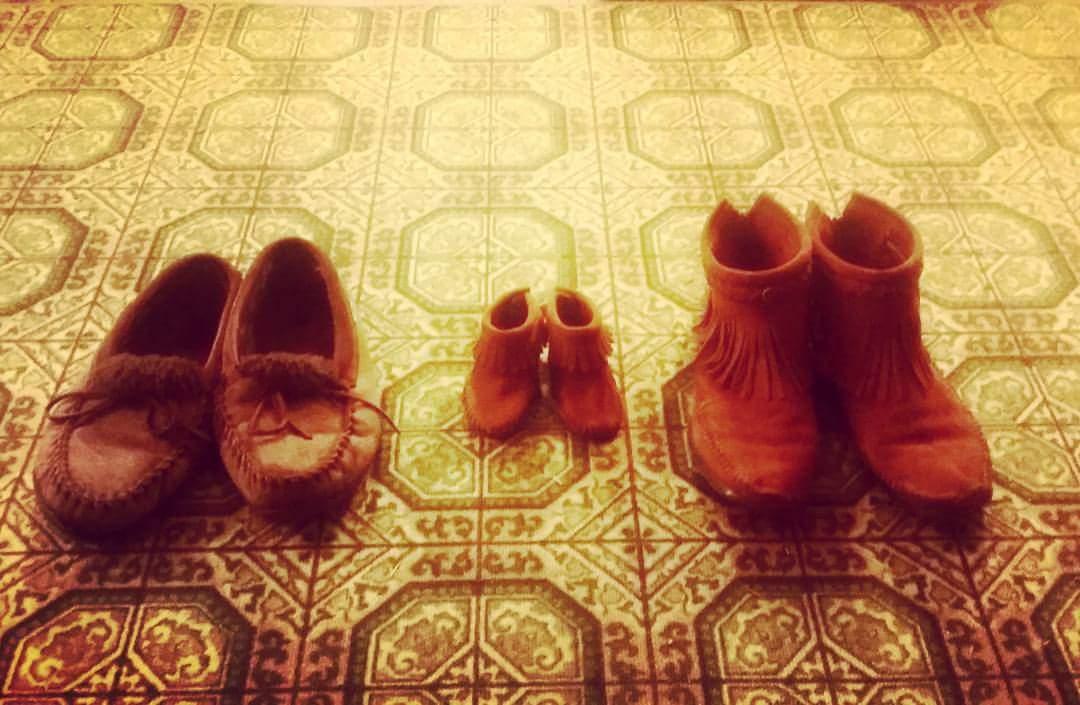 Thanks! I saw those baby minnetonkas at a thrift store by my house and I had to have them. The rug is vintage! I like yours too, the little slippers are too cute.
