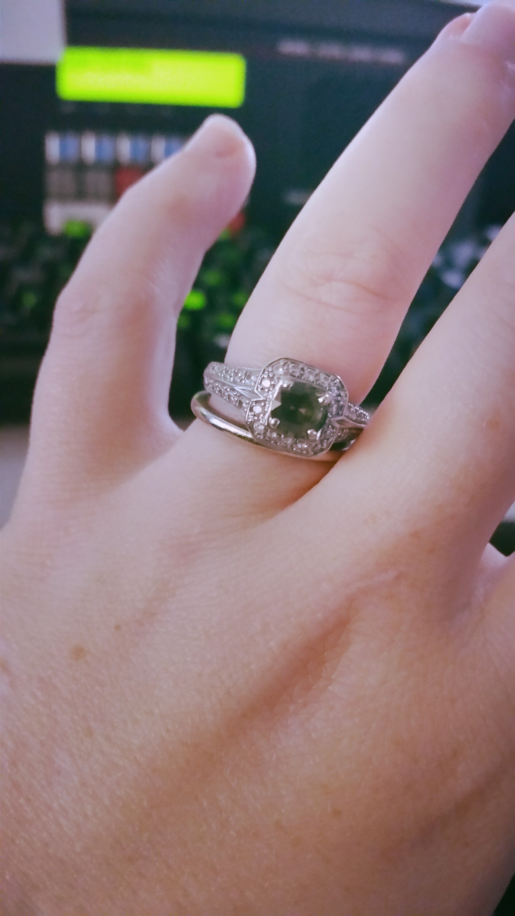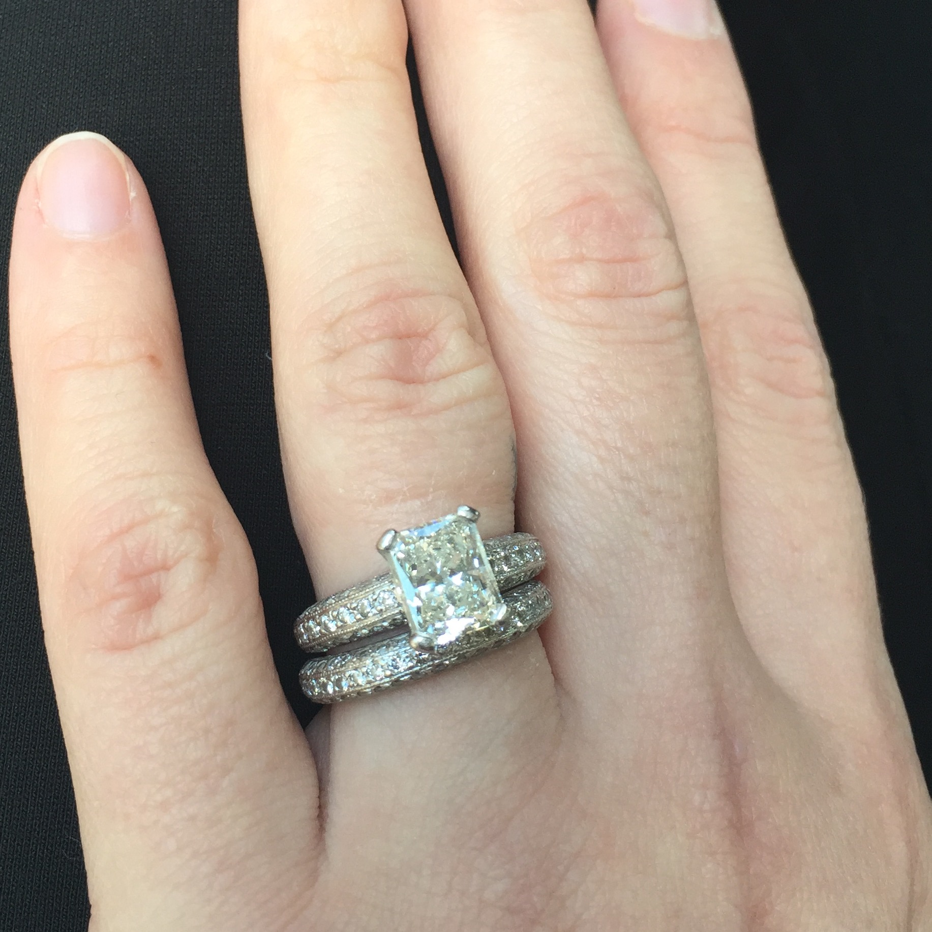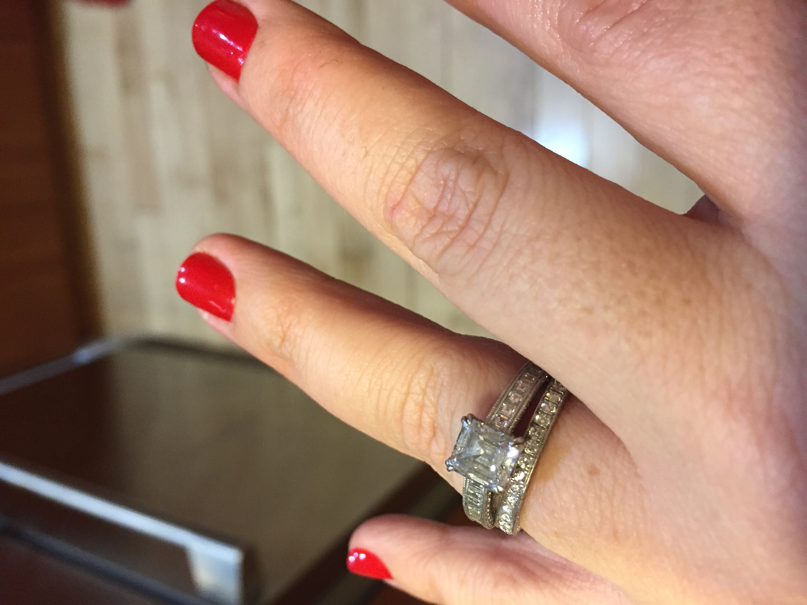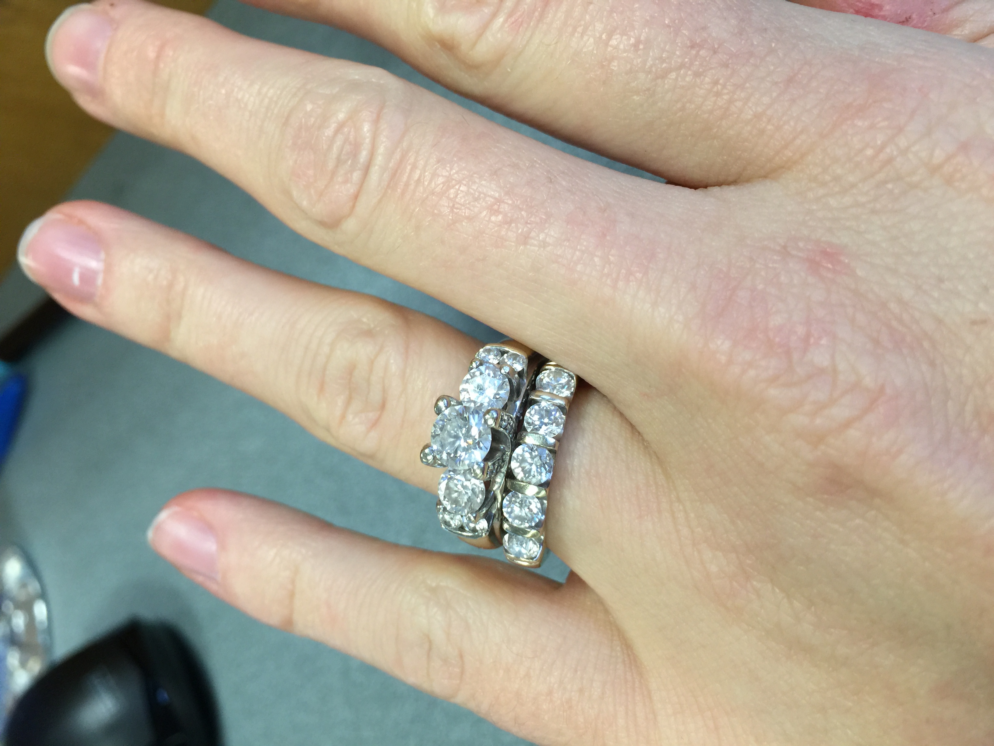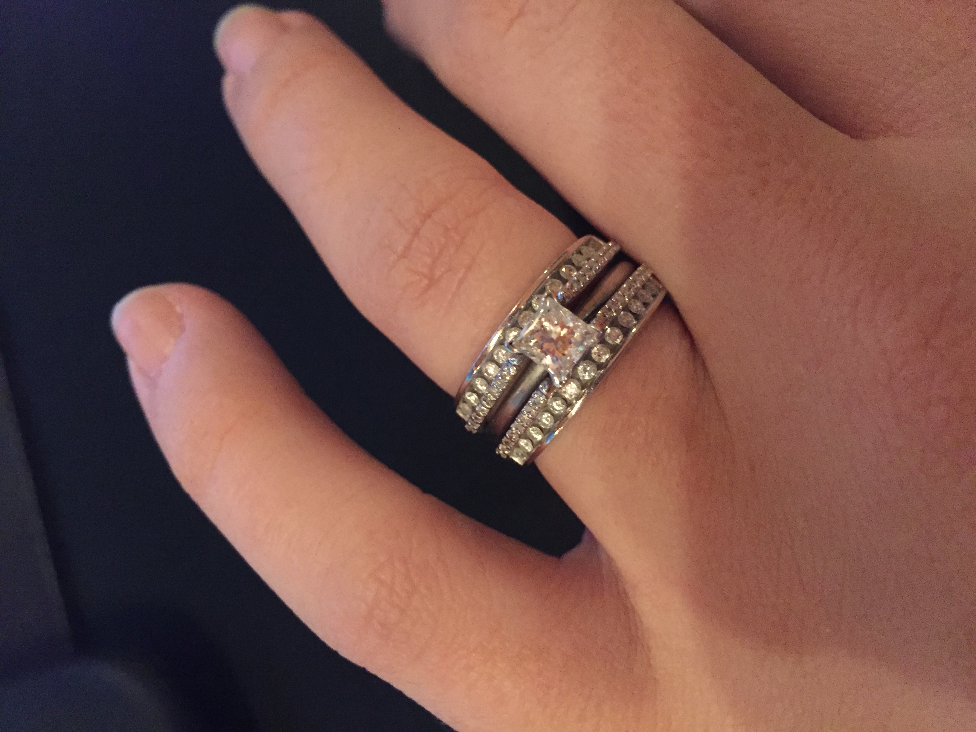 I posted two pictures. One of just my engagement ring and one of my ring now (apparently I need to get it cleaned again).