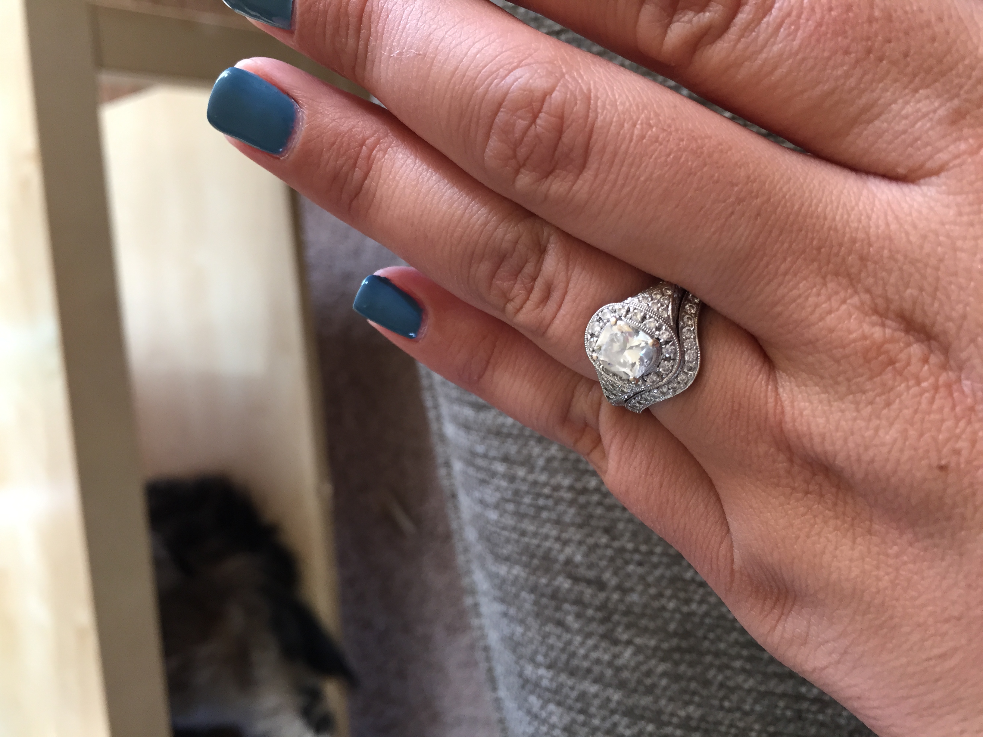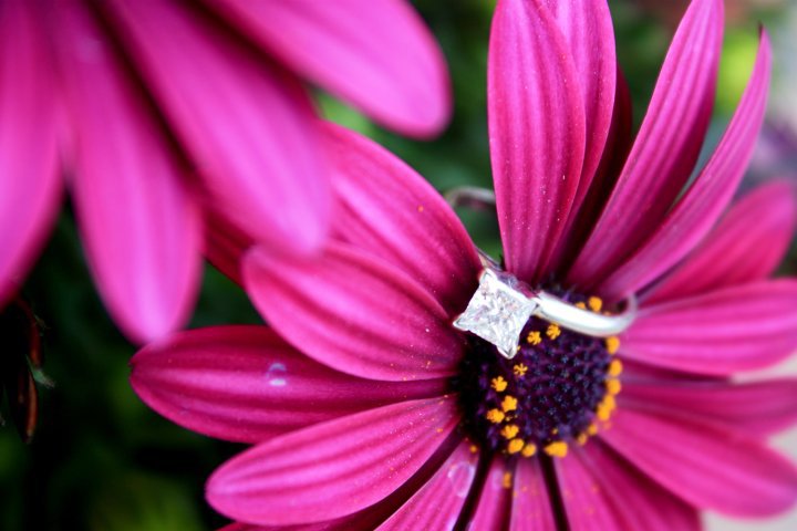 H proposed in our old apartment one night. I came home and he had cooked a wonderful dinner, had my favorite flowers on the table, and had romantic music playing. I was completely oblivious having just got home from work and went to hang up my coat. When I turned around he was on his knee with the ring. I shouted, "oh f***!" and ran into the bedroom.
