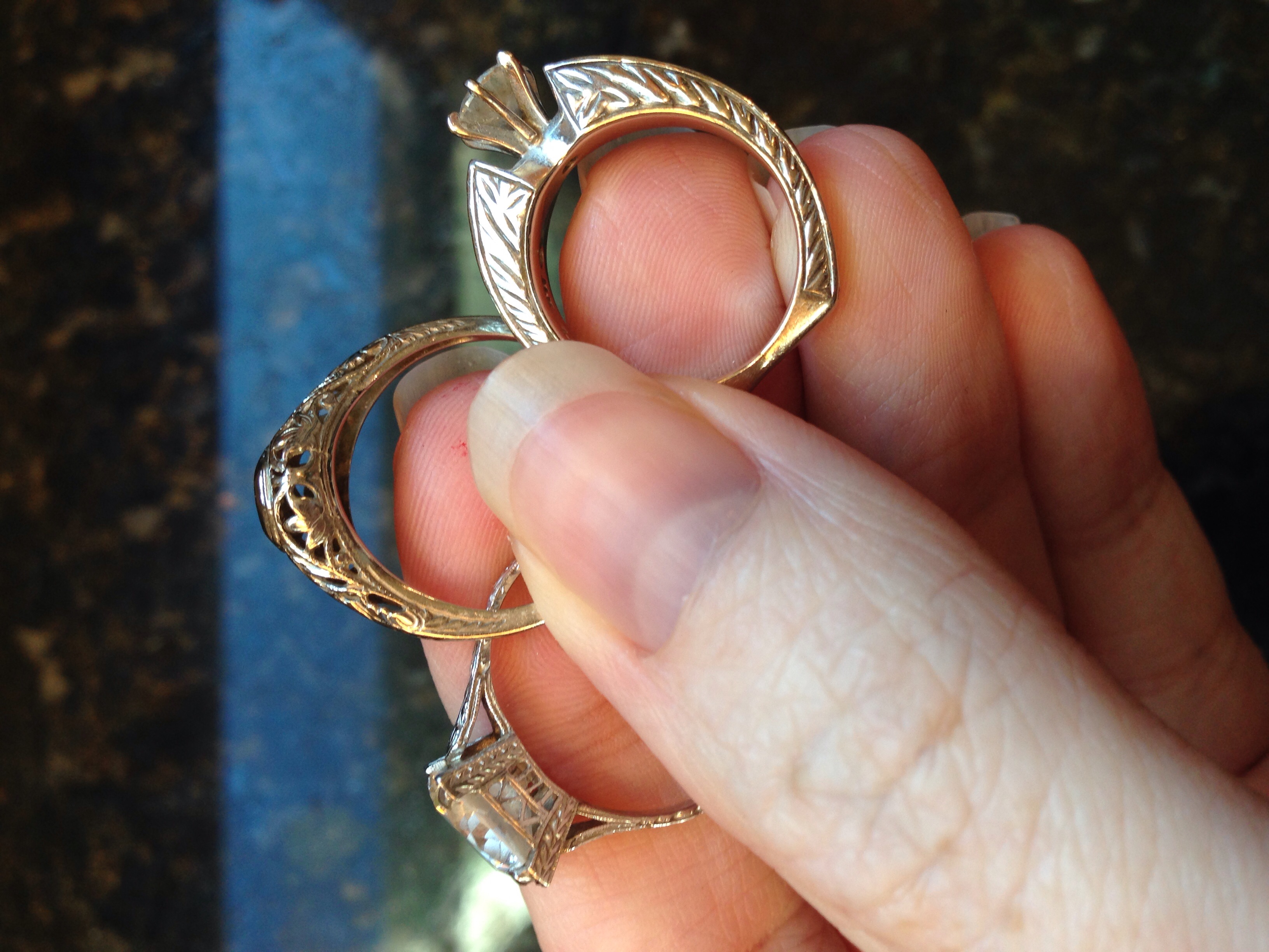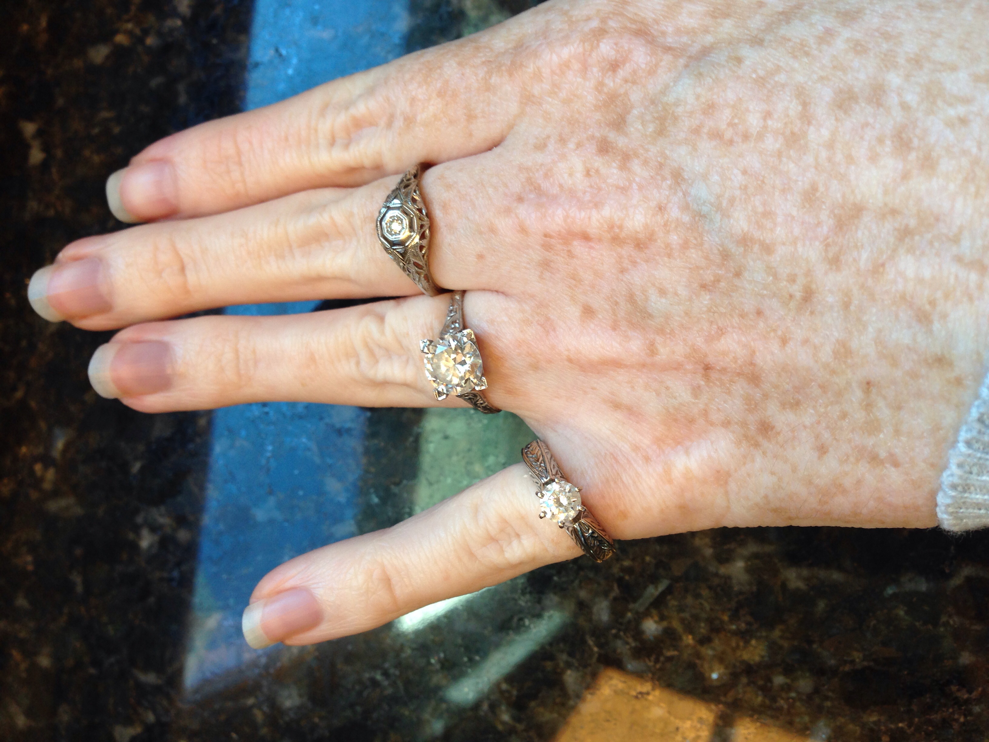 I love this thread! Reading everyone's stories is so fun and I love jewelry! Mine are really cool antique rings from around 1920-1930. The one with the thick band is my engagement ring, the second with the larger diamond is my 10 year anniversary ring, and the third dome-style ring is my wedding band, which is my grandmother's promise ring from 1920. (I only wear one at a time.)