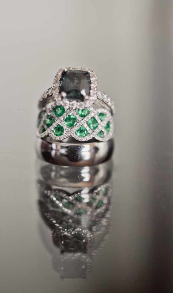 DH and I paid for our wedding and I told him to forgo the ring until we were more financially stable. He worked an extra job as security for Nicole Kidman and Keith Urban when they had their baby. He put all that money into the ring I chose 2 years before I even met him and surprised me during our first dance. My favorite color is green so DH had a green sapphire put in. The inside of the ring is connected with hearts. I love the antique look and was so surprised.