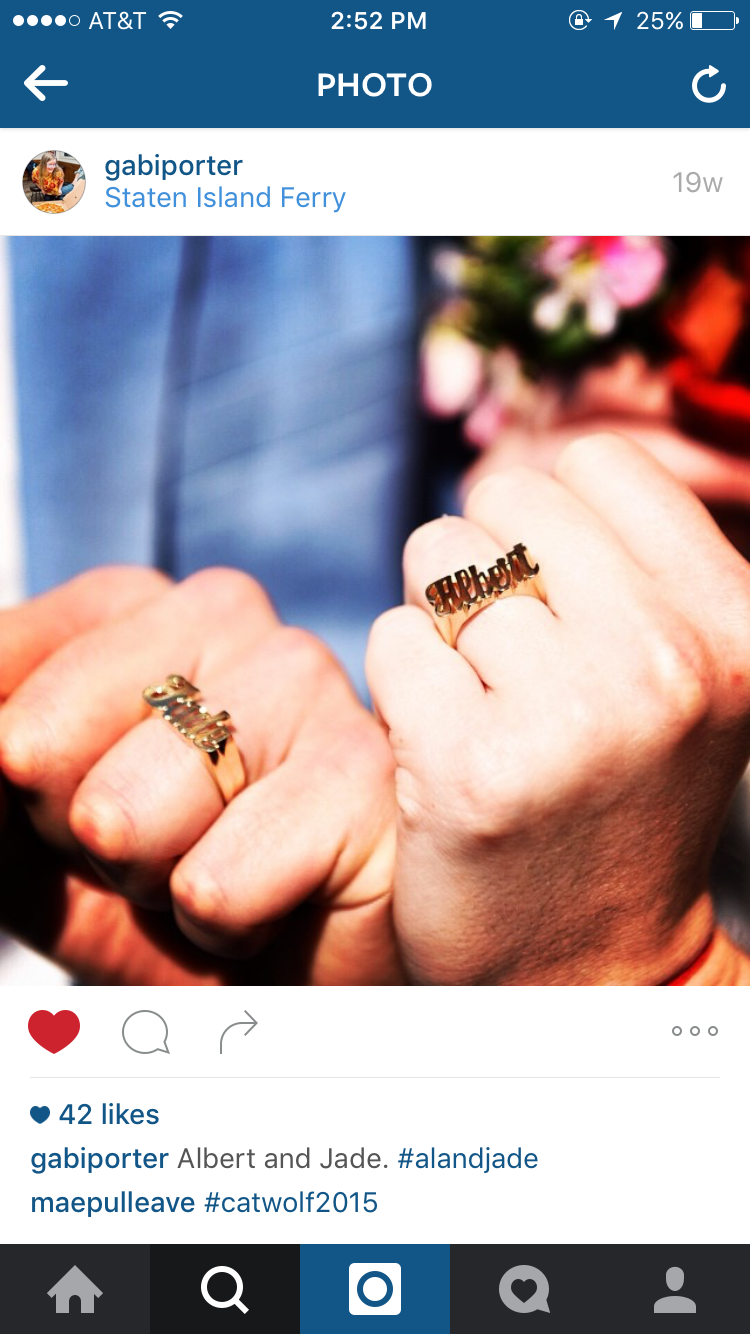 For our wedding rings, we had a guy here in NYC make custom gold bands for us. Mine has his name and his has mine.