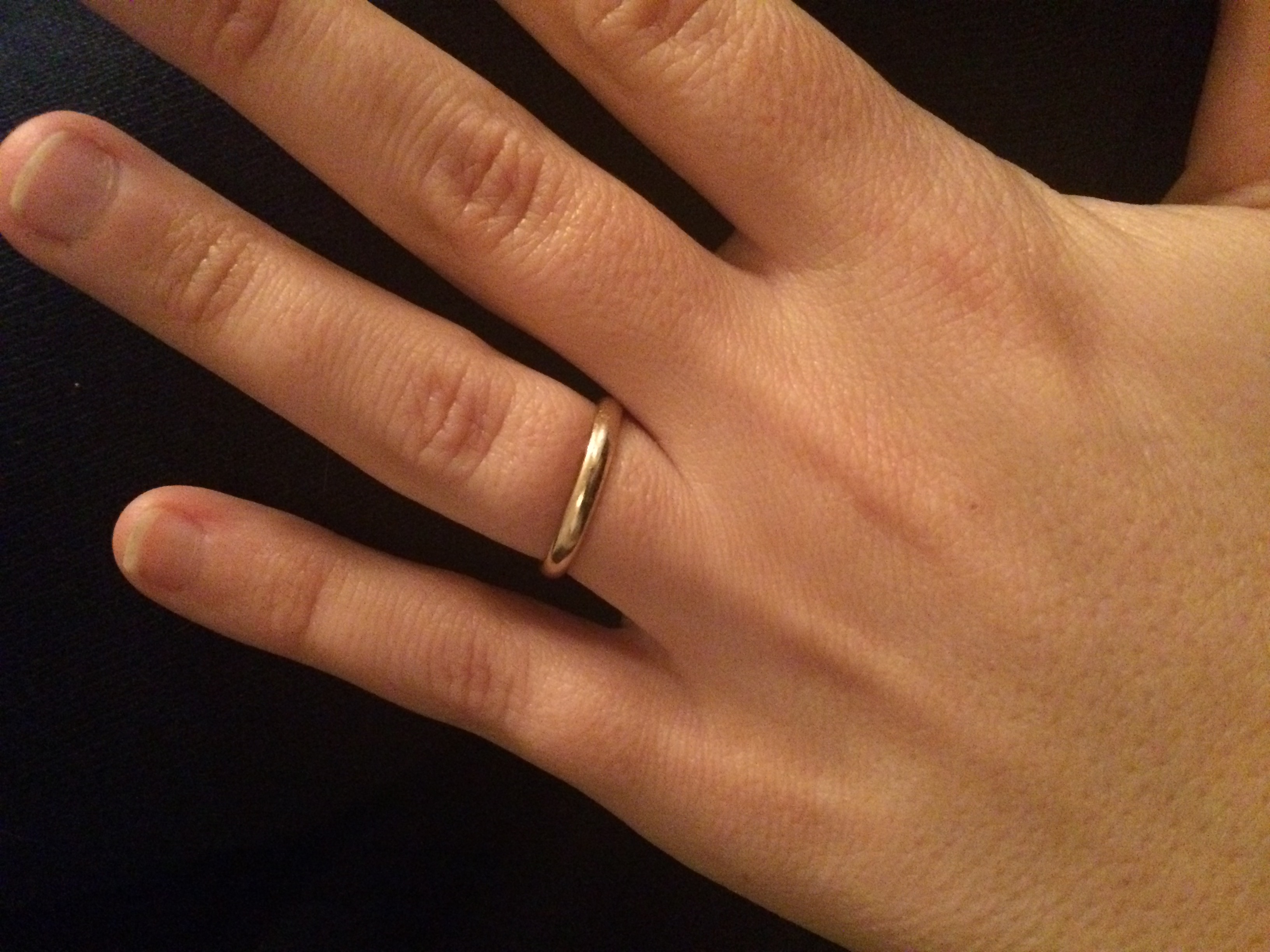 My first photo upload - I'm really wondering if it will work? I don't wear my engagement ring. All I've ever wanted was a gold band to match my husband. My husband's band is the exact same, except a little thicker. My engagement ring is a gold band with an antique solitaire diamond that was reset from his great grandmothers ring! I don't take it off, it doesn't get in the way and it is perfectly me! I love the bling in all the photos, but like @Merciel says, "you do you"