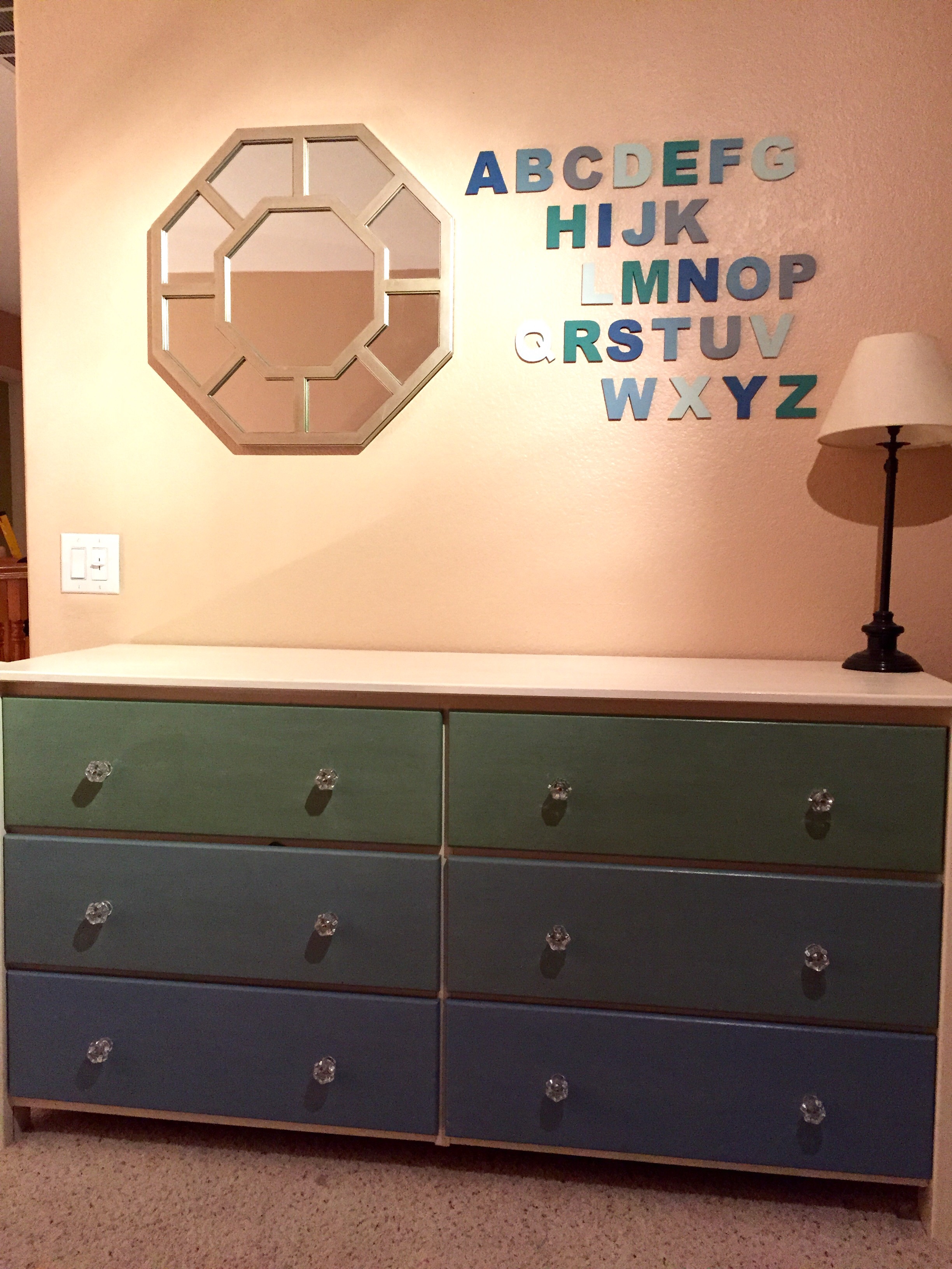 Other side of the room is the dresser, which will double as changing table. ABC wall and mirror are up on that side! Baby is sharing a room with my youngest stepson so there's not much room for anything else in the room (not pictured is his bunk bed, toy storage, and armoire- no closet in the room).