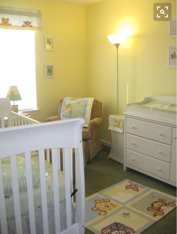 I really like this Winnie the Pooh theme. Soft yellow walls, white furniture and just a hint of pooh.