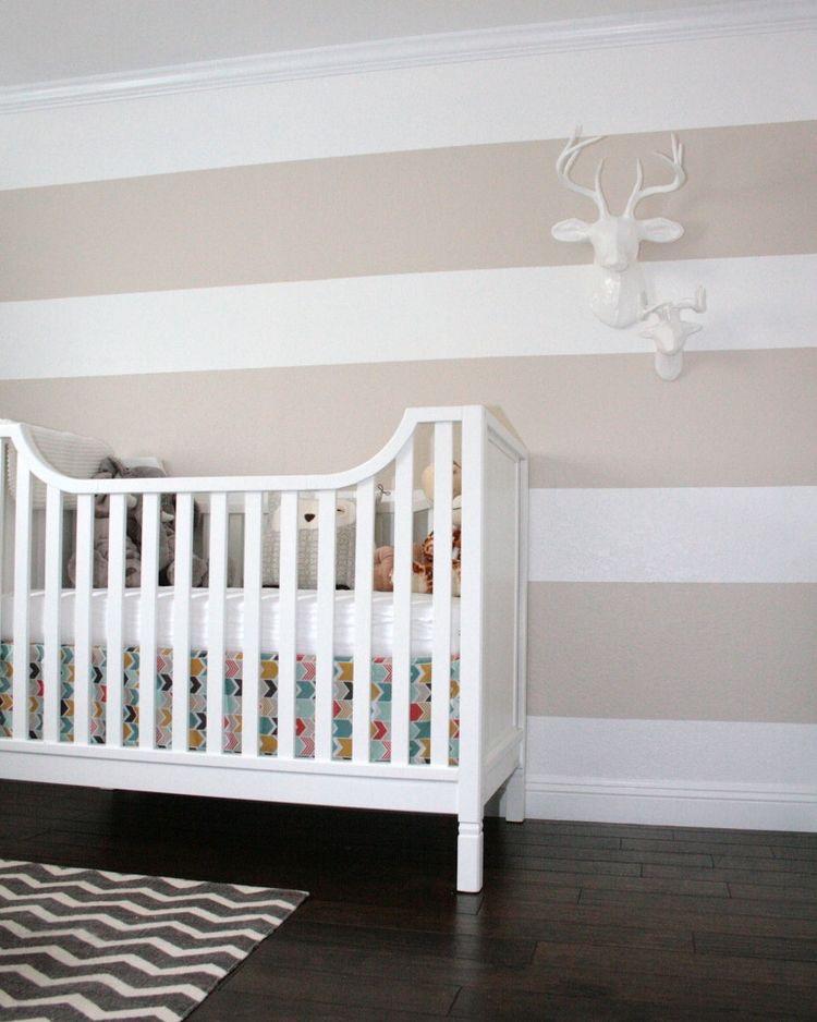 I want a pretty neutral nursery, whether it's boy or girl. If it's a girl, I'll add in some vintage flower prints on the wall or flowery crib sheets. If it's a boy, I'll add more bear/woodland animals. Our room is already painted tan, so the only change we'd make is white curtains and paint white stripes on the wall behind the crib.