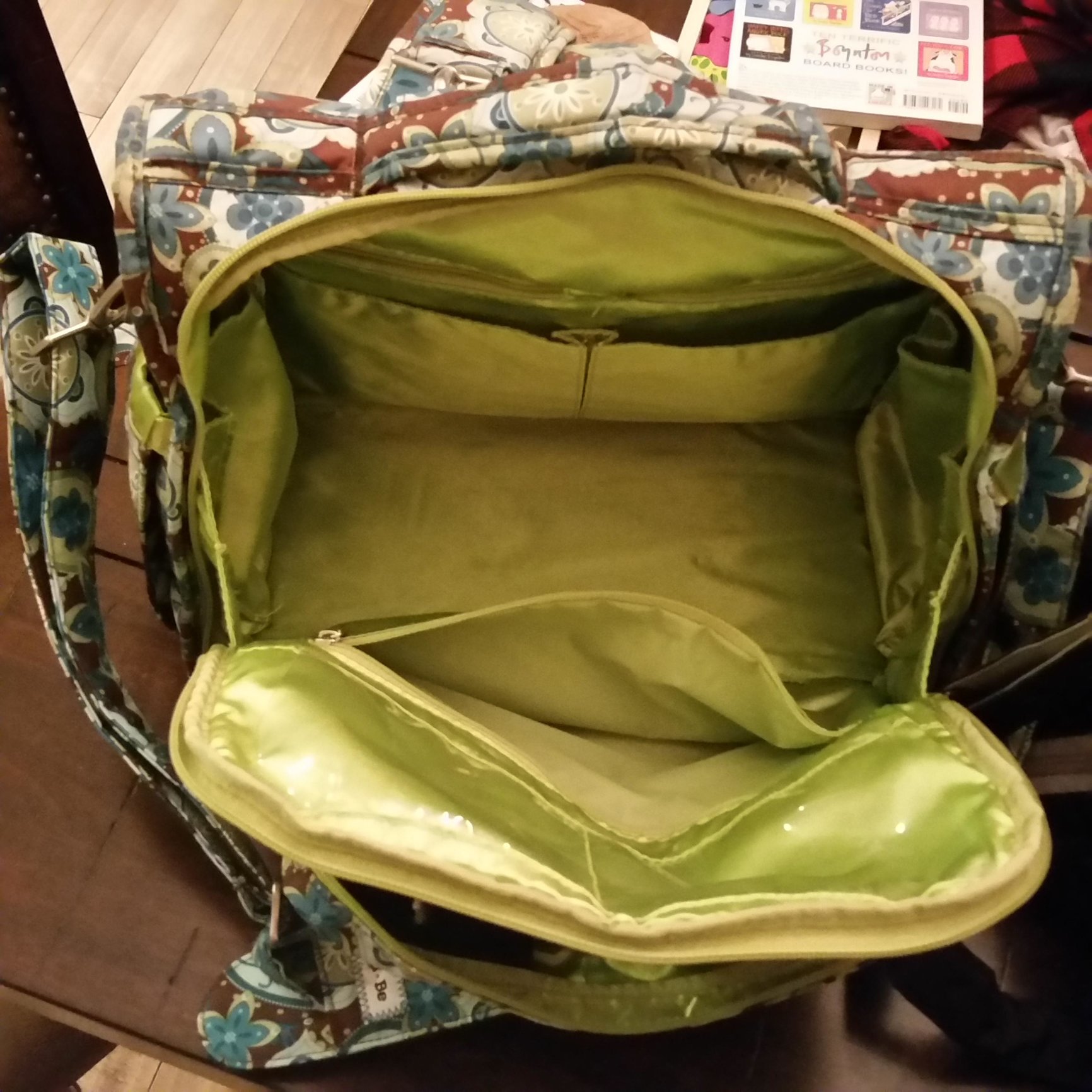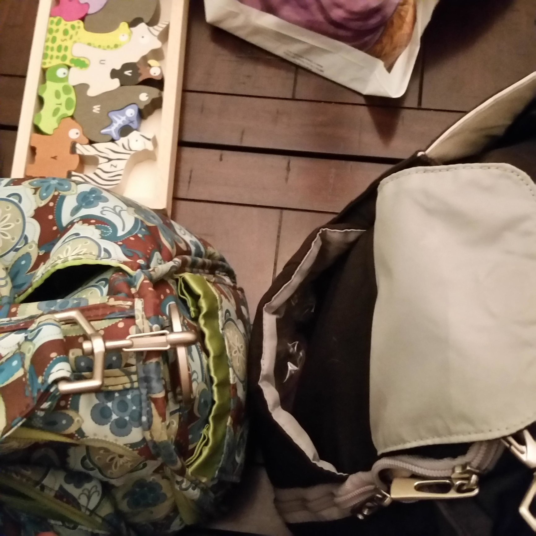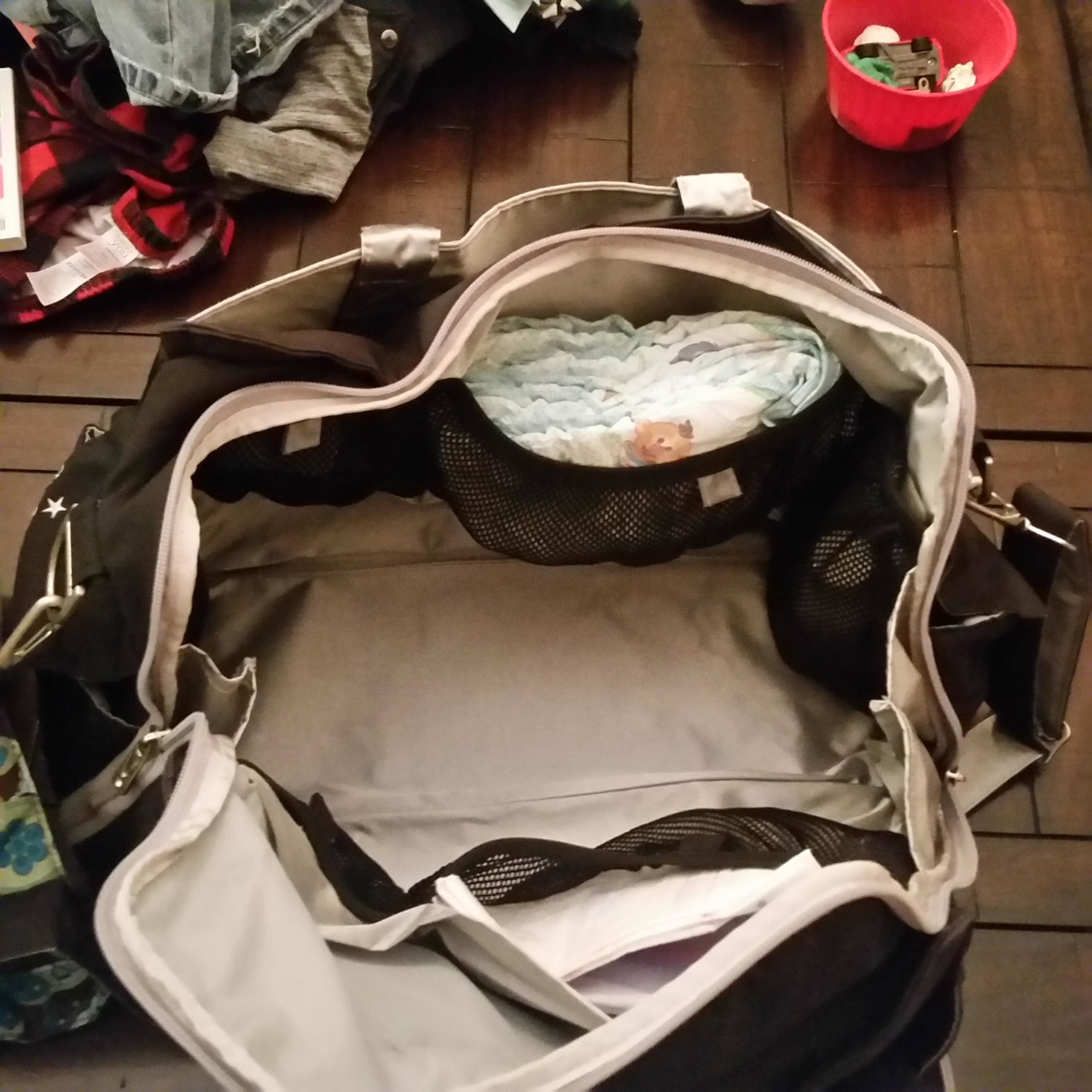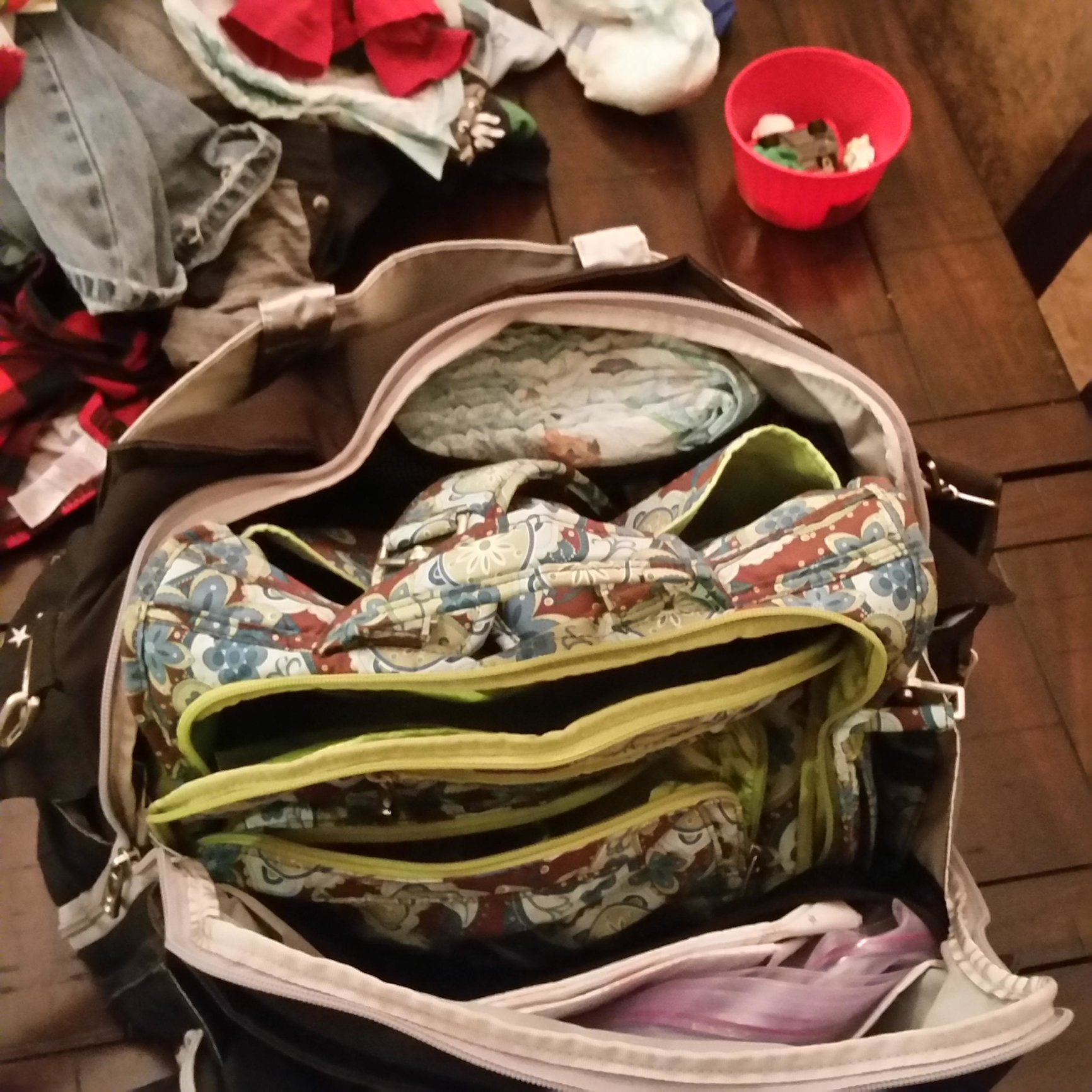 I usually carry a toy or two, change of clothes, 3 dipes, wet bag, wipes and snacks. You seriously don't need a giant bag for all that and there was plenty of room to add bottles if you FF and when LOs relfux was bad I always had a shirt for me (and an extra infinity scarf I used as a nursing cover).