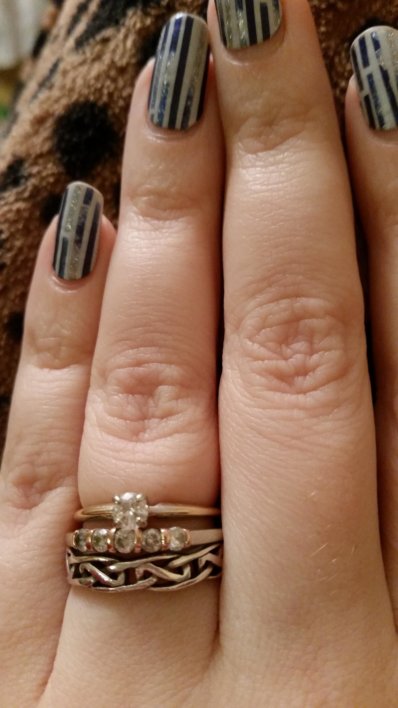 • Engagement ring, Celtic knot wedding band and rose gold and diamond band for our first Christmas married. Will be five years in April :)