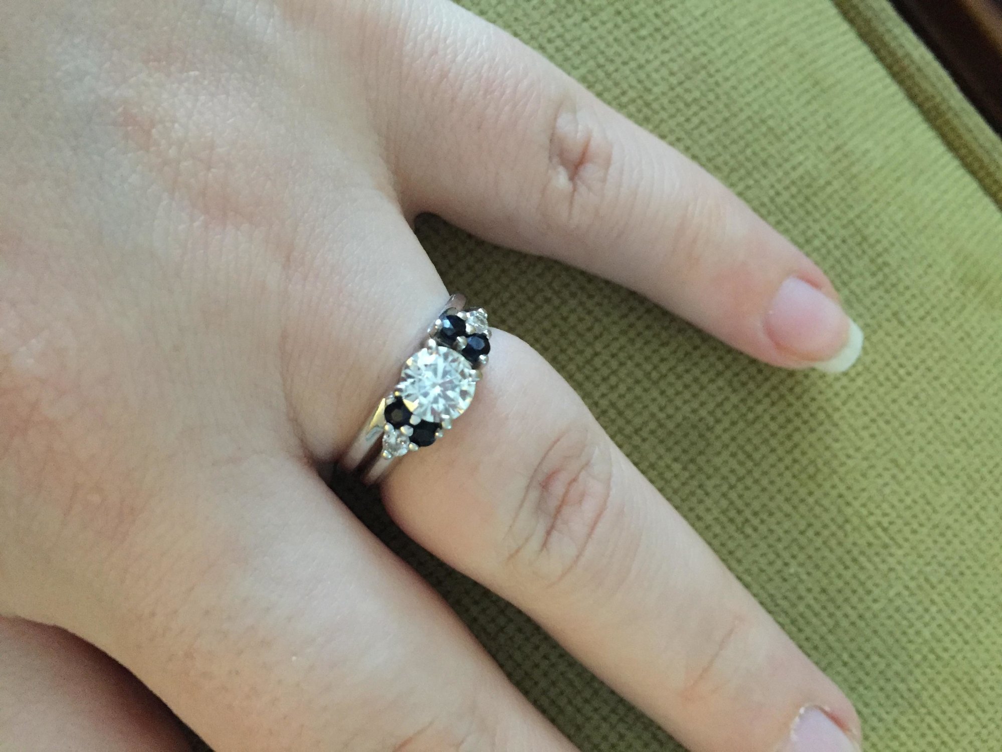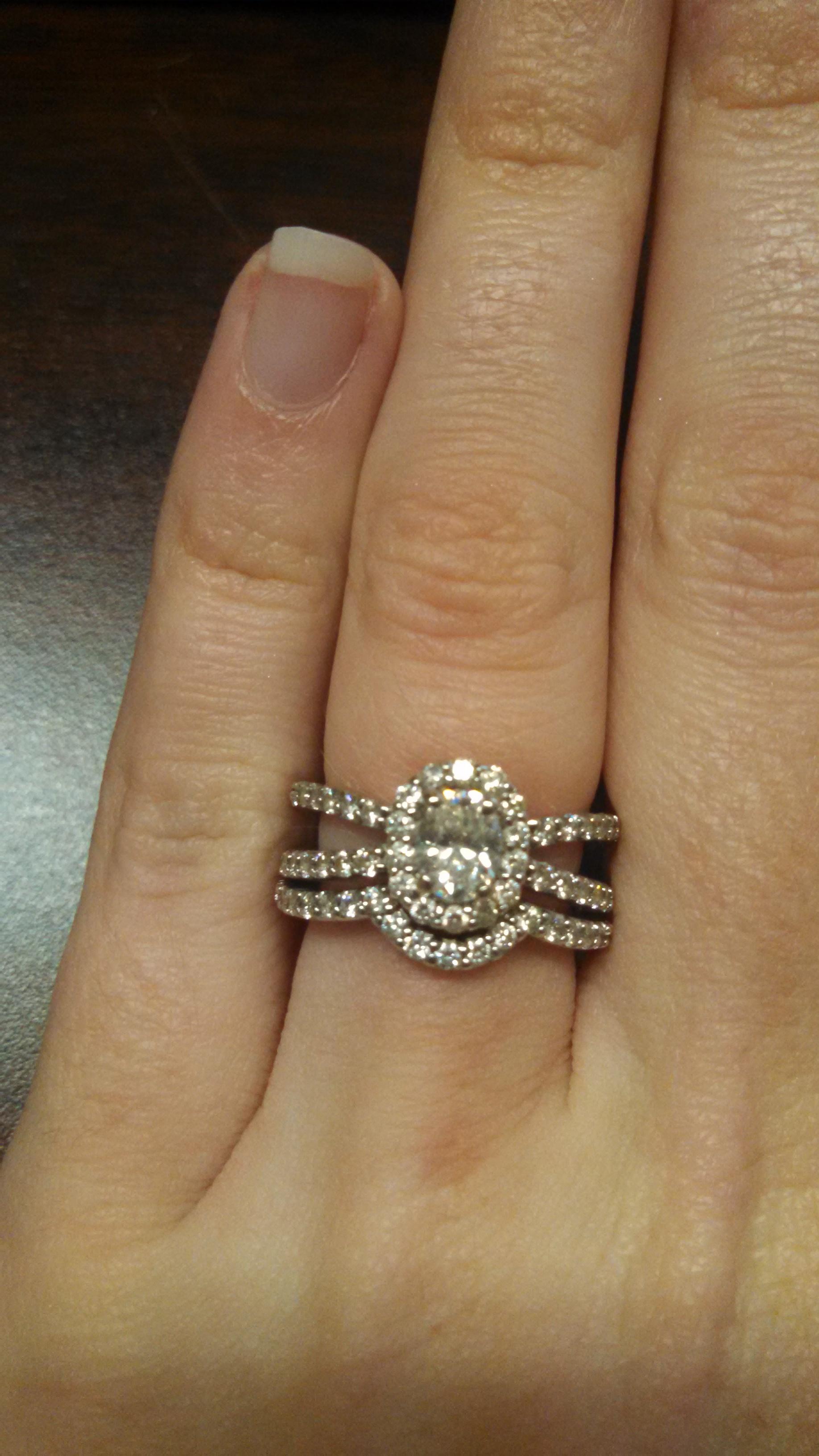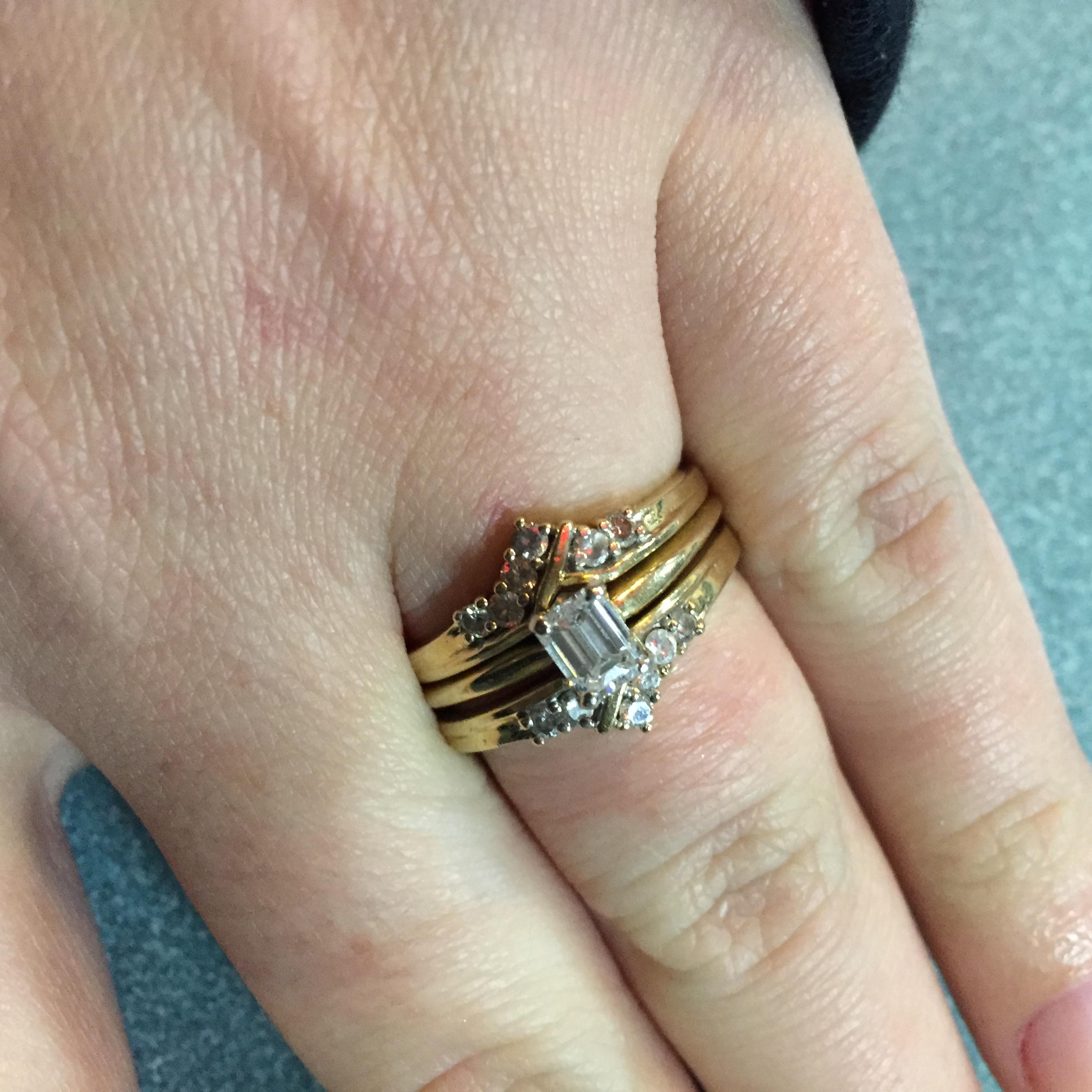 My husband picked out the engagement ring, and the wedding bands are like a ring jacket - the engagement ring can still slide out, yet they feel like they are soldered together when you wear them. It's nice because later in pregnancy when I am more swollen, my engagement ring at least fits because it is sized a little bigger ;)