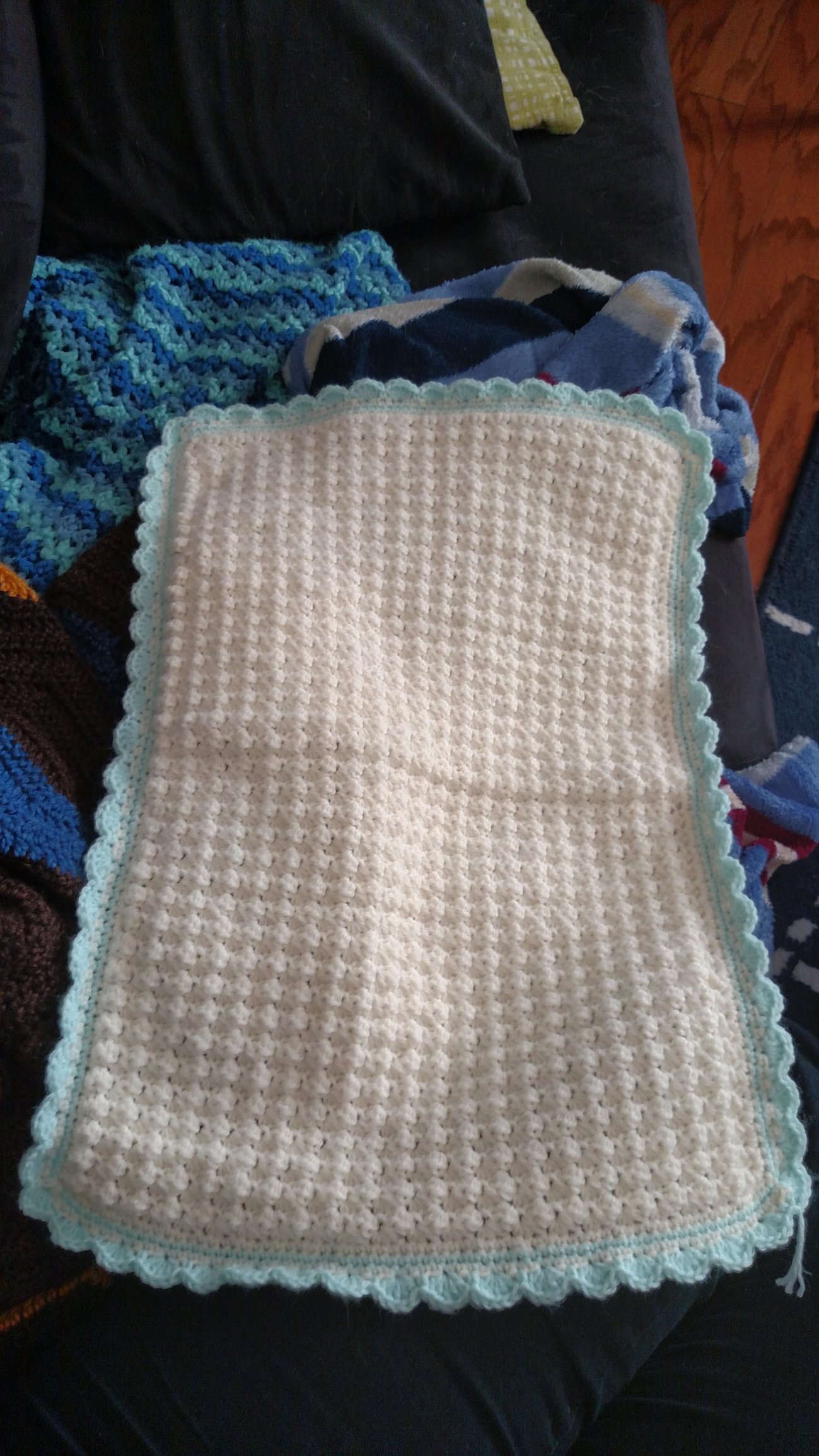 The only thing I've completed so far is a car seat sized blanket in white with a teal border. Here it is:
