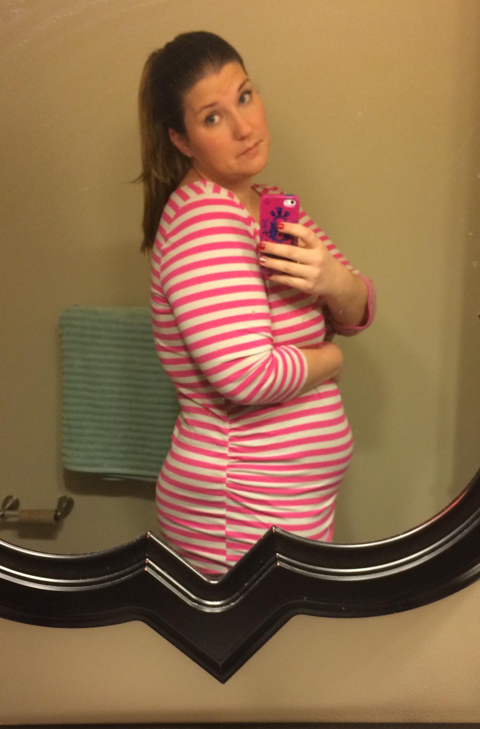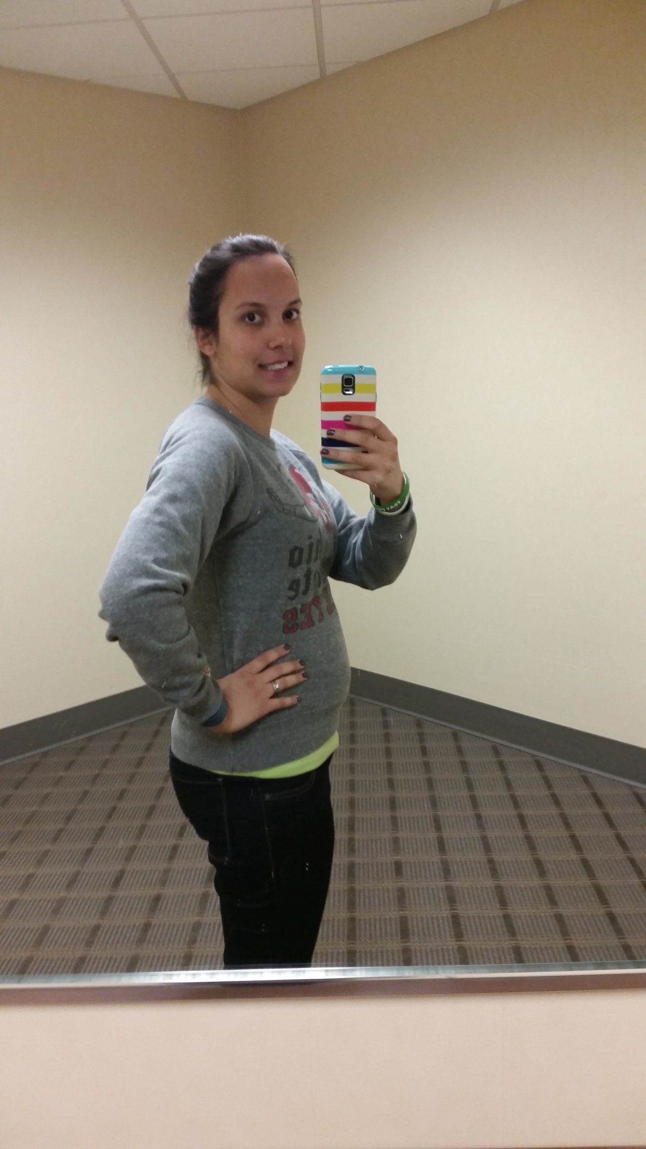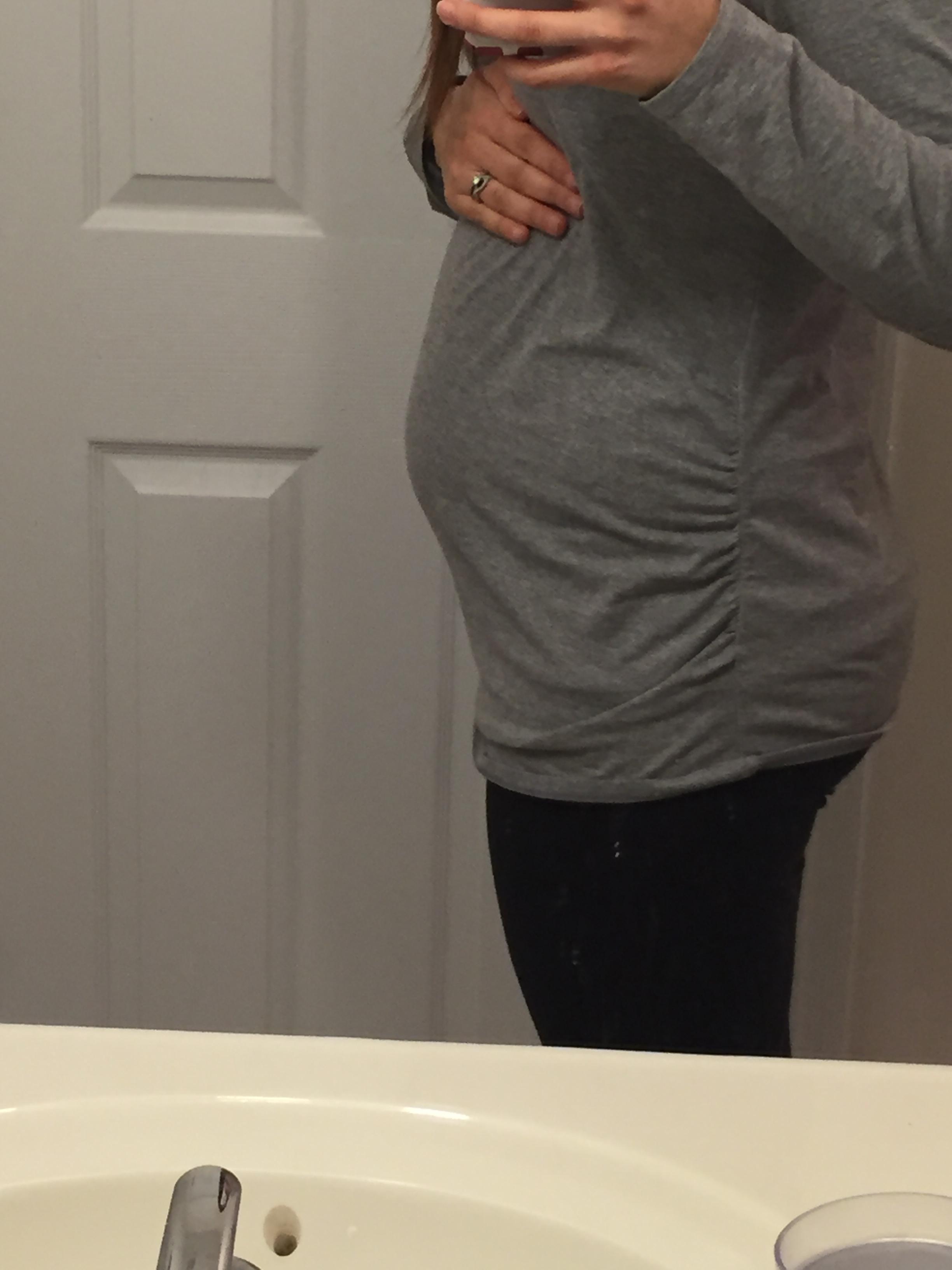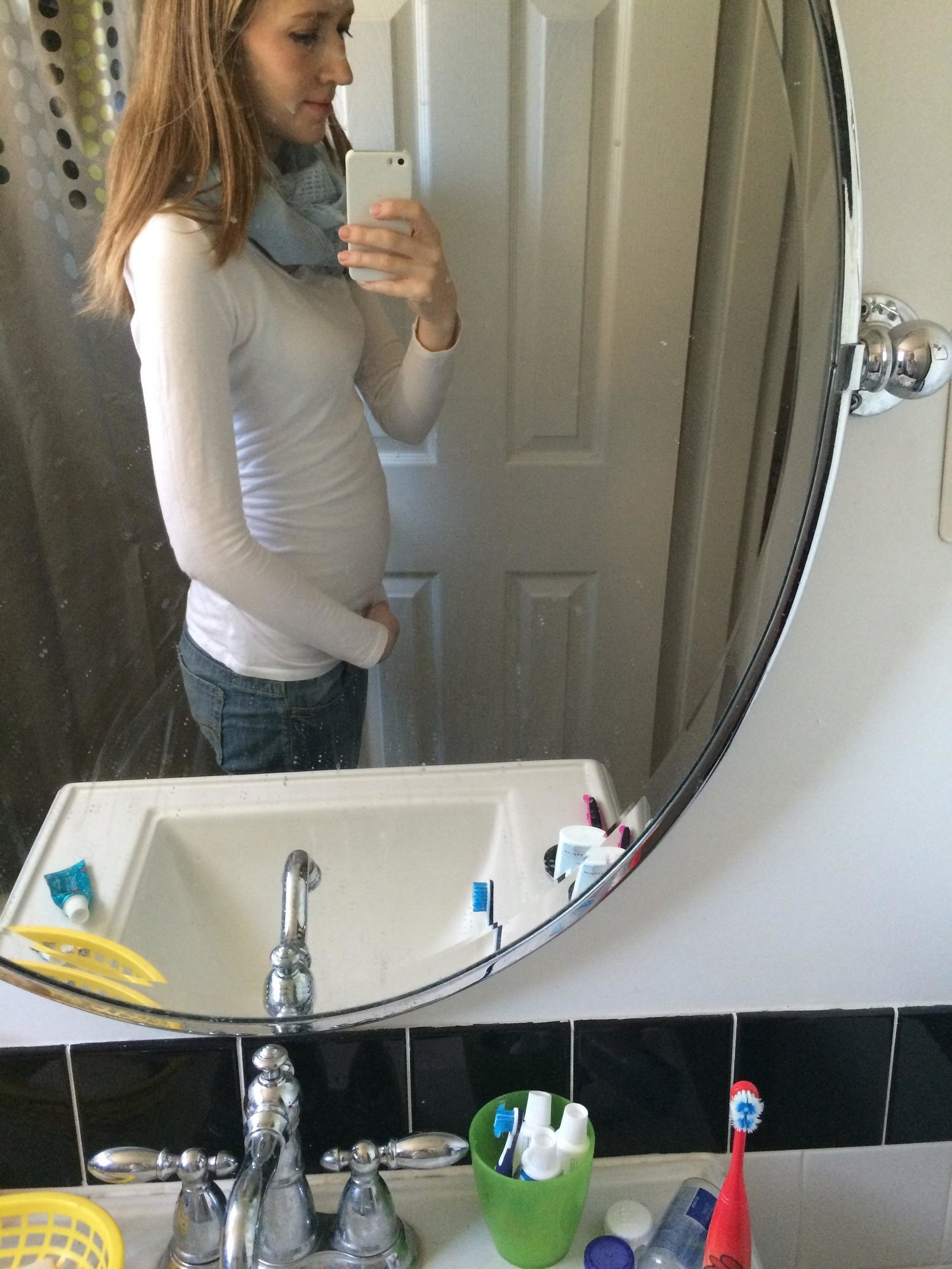 Wearing a loose top made this difficult, & this was the best I could get, lol. (Note: the walls were that colour when we moved in, I swear! It's going to be the nursery & new paint is going on this month..woo!) FTM 15 + 4