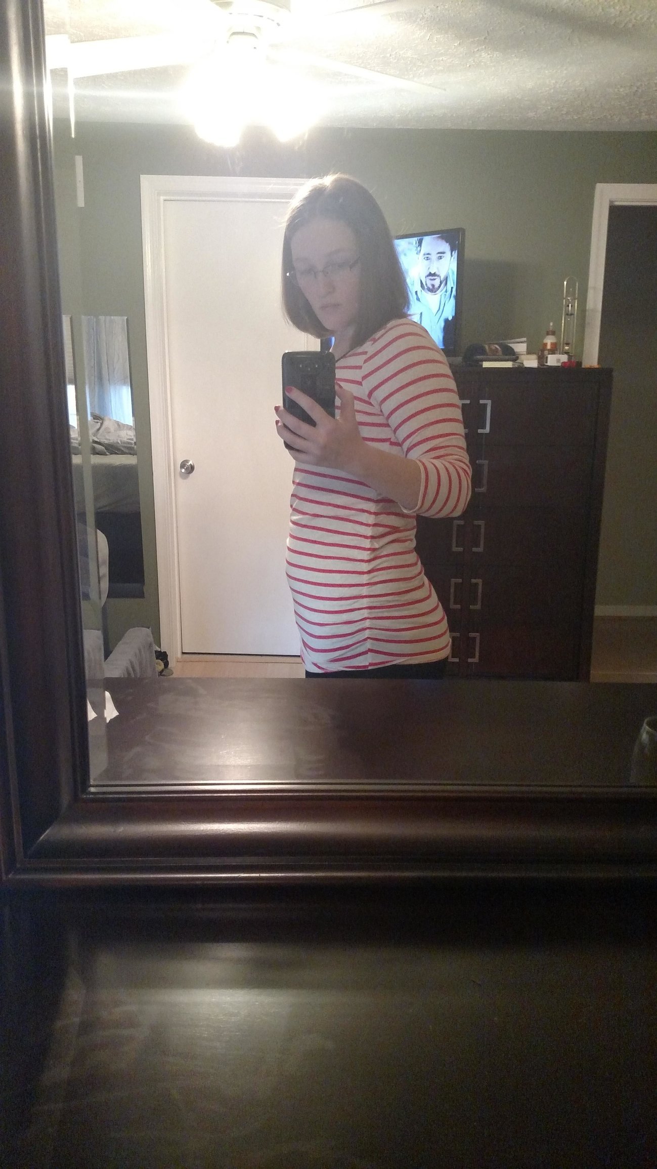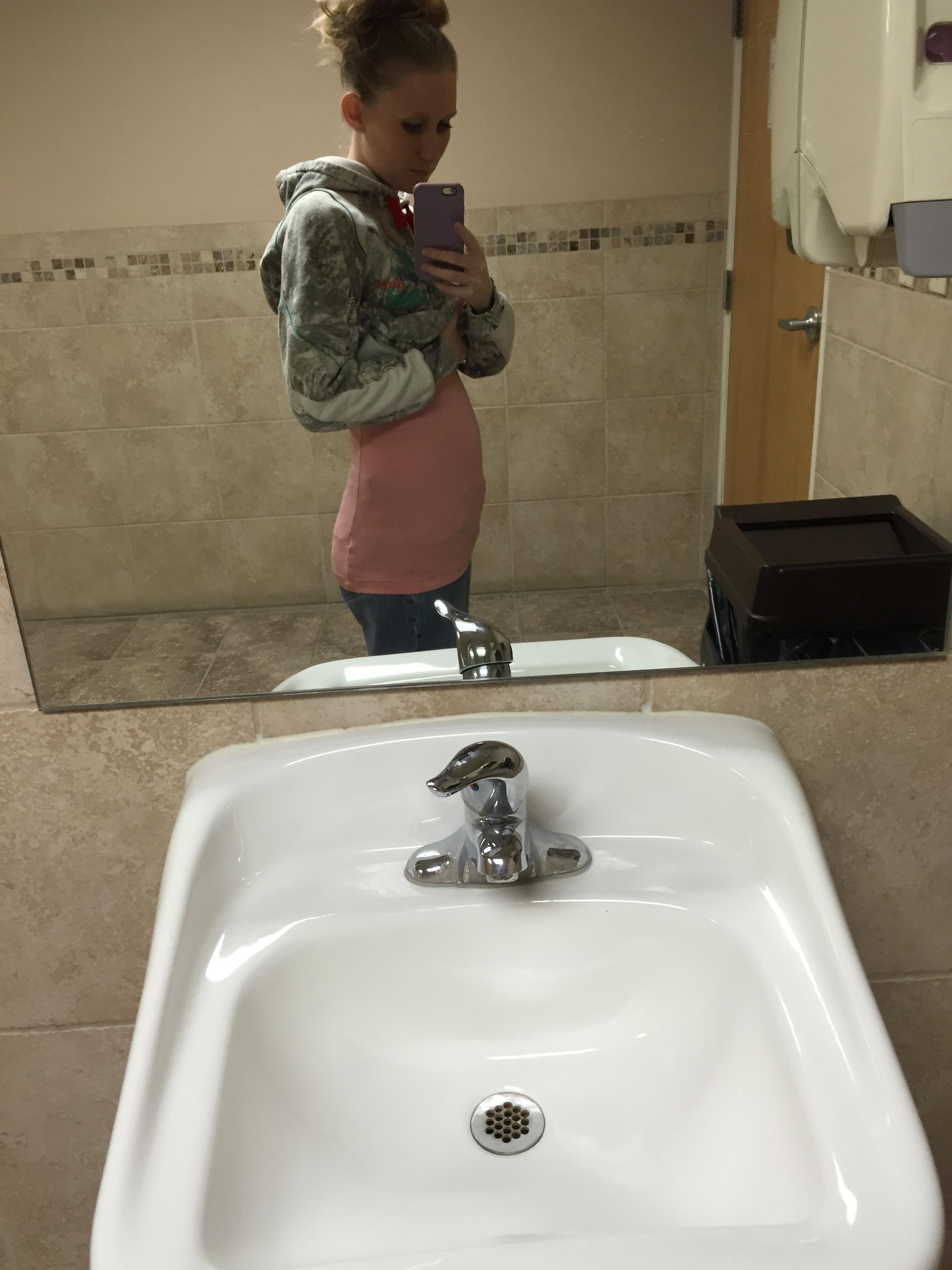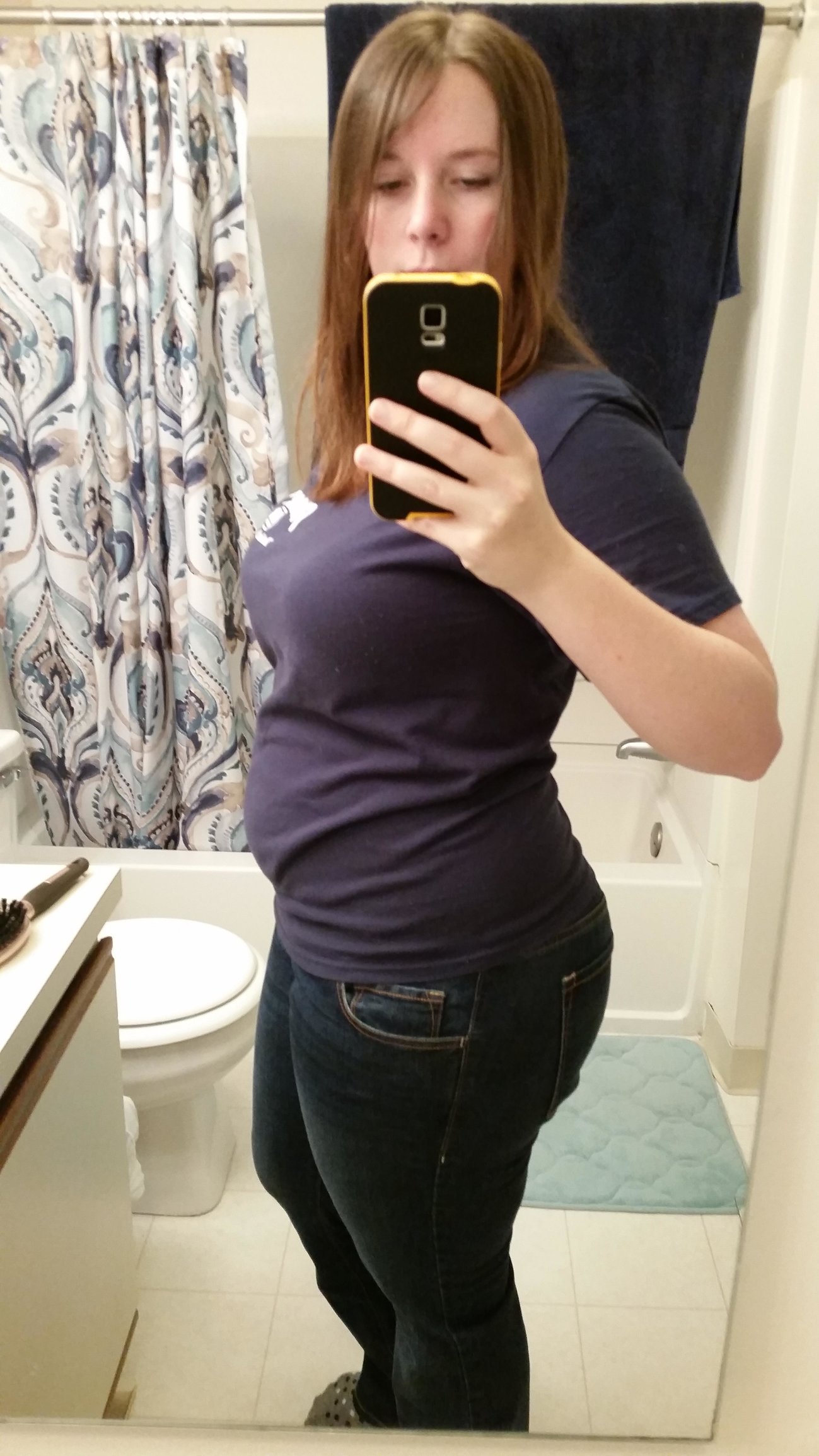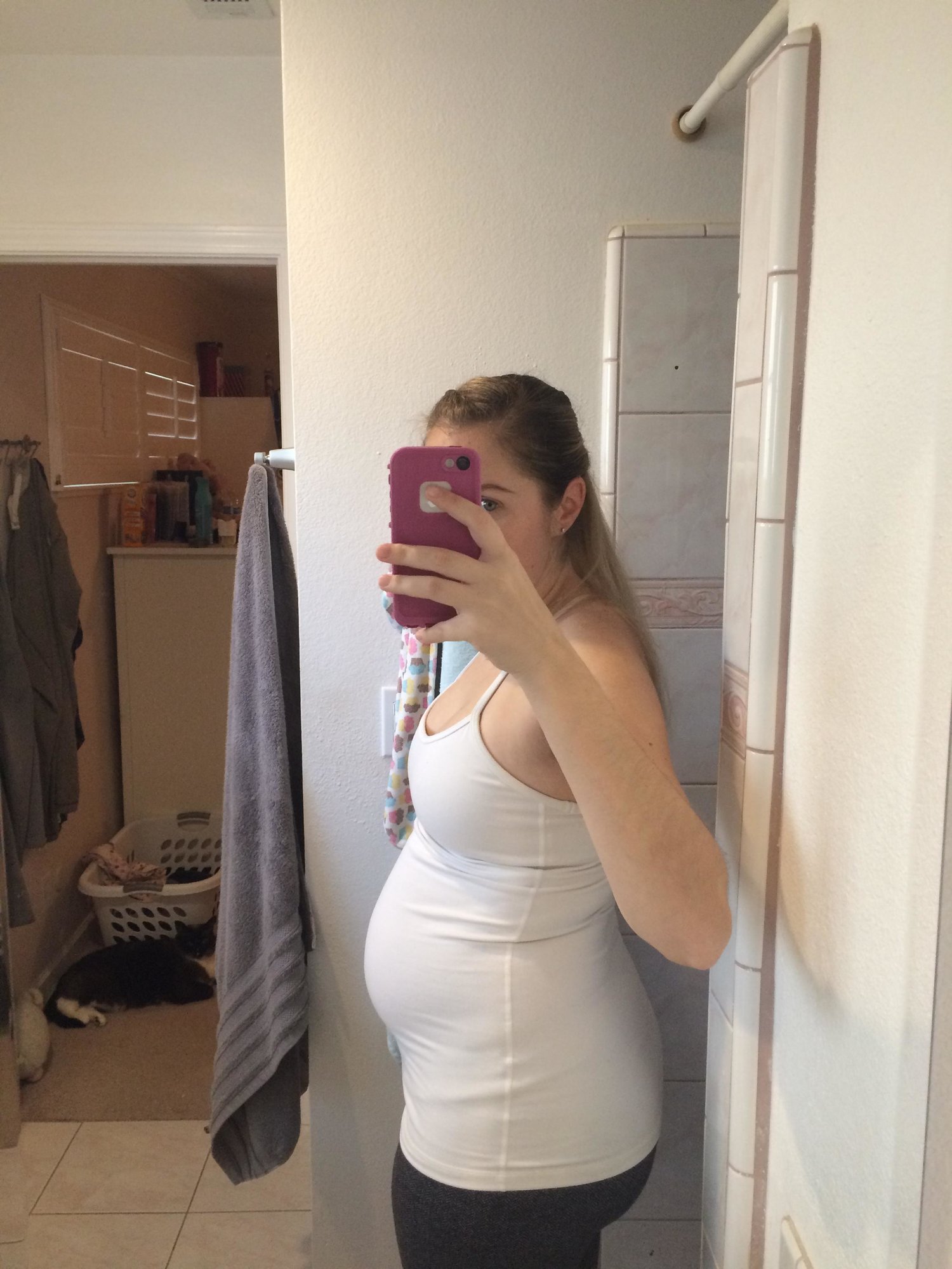 Wearing a loose top made this difficult, & this was the best I could get, lol. (Note: the walls were that colour when we moved in, I swear! It's going to be the nursery & new paint is going on this month..woo!) FTM 15 + 4