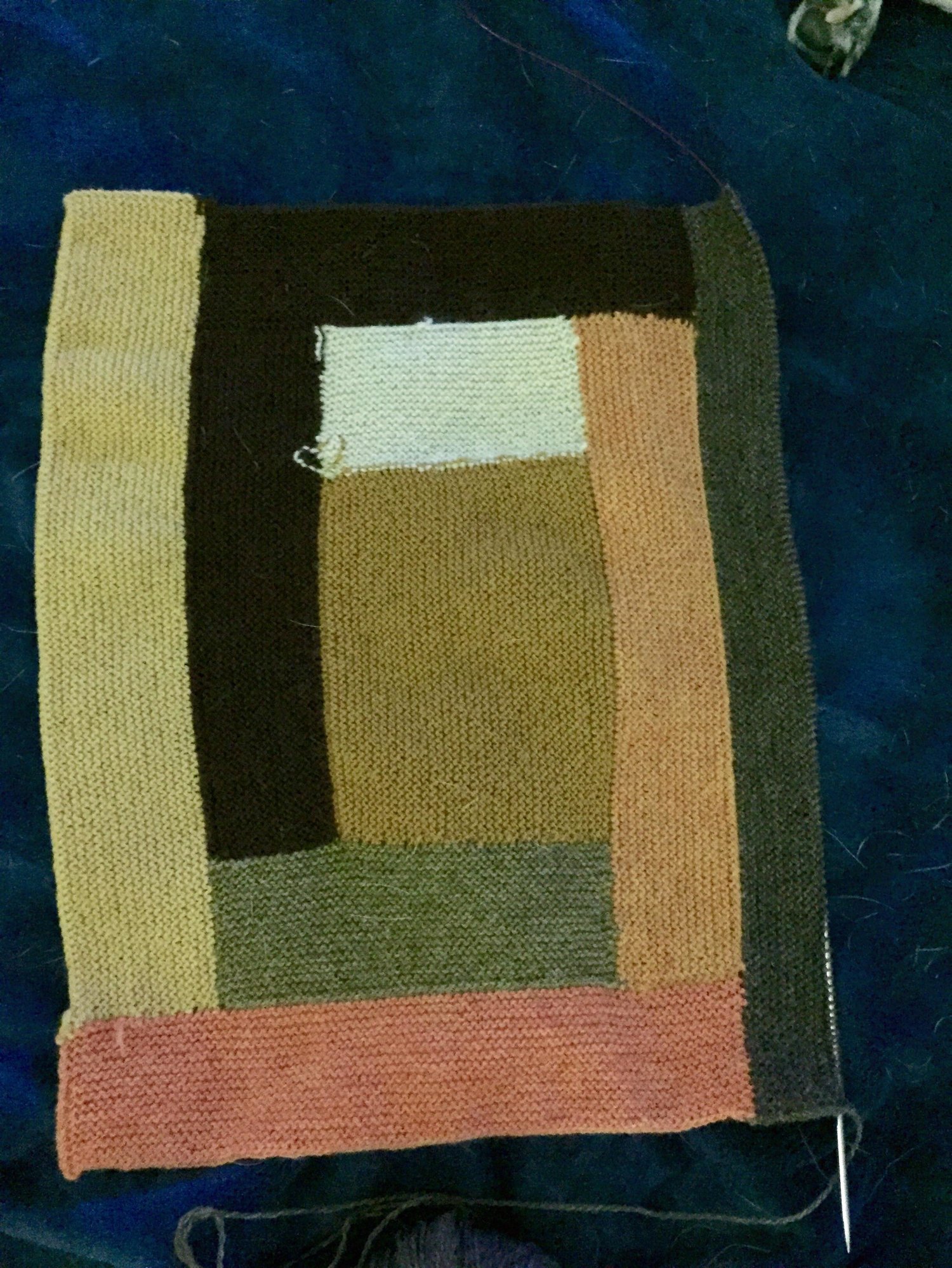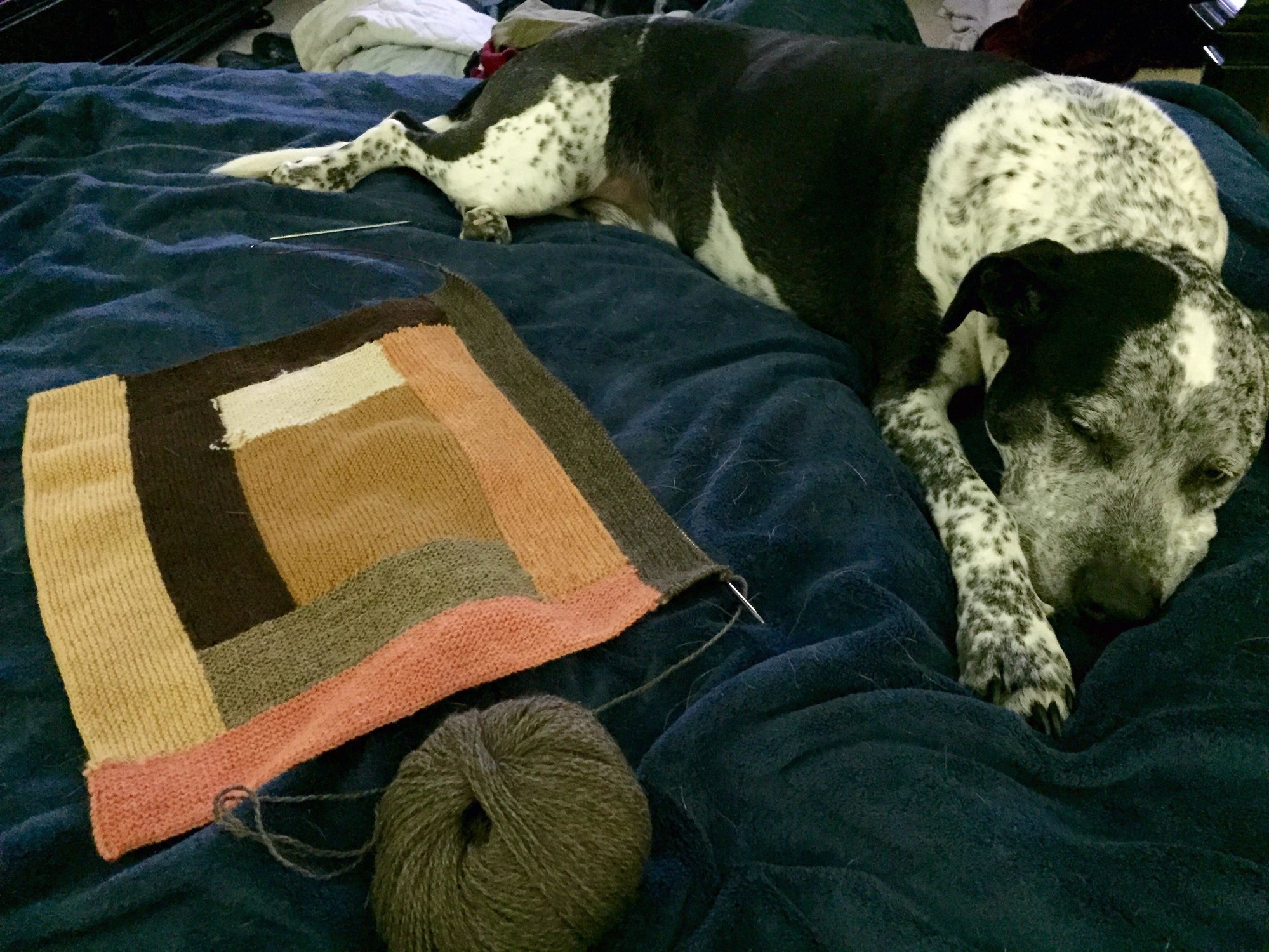 @sprocketsngadgets - It's actually much simpler than it looks! I can't seem to wrap my mind around colorwork, but this is just garter stitch stripes, and you're only working with 2 balls at a time and switching at the start of every other row. The only other skills involved are decreases (one double decrease every other row... that's the ridge you're seeing) and picking up stitches, which it looks like you're already a pro at. The trickiest part has been keeping two balls of yarn from rolling off my rapidly disappearing lap... otherwise, it's a nice, mindless knit that goes really well with Netflix.