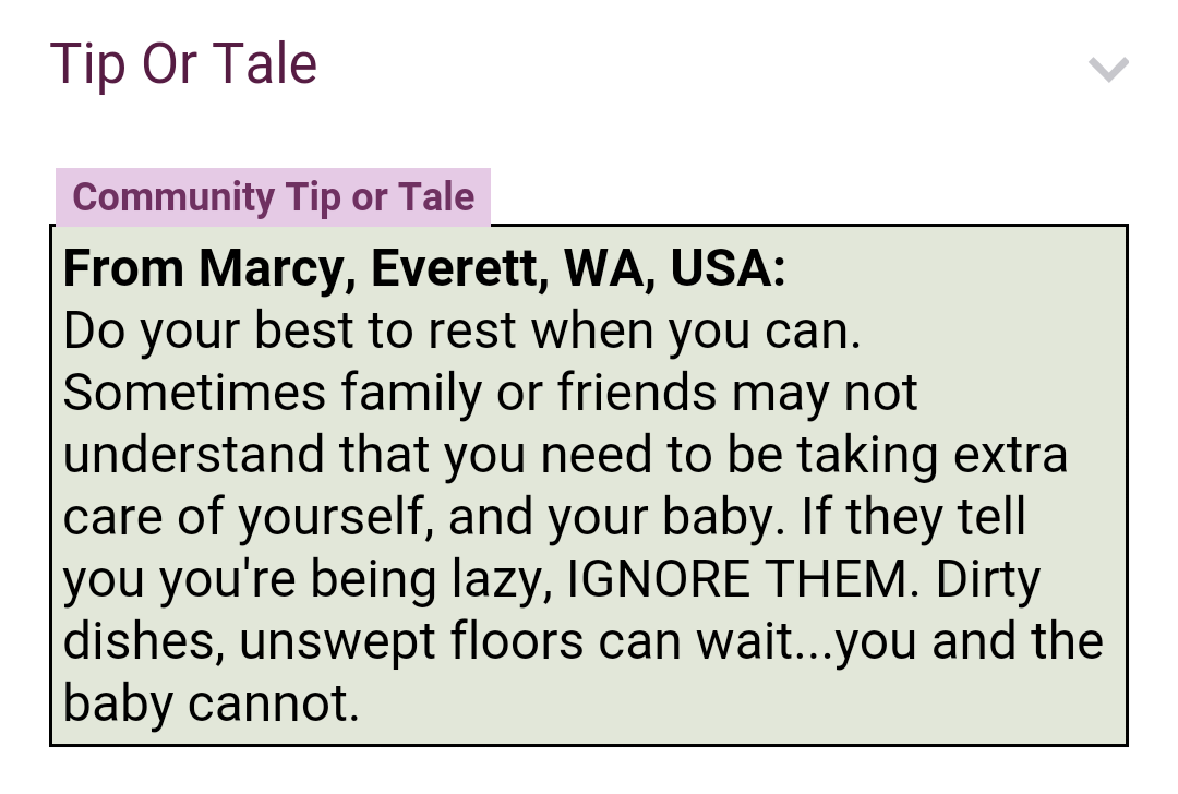 I wanted to share this daily tidbit from Monday that popped up on my Fertility Friend pregnancy tracker. To be honest, I'm generally a messy person. I love organization, but I struggle to actually do it. This includes dishes, laundry, and typical household cleaning regimens (DH is a neat freak). I showed this to him, and said "See!" Just wanted to share!