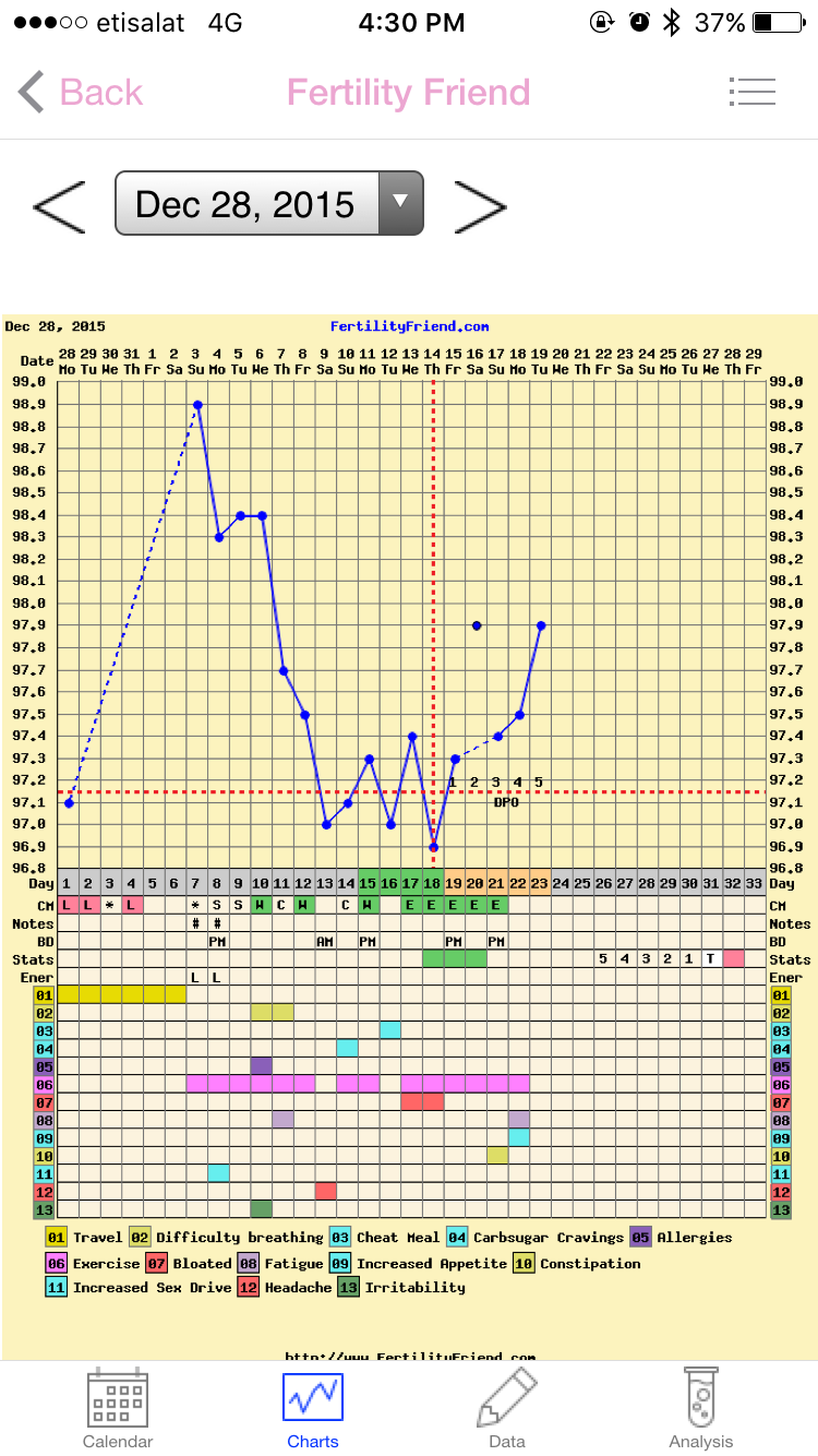 R/R/CS: So FF has put me at cross hairs a day earlier than I would have thought (CD 14) and they are solid, not dotted. All the other signs are pointing to the next day (CD 15), and I had a significant temp rise on CD 16 which makes me think that today is 2 DPO, 3 DPO. What do you guys think looking at it? Have any of you over-ridden intellectually what FF is telling you what your O date is?