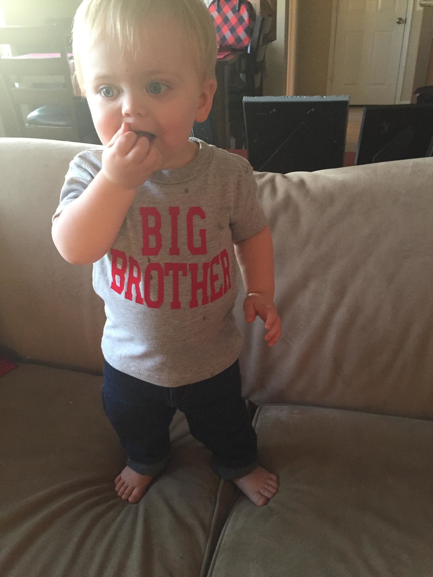 I took a wondfo test on a Saturday morning and got a very faint positive. So I took a digital test to confirm, but it malfunctioned and just showed the clock forever. So I packed up the toddler and picked up some breakfast and bought an armful of expensive pregnancy tests. I took a first response and got a positive. Then I brought LO#1 into the room with a sibling shirt on. And we all are breakfast. The end.