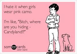 OHMYGOD I love this. Also, pink camouflage. Wtf are you trying to blend into? Wearing camo doesn't make you country, living in the country, doing chores, going hunting, gutting animals, etc. make you country. True rednecks don't give a shit what you wear as long as the fire is hot and the beer is cold (and they're even willing to negotiate on that).