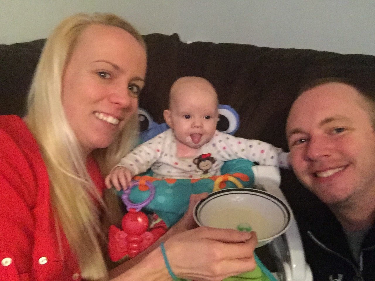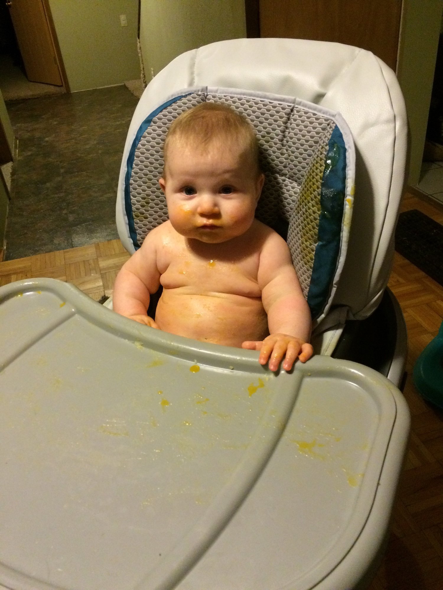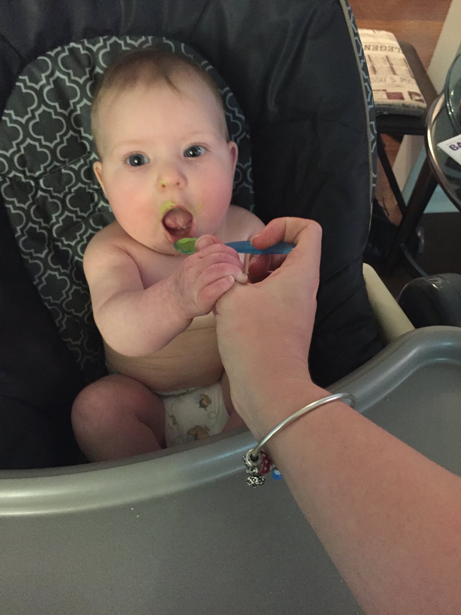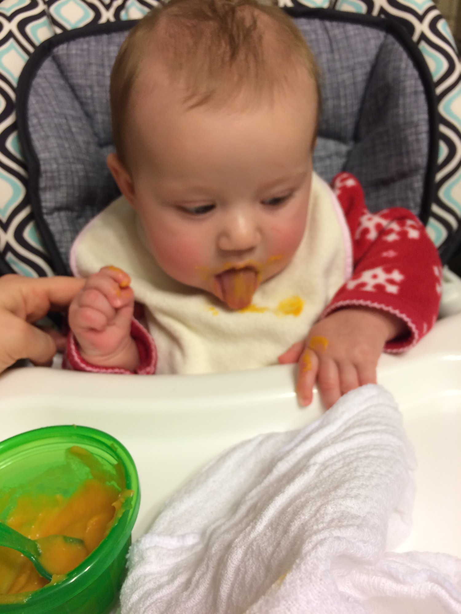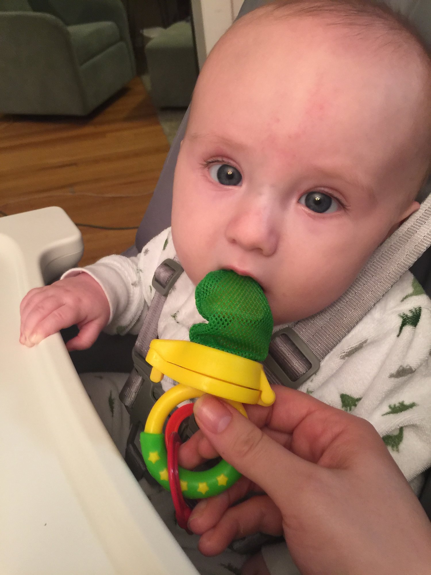 We tried solids at four months and he wasn't ready, so we just started introducing them again a few days ago. He went crazy over oranges!
