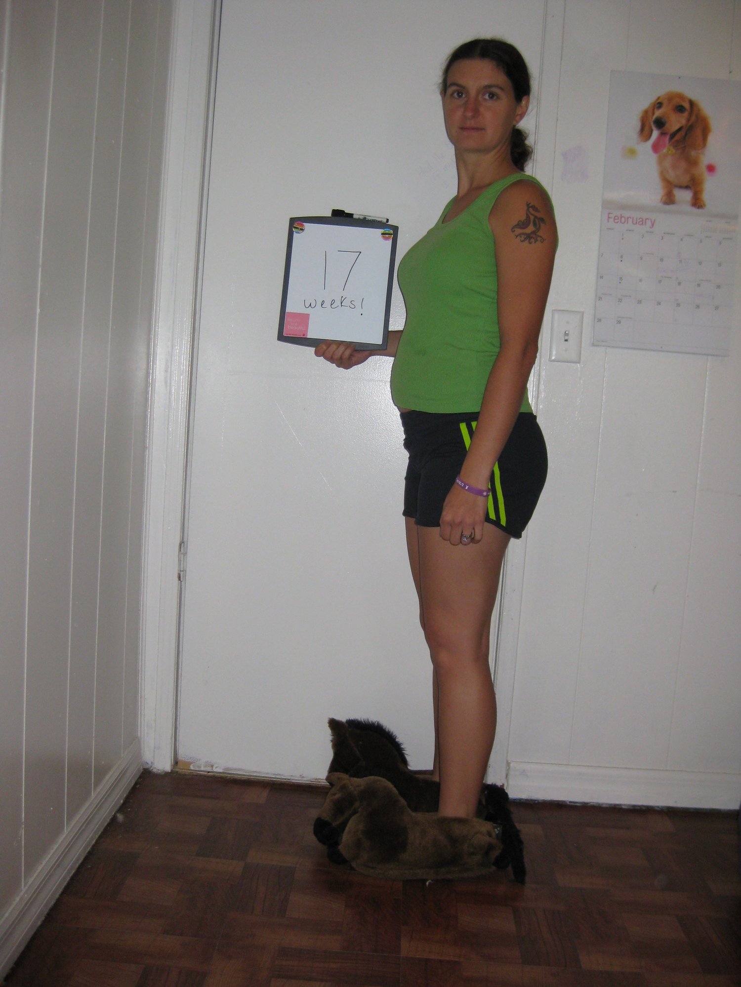Here's 17+2. My shirt that I wear for all of these is already gapping. Whoops! And yes, the floor was cold and I love my horsey slippers - thanks for asking!