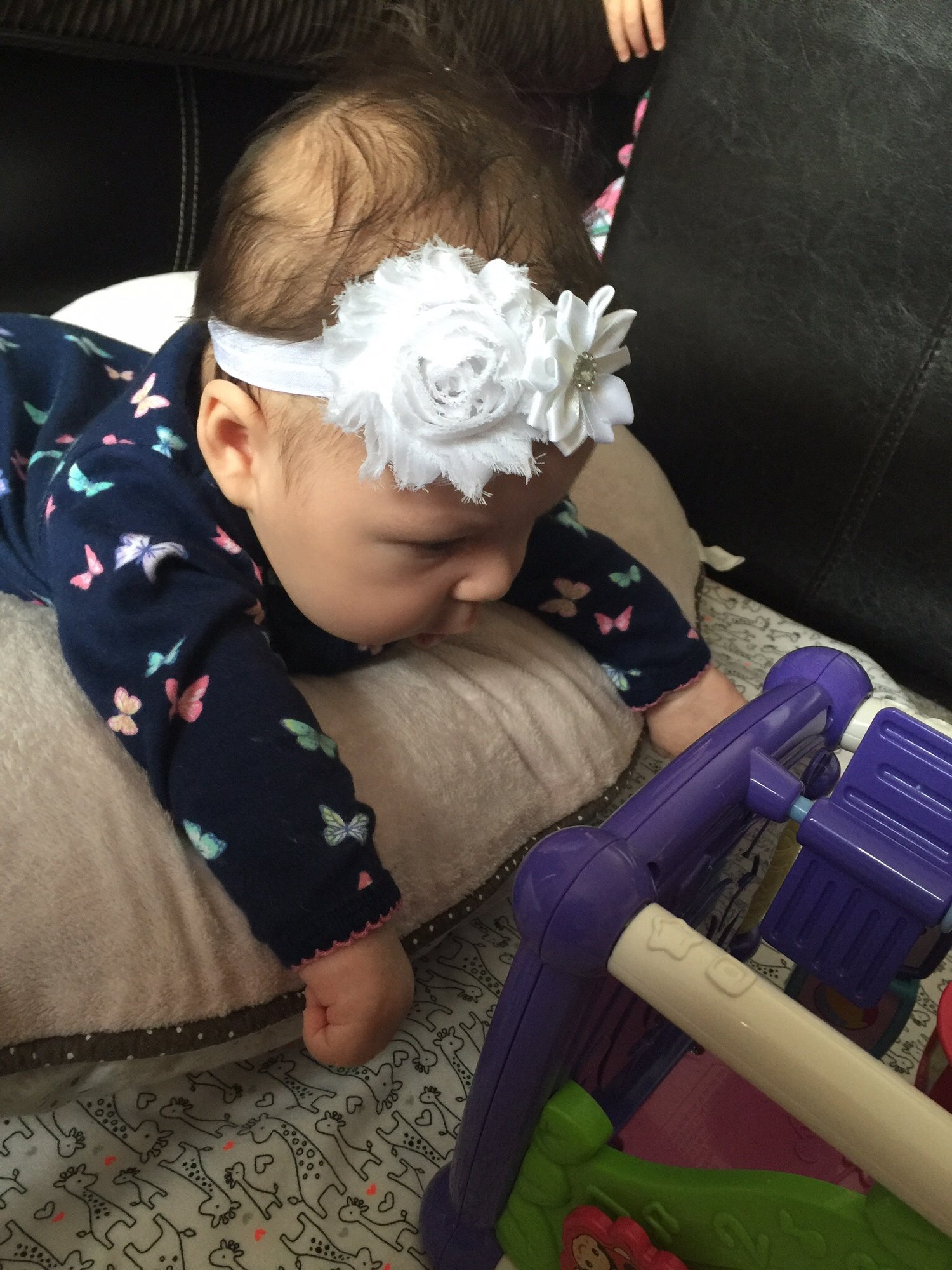 Now for the question, how do you do tummy time with a baby who never really liked it in the first place and who can now roll onto her back to get out of it? She is pushing up onto her elbows during tummy time, but can only push up through one hand at a time. DD1 was this age about a decade ago and I just can't recall what I did about tummy time at this stage. Not to mention the recommendations have probably changed anyways. Anywho, thoughts and advice would be appreciated. Thanks!