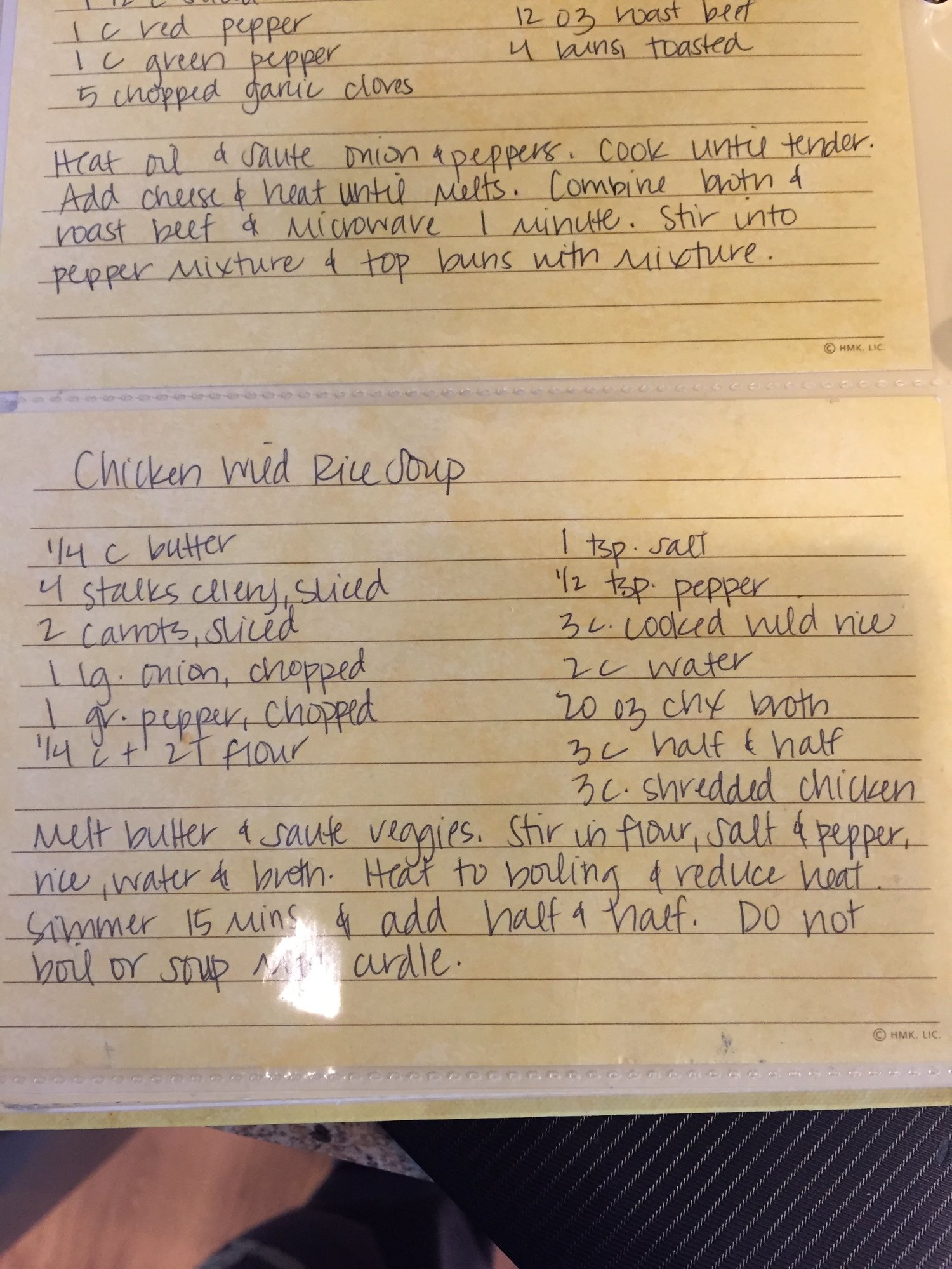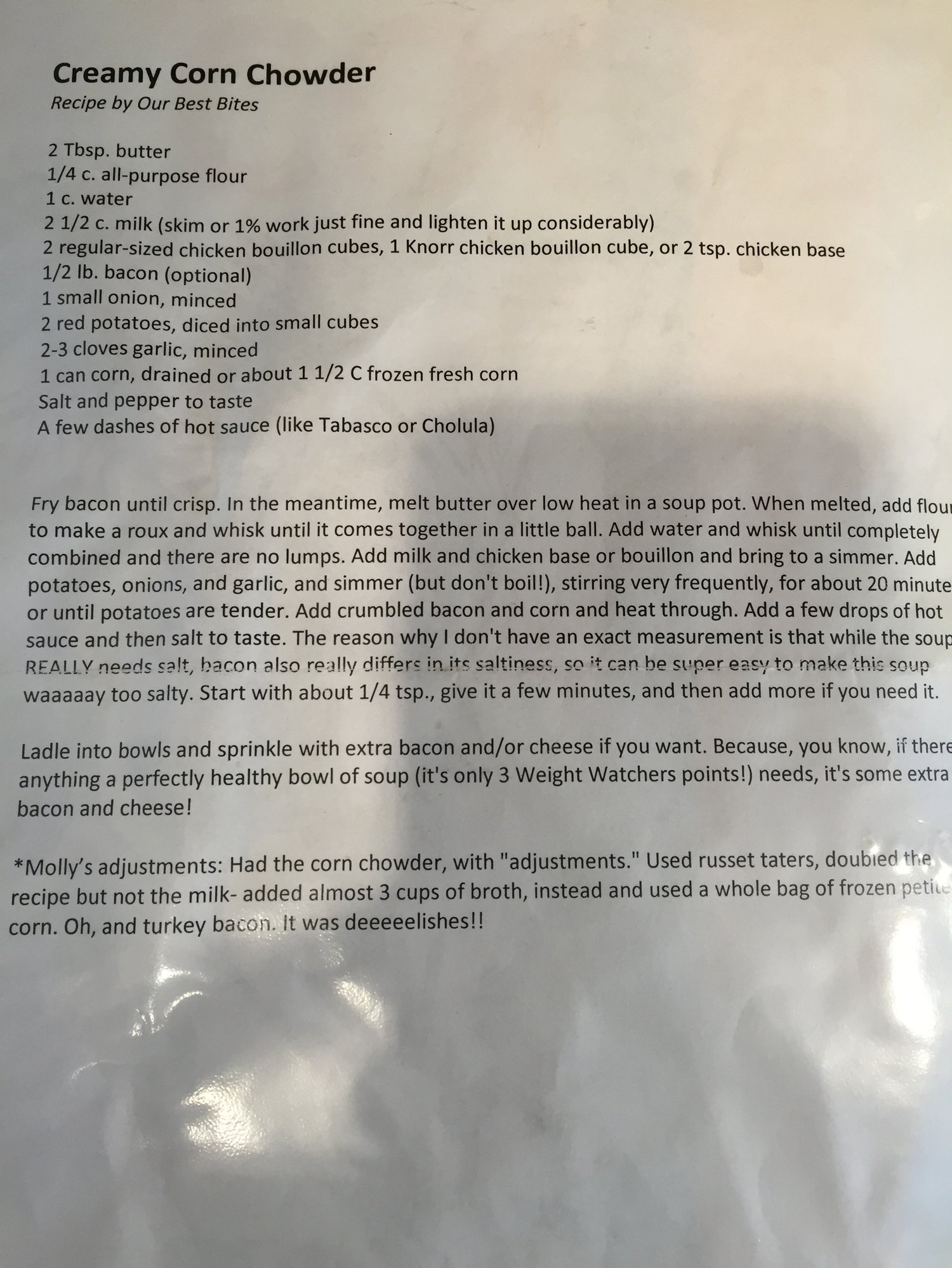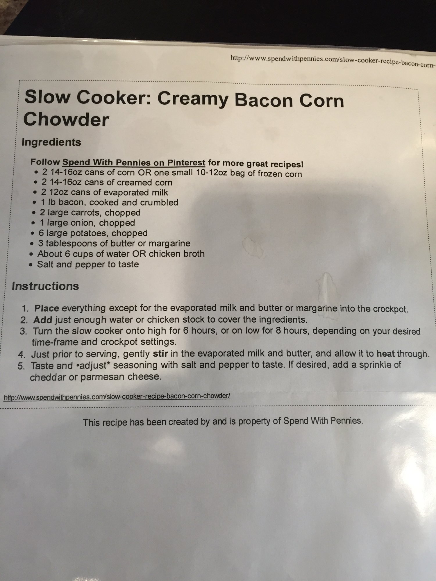 Crock pot – 6 hours cooking time, on low- 2 boneless, skinless chicken breasts, thawed (I use 3 chicken breasts and it makes a more meaty soup, it’s up to you) - 1 can whole kernel sweet corn, undrained - 1 can black beans, drained and rinsed - 1 can Rotel, spice level of your choice – I usually use Rotel Original - 1 packet Hidden Valley Ranch Dressing dry mix - 1 tbsp cumin seed - 1 tsp chili powder - 1 tsp onion powder - 2 green peppers, chopped finely - 1 8oz block of plain cream cheese (you can use light if you want to be healthy, but who does that?) ____________________________________In a separate bowl, combine the corn, black beans, rotel, dry mix, spices and peppers, stirring to combine the spices with the liquid and vegetables. In the bottom of the crock pot, place the chicken breasts and pour the mixture over the top of the chicken. Place the cream cheese on top of the mixture, but do not stir it in, just set it on top. Turn the crock pot on low for 6 hours cooking time. At the end of the 6 hours, pull the chicken out and shred it with two forks. Once complete, stir the chicken into the soup, making sure the cream cheese is stirred in evenly also. Serves 6-8, though you probably won’t want to share. ETA Formatting, stupid app