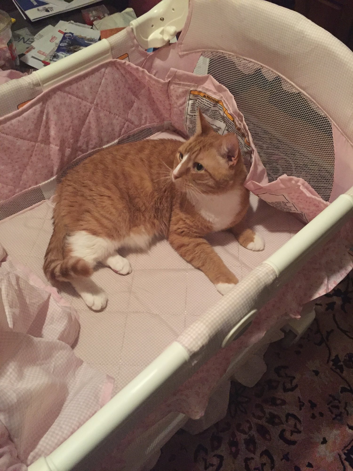 I was HOPING he'd hate it and jump out. Instead he thinks we have gotten him a new bed. Curled up and took a nap! (BTW We've since replaced the rod that's missing in this photo).
