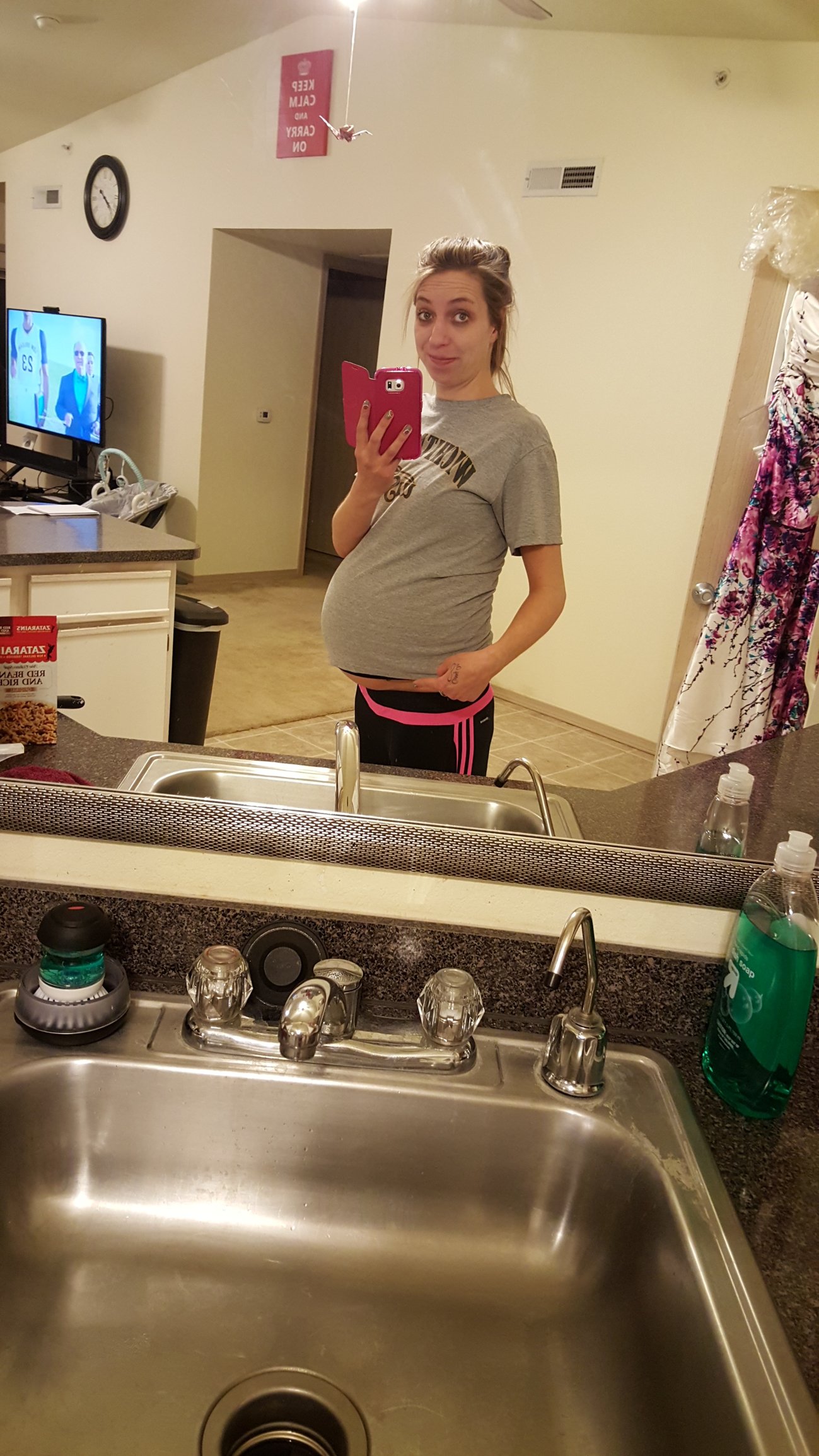 36 weeks. T-shirts officially do not stay in position to cover the belly anymore.