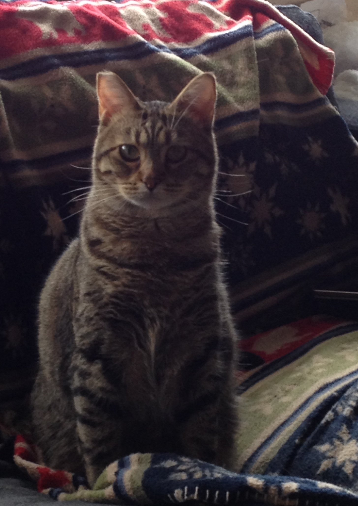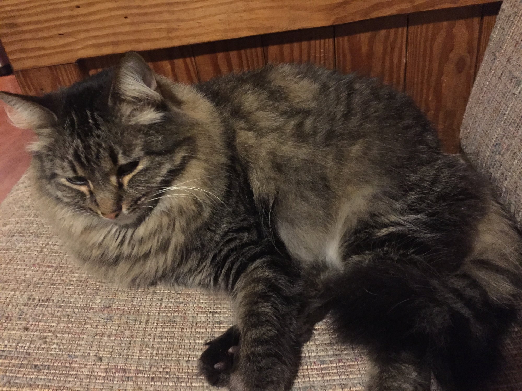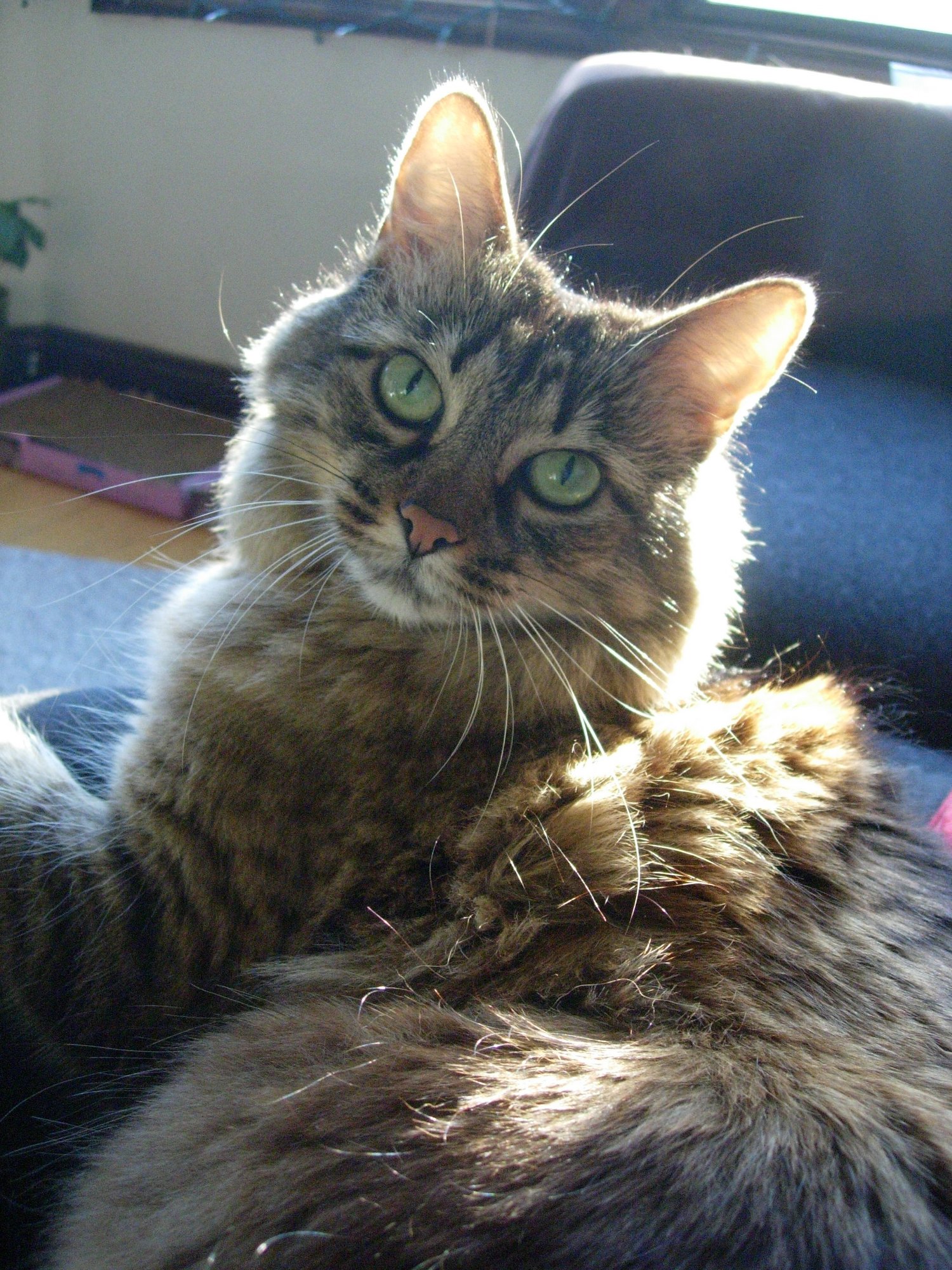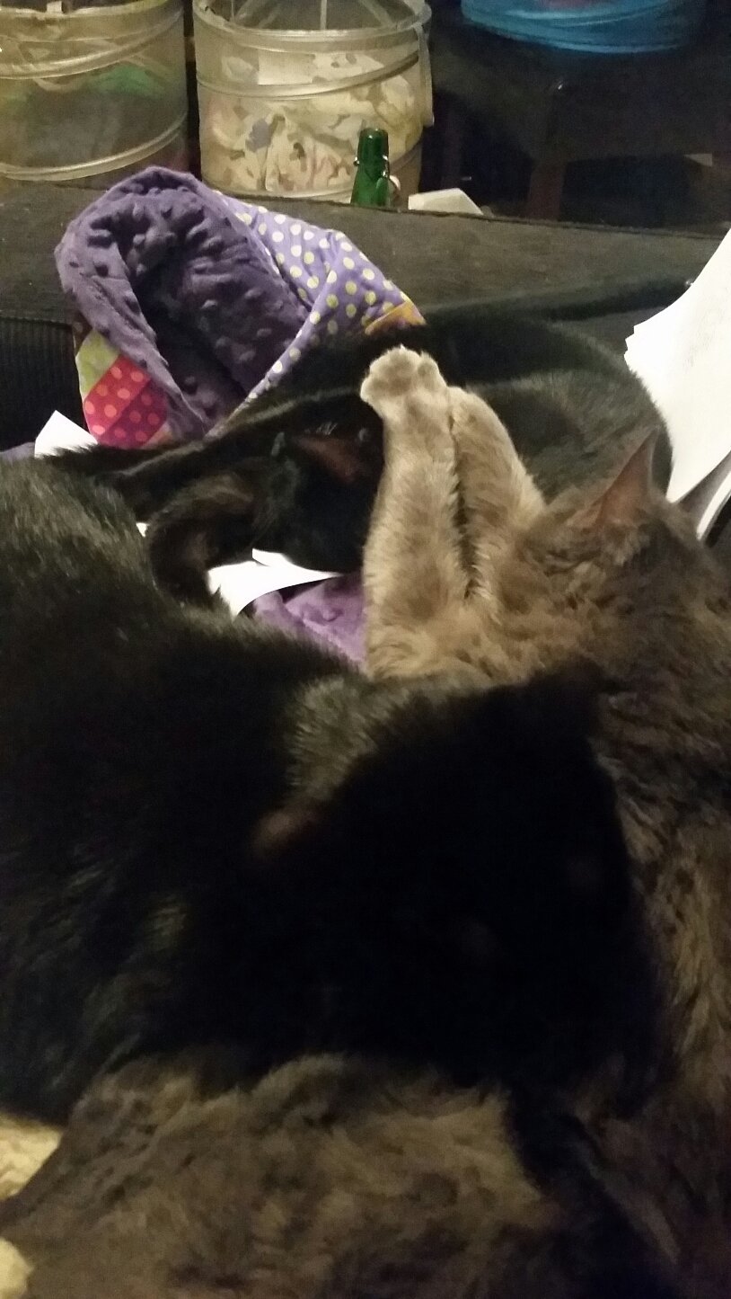 my three cats: Nicodemus, the gray cat, is 17. The black cat closest to the camera on Nicodemus's back is Cocoa, 2 years. The black cat curled up under nicodemus's front paws is Smudge, 11 months.