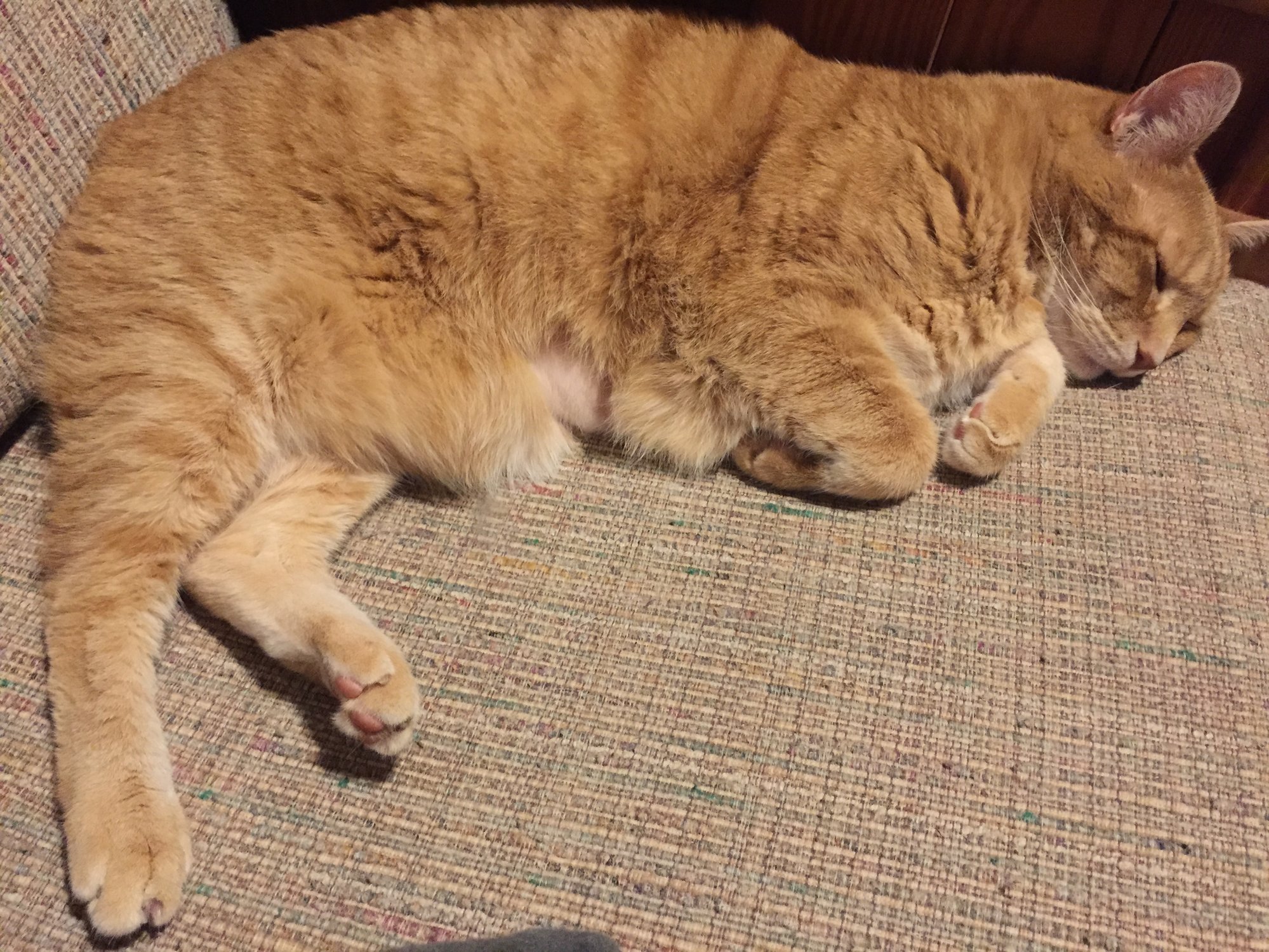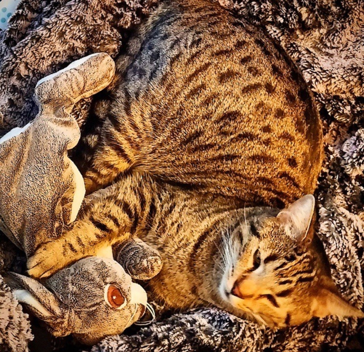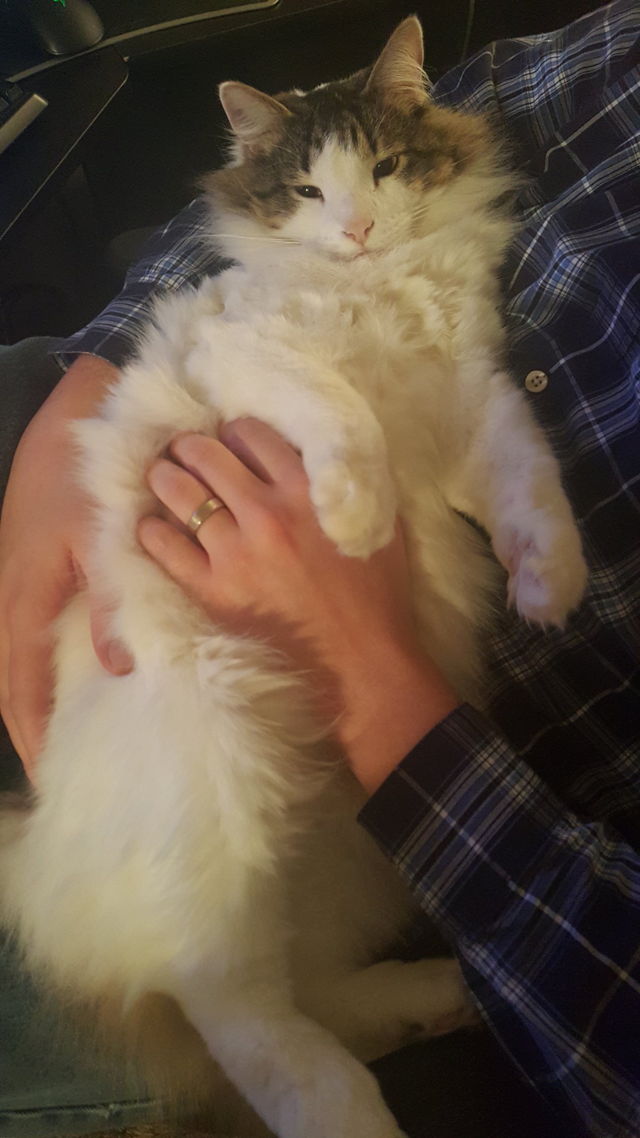 my three cats: Nicodemus, the gray cat, is 17. The black cat closest to the camera on Nicodemus's back is Cocoa, 2 years. The black cat curled up under nicodemus's front paws is Smudge, 11 months.