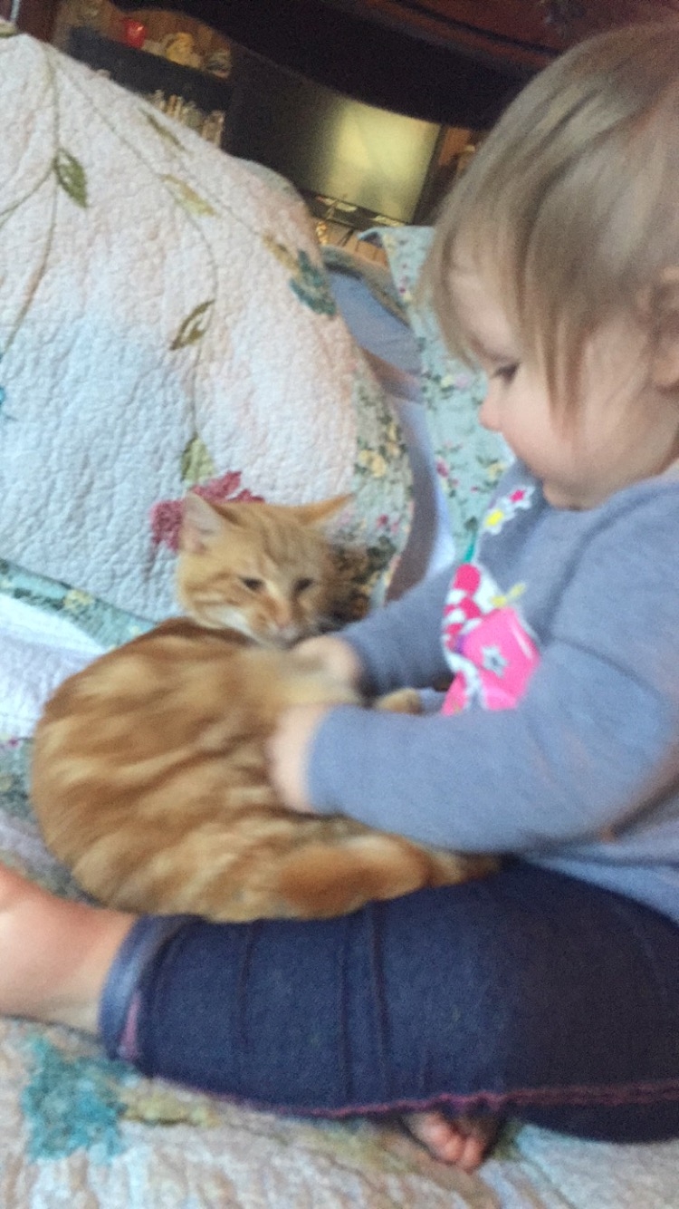 Our dog, Wrigley, will be 7 next month and then we have the boss of the house, Boulevard. He seriously rules the roost, but lately he wants to be held like this so I say he is prepping DH for holding the baby.