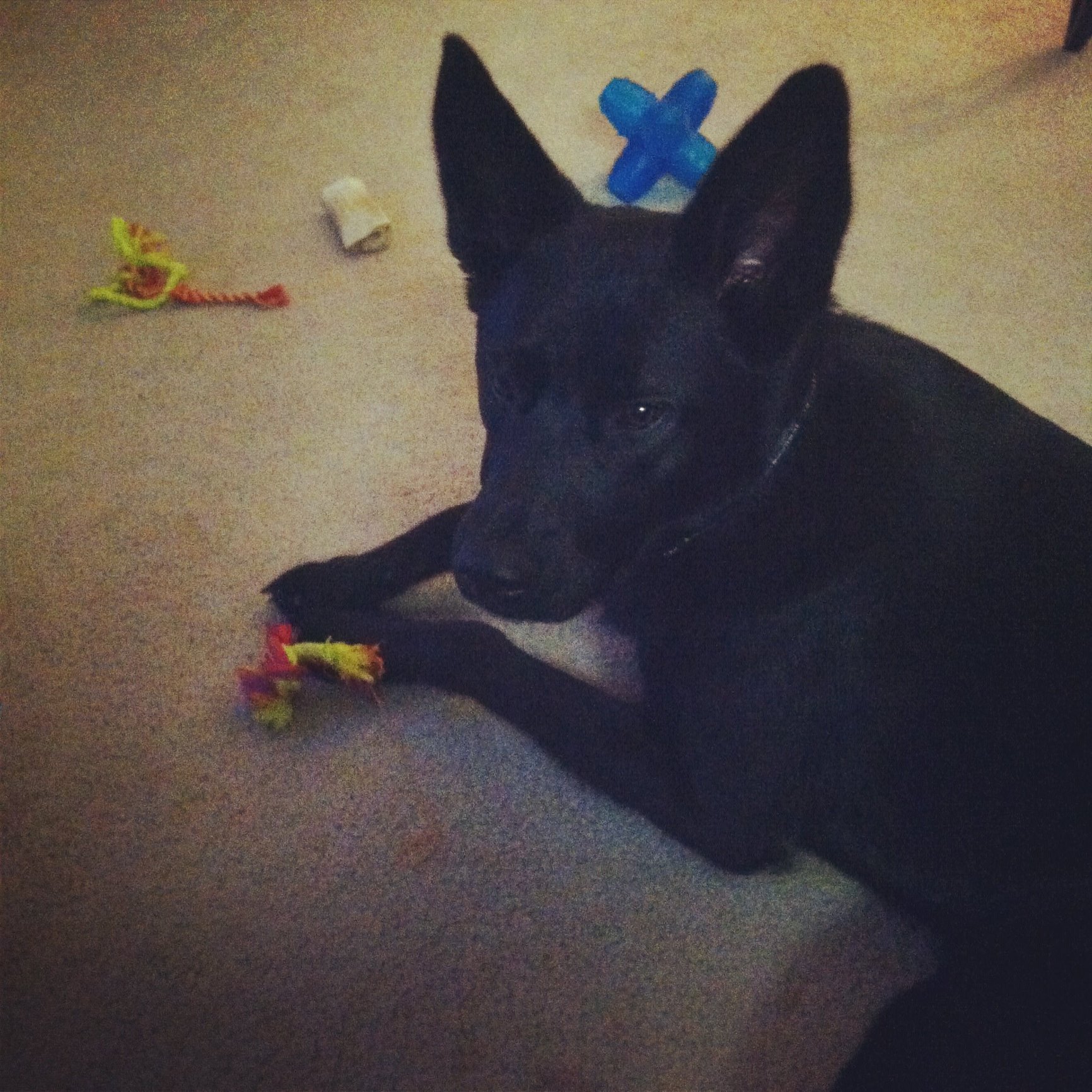 Unnamed puppy german shepherd akita mix 11weeks lol( I can't come up with a good name for her feel free to give ideas !!) Bottom right Roofio (11 mos mutt kitten with kitty aids ) and yes that's the handle to a paper bag around his neck cuz he got in trouble while we weren't home and that's how we found him sleeping with a necklace on lol