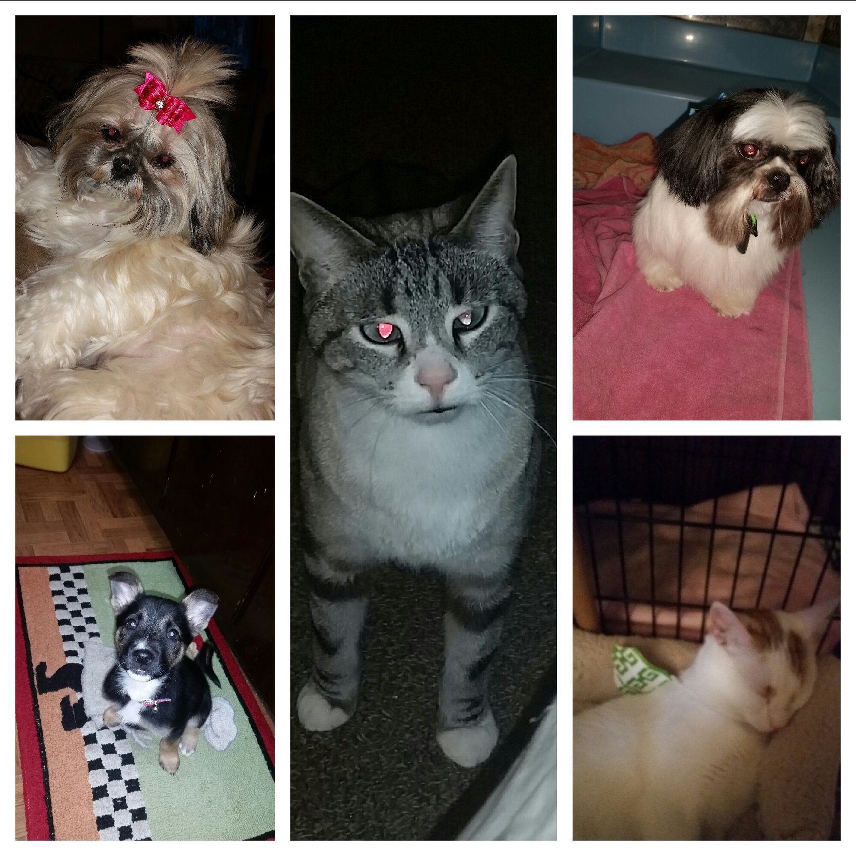 Our fur babies (Im a vet tech so yes I have alot of pets lol) top left to right Lexi (8 yr shihtzu)Roman (2 yr siamese snowshoe ) Rambo (4yr shihtzu) Unnamed puppy german shepherd akita mix 11weeks lol( I can't come up with a good name for her feel free to give ideas !!) Bottom right Roofio (11 mos mutt kitten with kitty aids ) and yes that's the handle to a paper bag around his neck cuz he got in trouble while we weren't home and that's how we found him sleeping with a necklace on lol