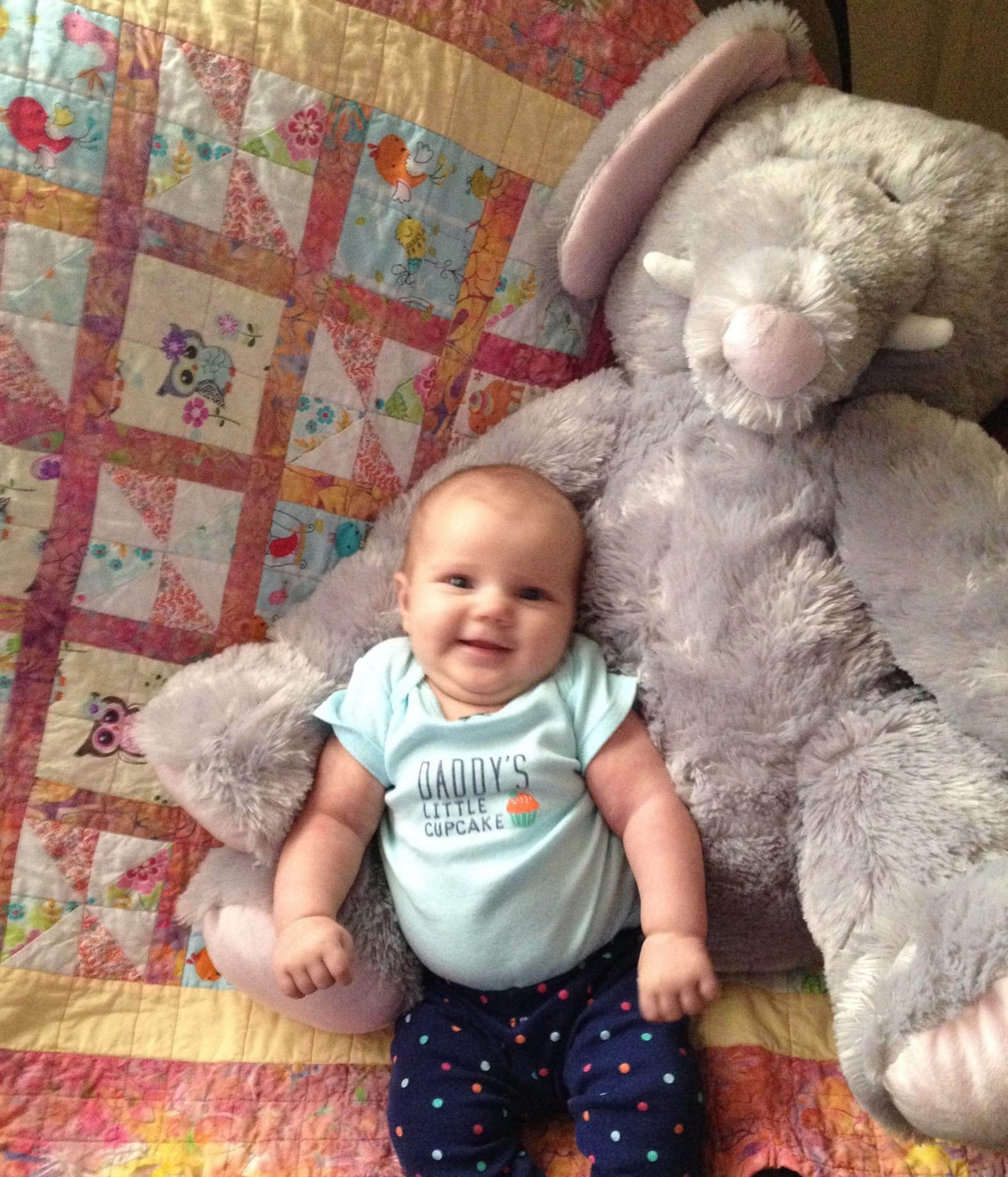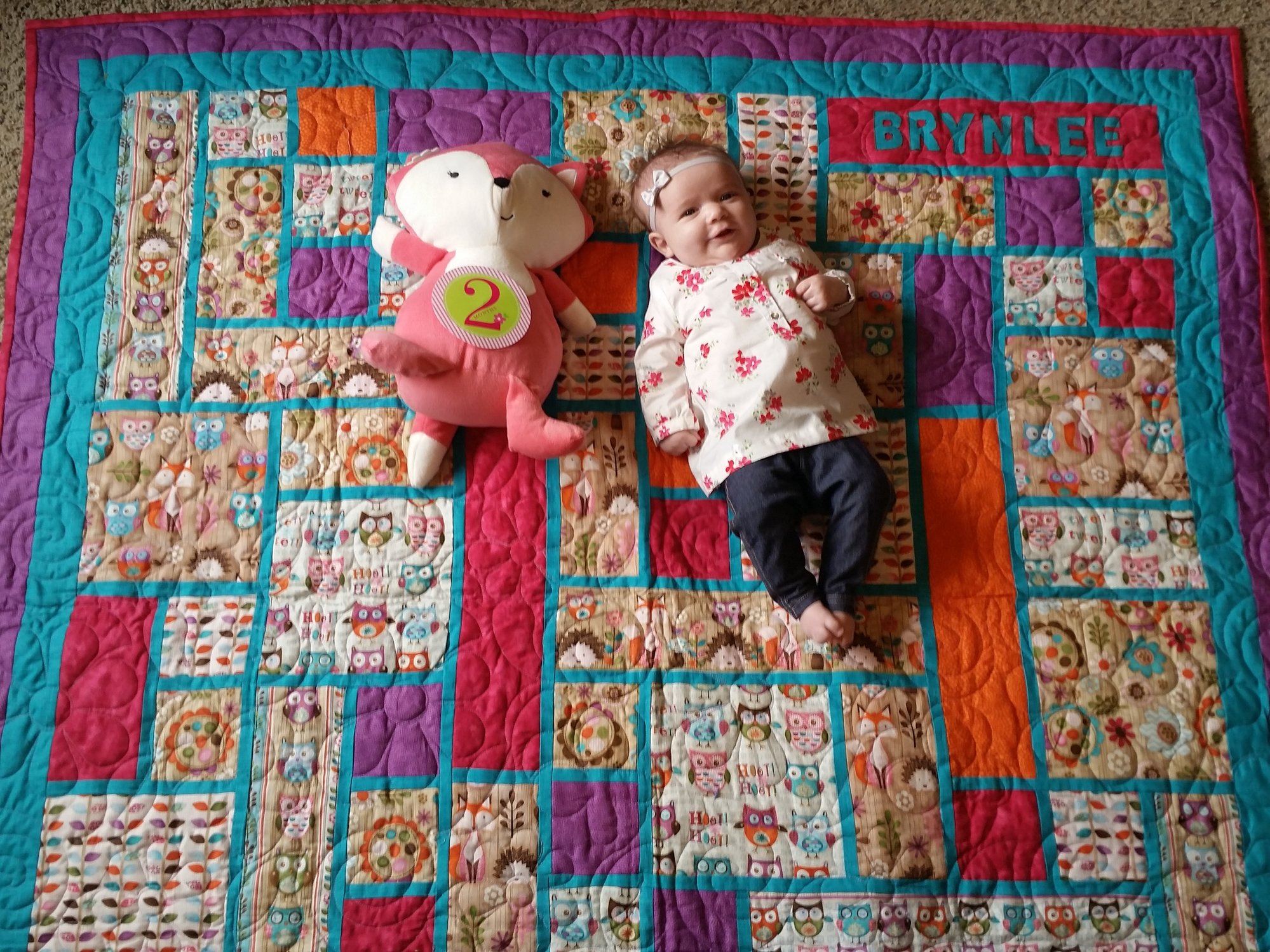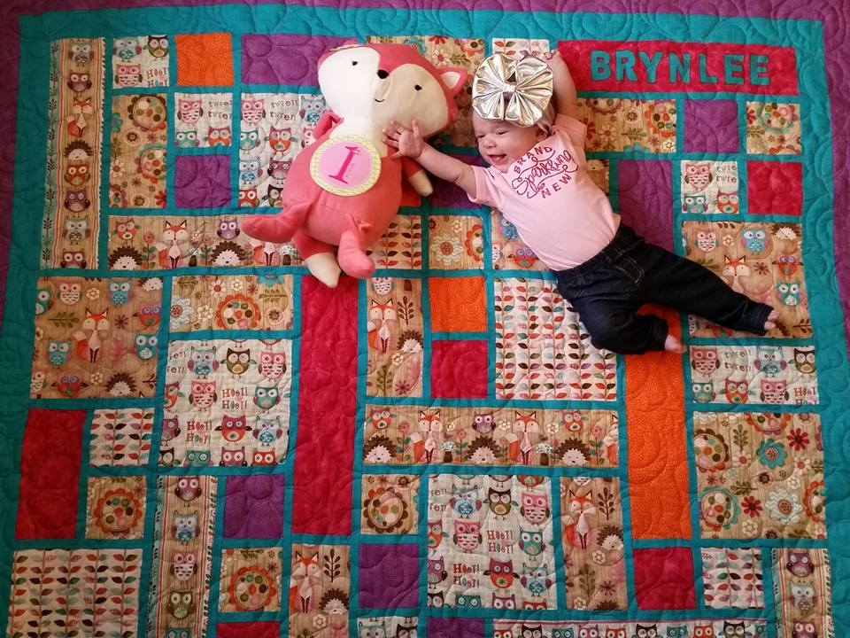 With my son, we used his handmade quilt and a stuffed animal for monthly pictures (starting with 1 week, then going to months). Soooo, now that I've finally broken out my laptop since the app on my phone shuts down every time I think about the graphic-heavy threads, I can post Brynlee's pictures! 1 Week - 7 lb 4 oz, 20 in 1 Month - 9 lb 12 oz, 21 3/4 in