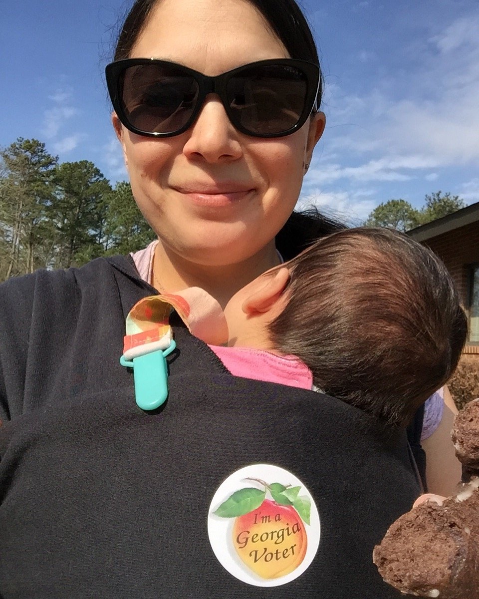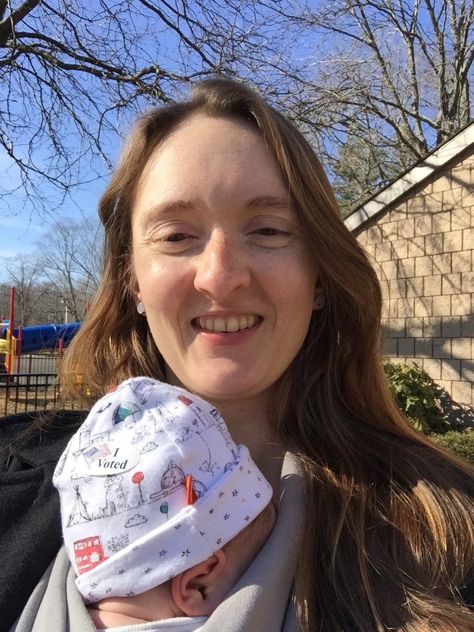 Top is in the ergo with the infant insert, which is super convenient for out and about, and bottom is the moby on our walk to vote today