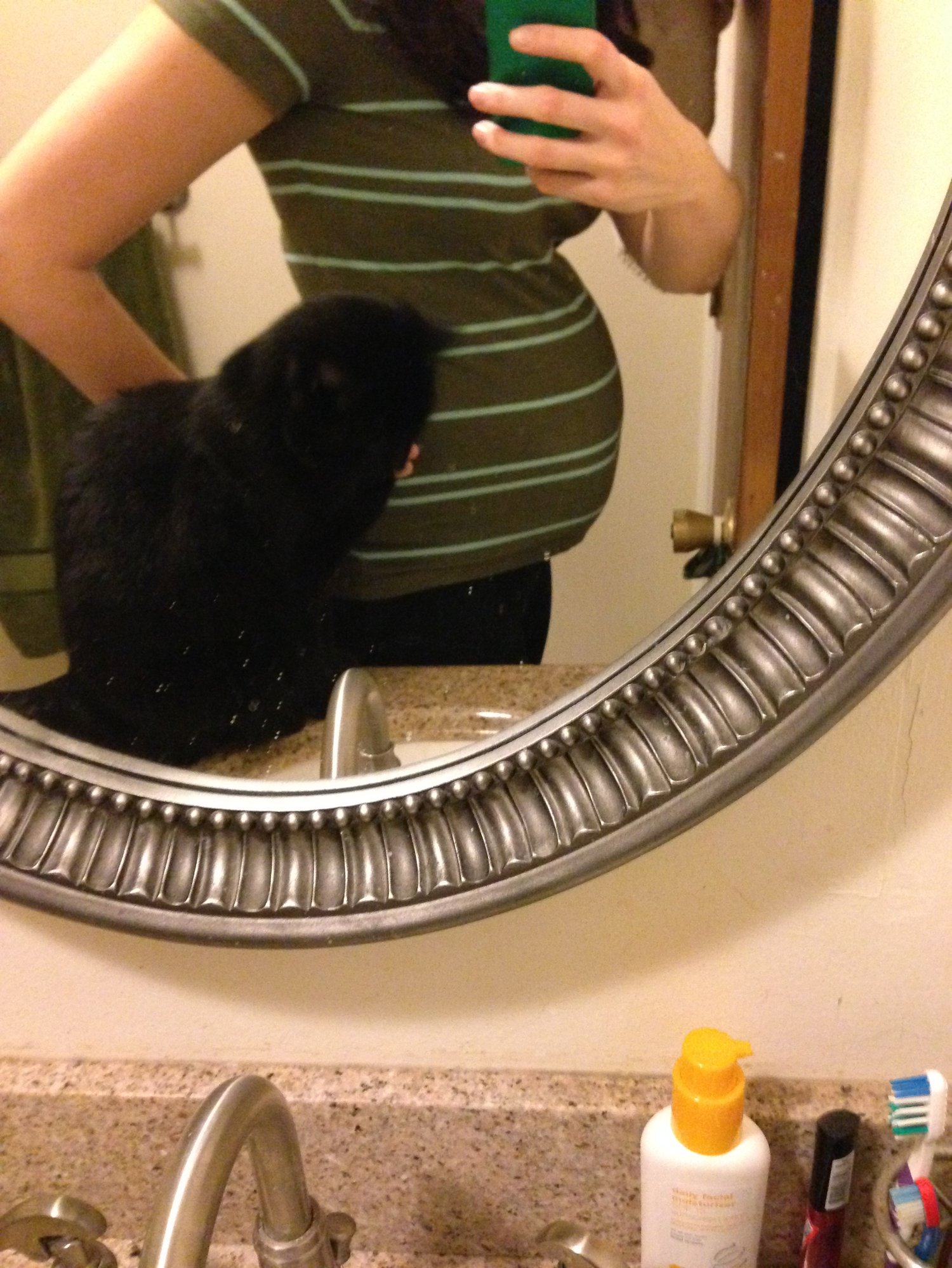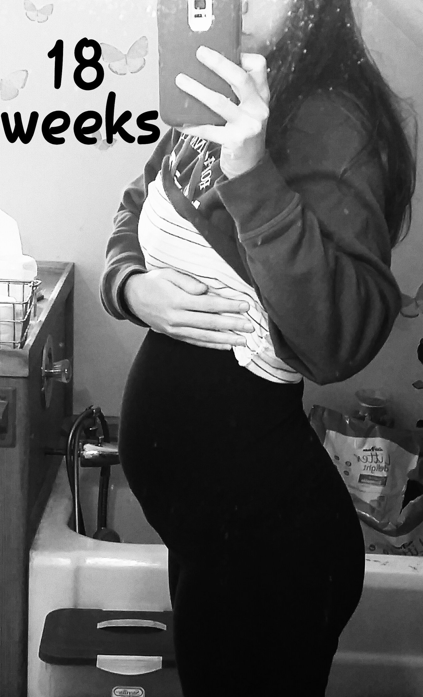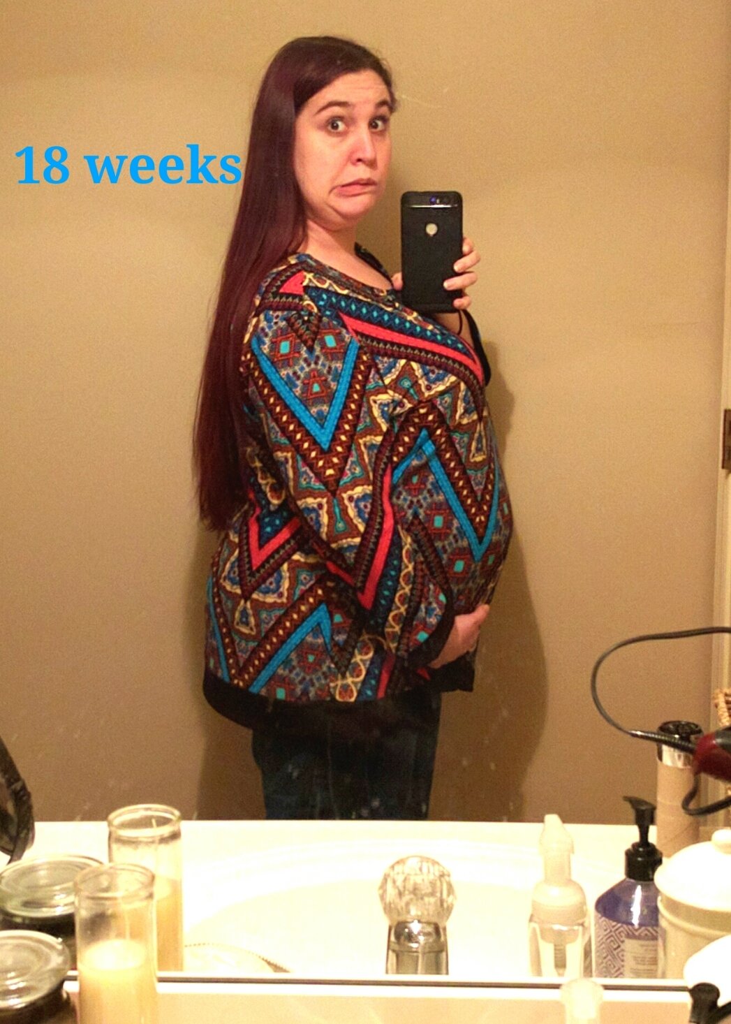 18 weeks with #1. Still waiting to feel movement. (visiting my parents so only bathroom with a mirror I can use is the cats room, thus the cat litter in the tub)