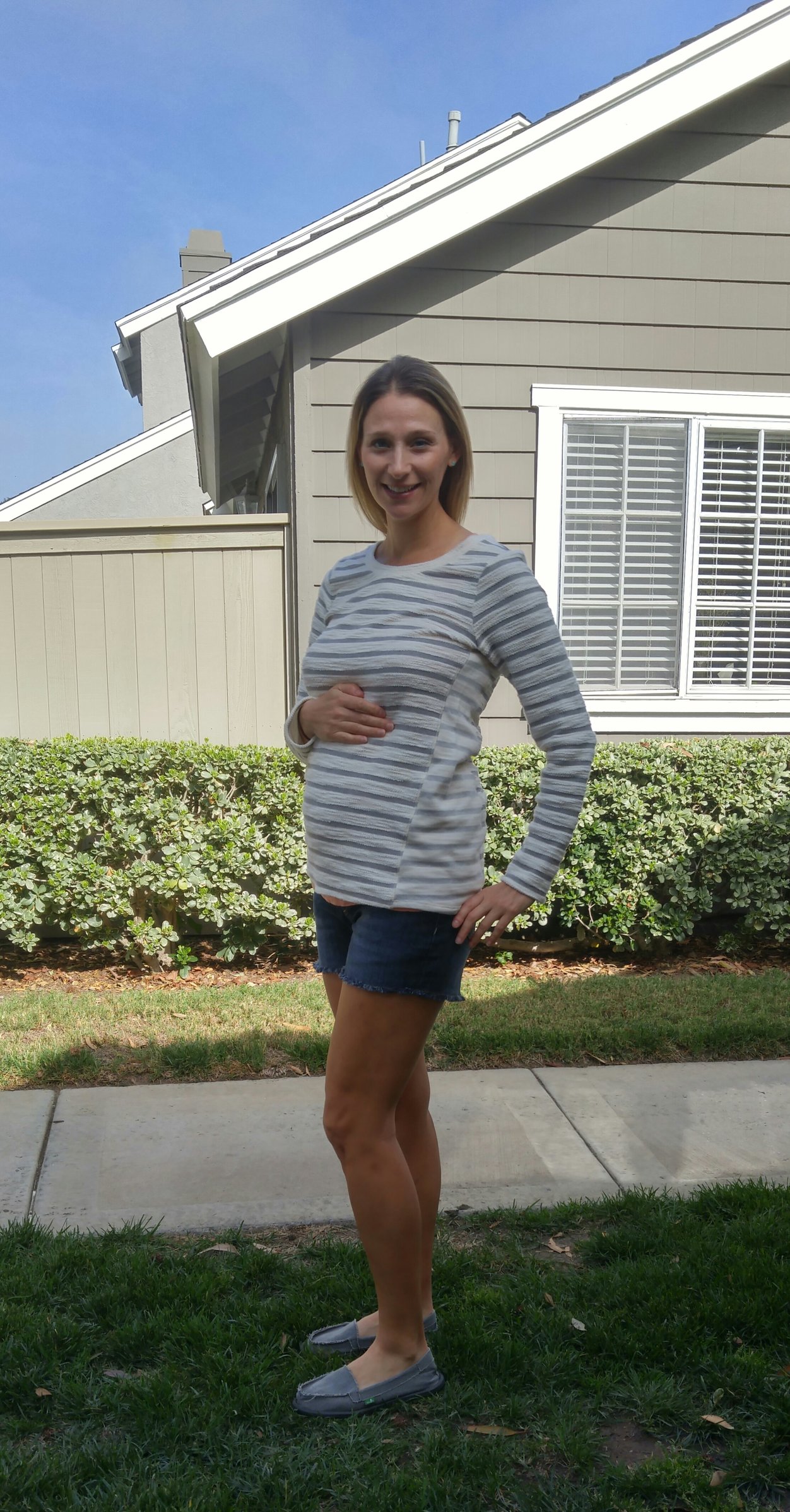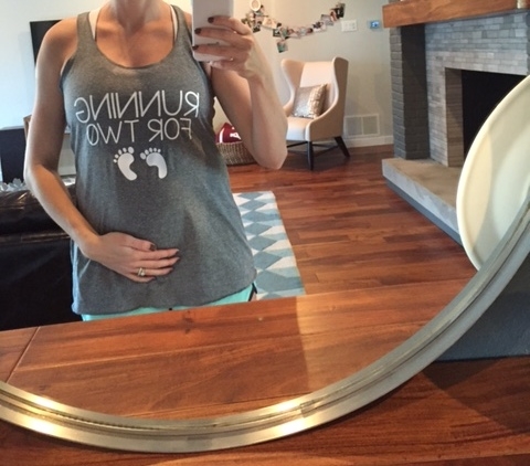 15 weeks with bebe #2. MY SIL gave me this precious running shirt and I finally wore it yesterday. The side angle is hard to see much, but you can see some tummy bulge from the front.