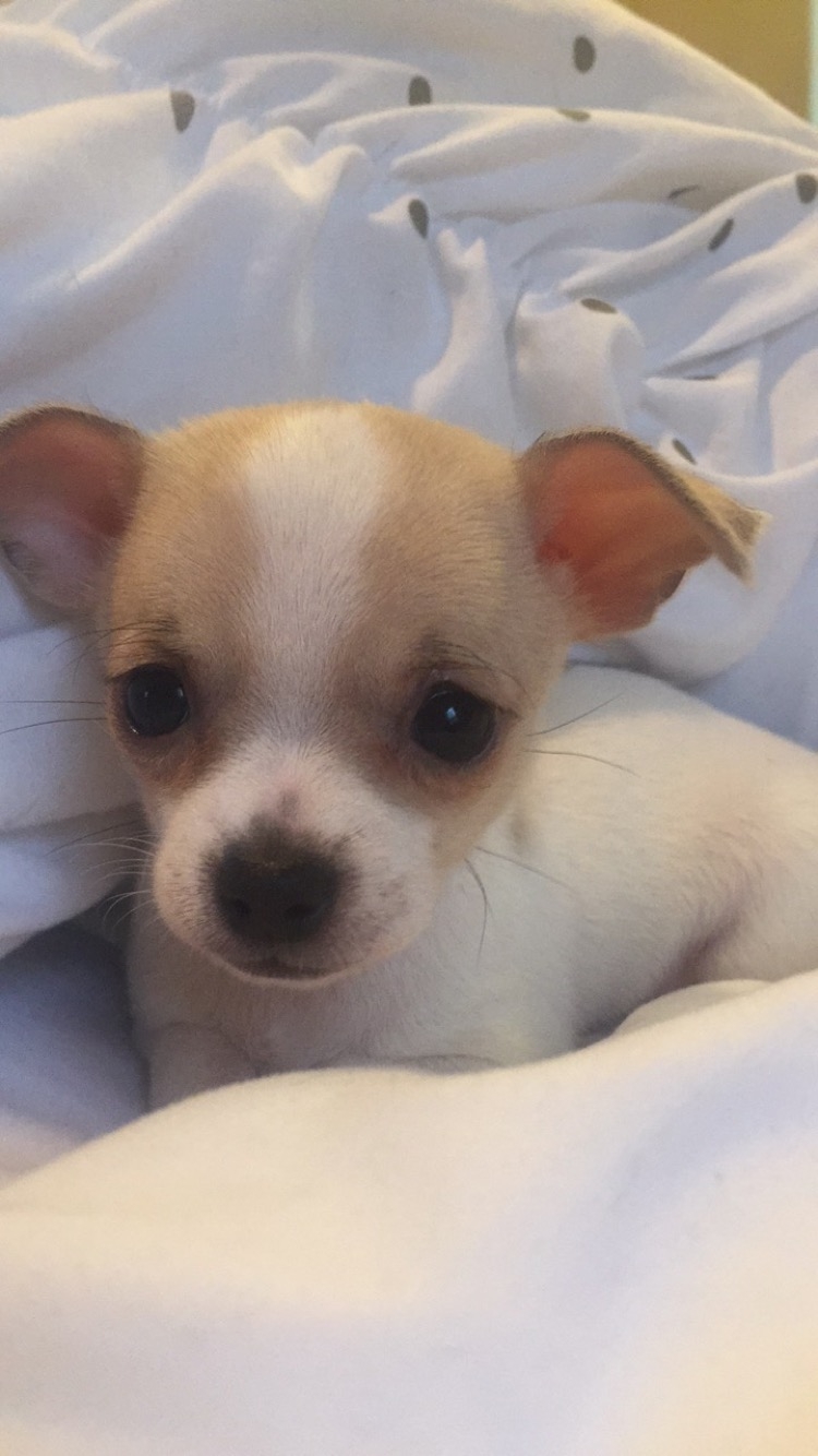 New puppy we got Sunday! Her name is Roxy (DH said he got to pick the name because I picked out the name for our other dog and the baby). She's a 7 week old chihuahua and it's hard to tell how tiny she is in pictures but she barely a pound. She's really brave and we really have to watch her when she's on the couch with us because she tries jumping off. She's also good practice for when baby gets here, she wakes us up every few hours crying because she needs to be let out to go potty.