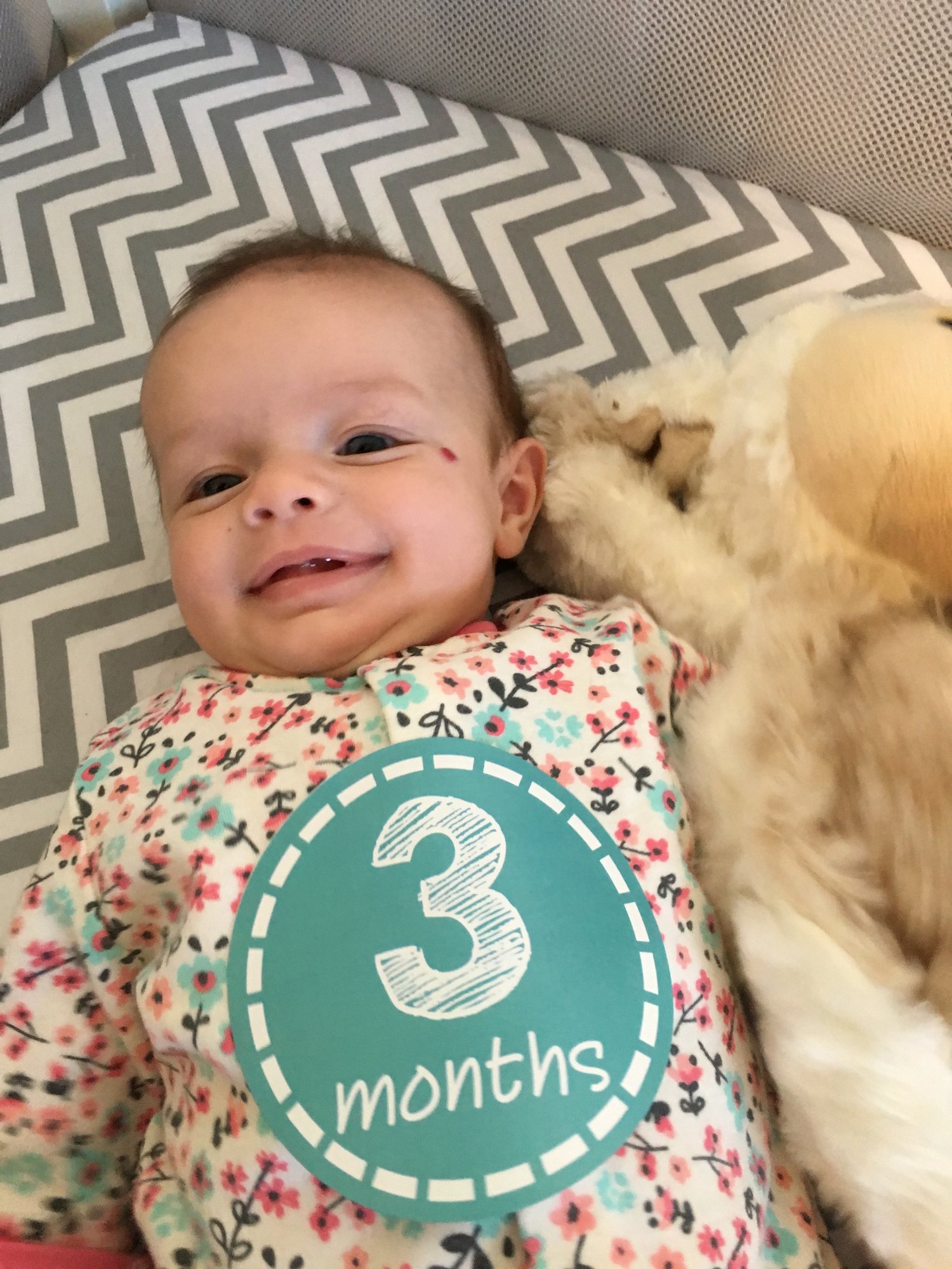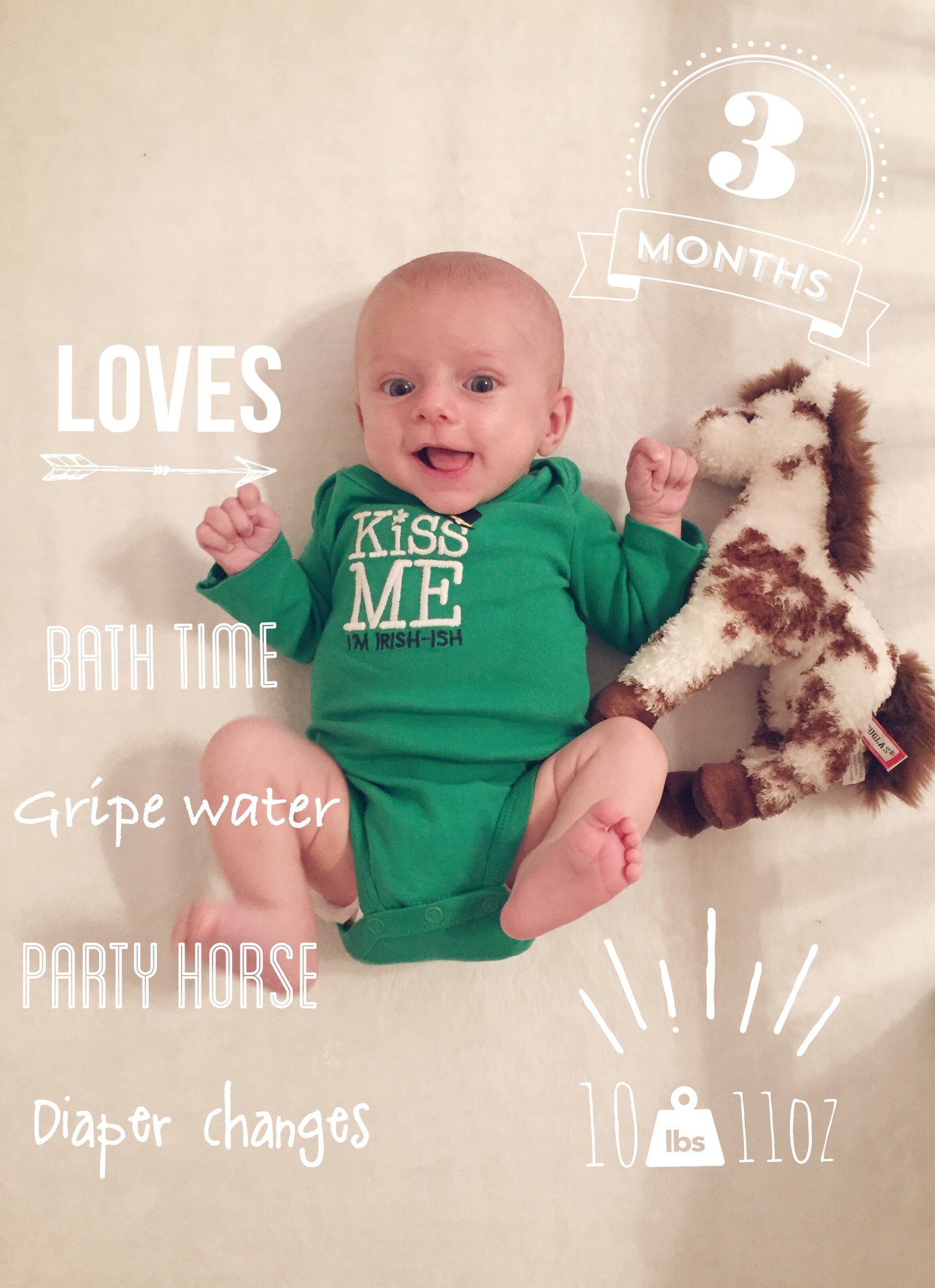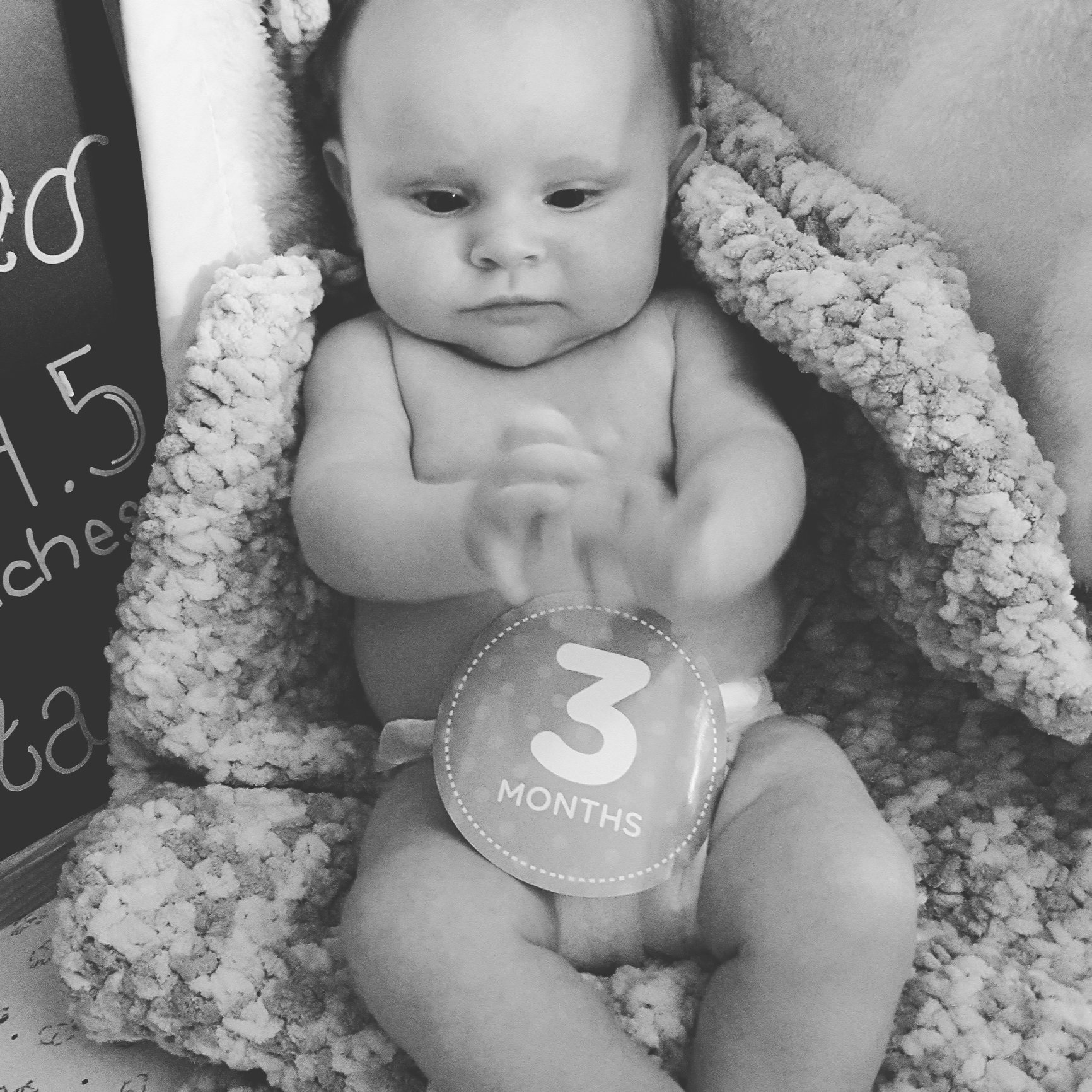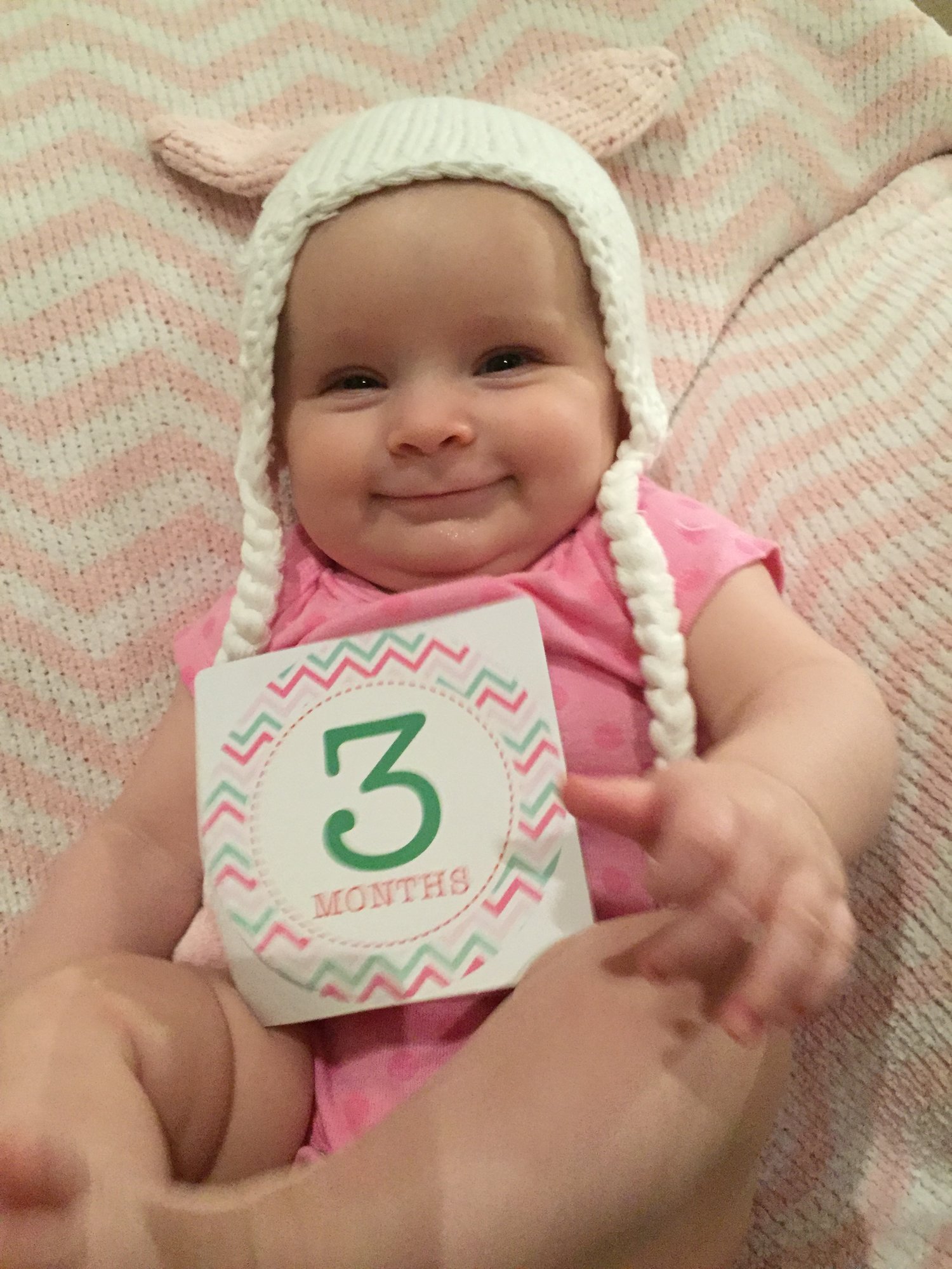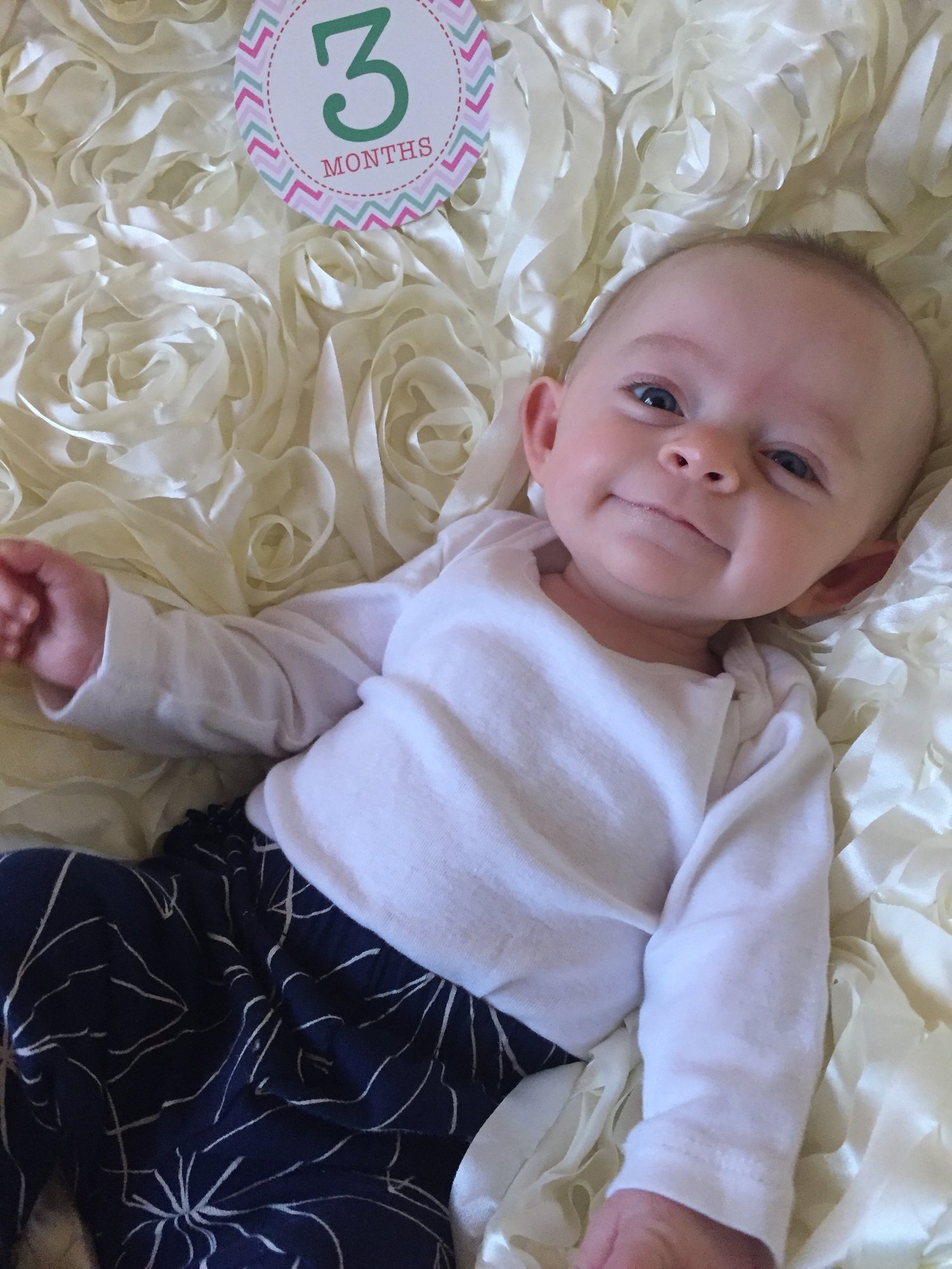 Maeve was 3 months on March 11th. 10lbs 13oz. She can roll from tummy to back and back to tummy, grabs everything within her reach, and loves having "conversations" with anyone willing to talk to her.