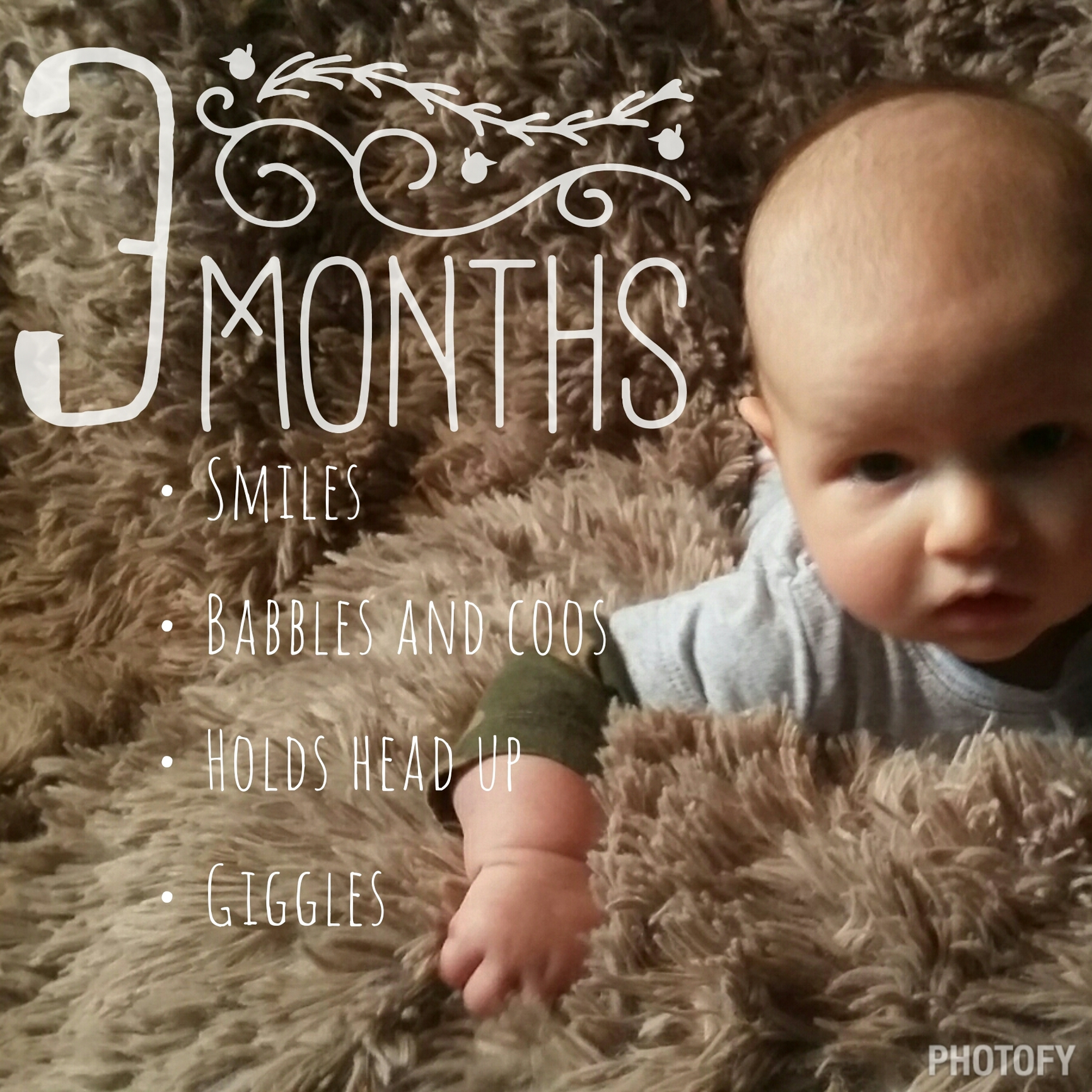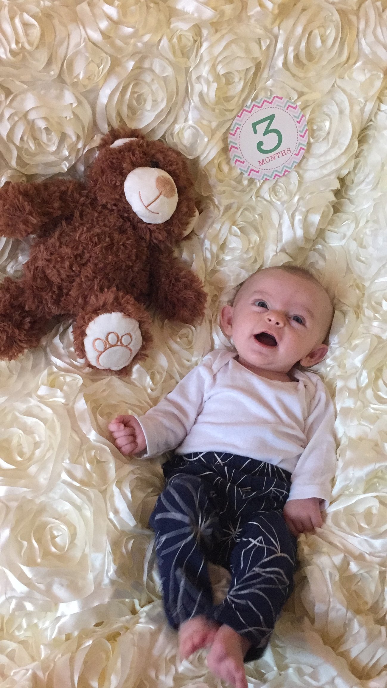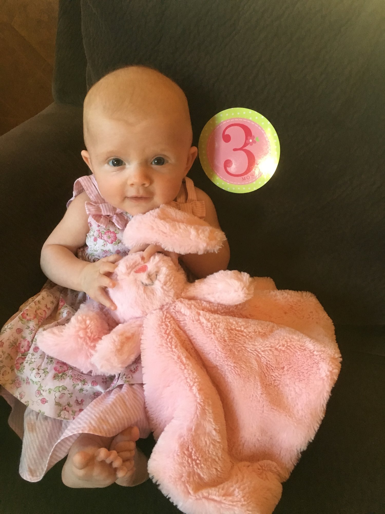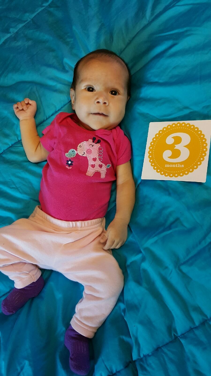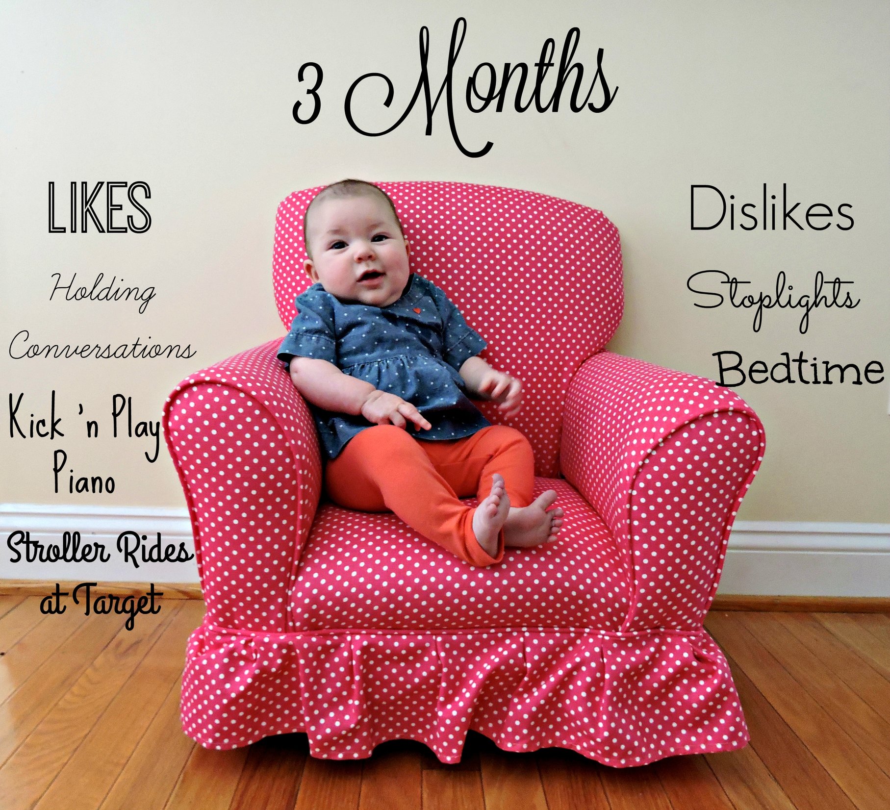 Maeve was 3 months on March 11th. 10lbs 13oz. She can roll from tummy to back and back to tummy, grabs everything within her reach, and loves having "conversations" with anyone willing to talk to her.