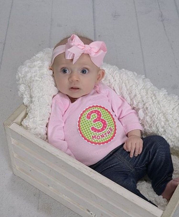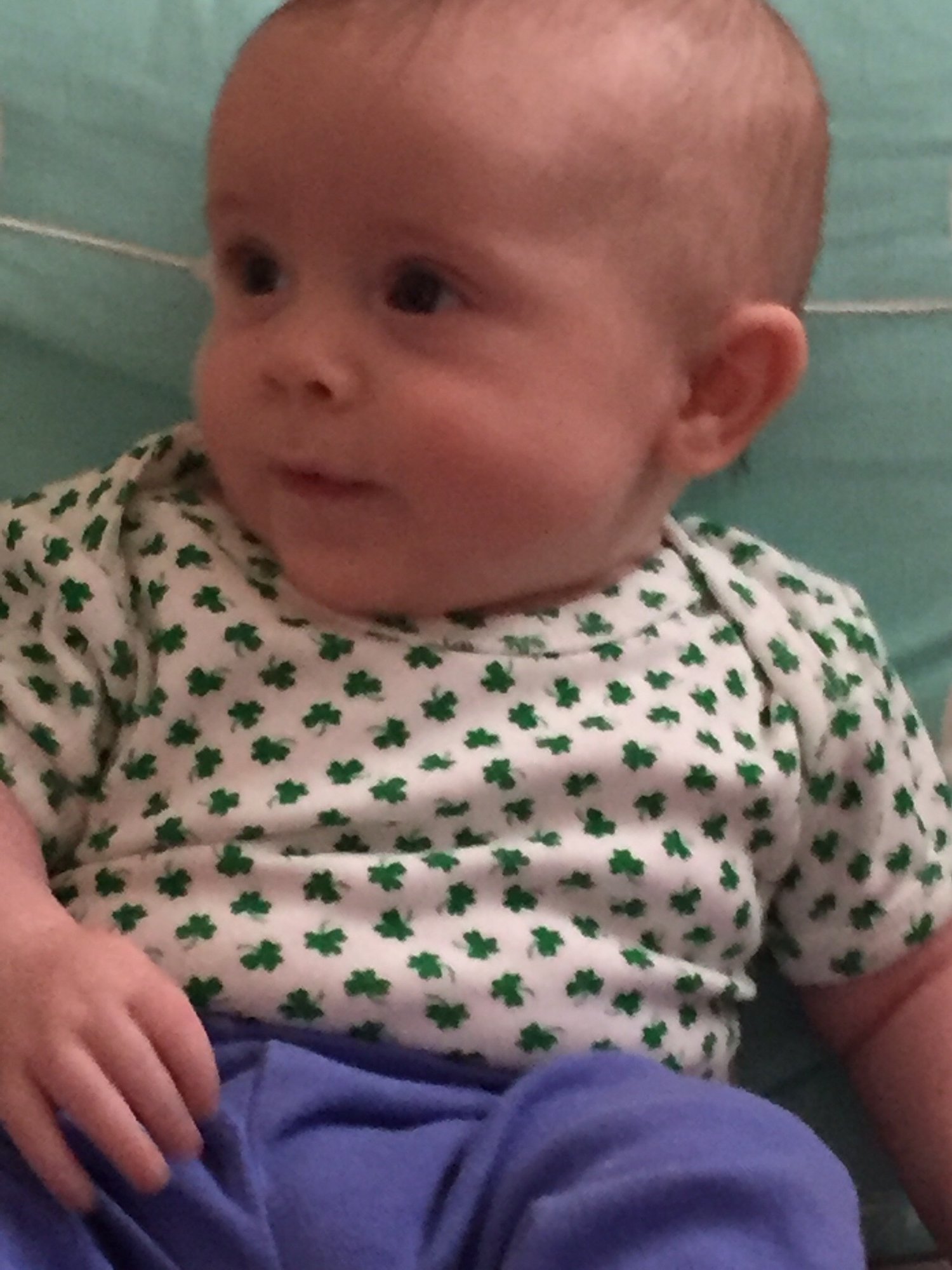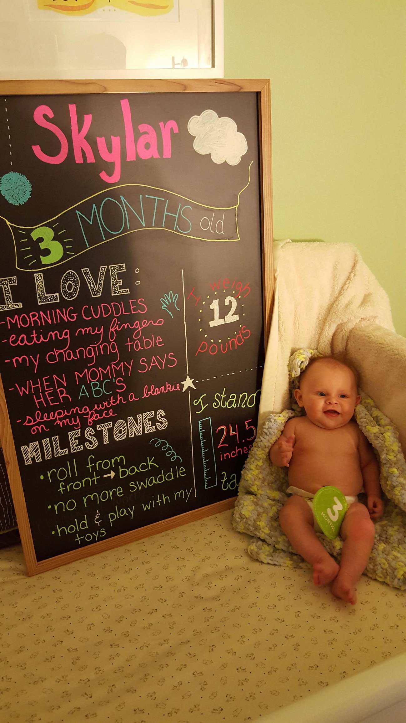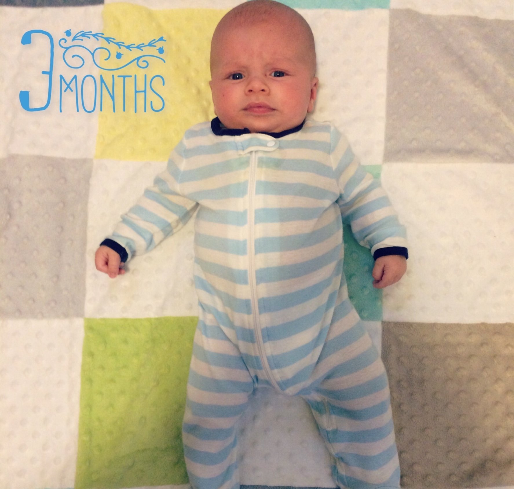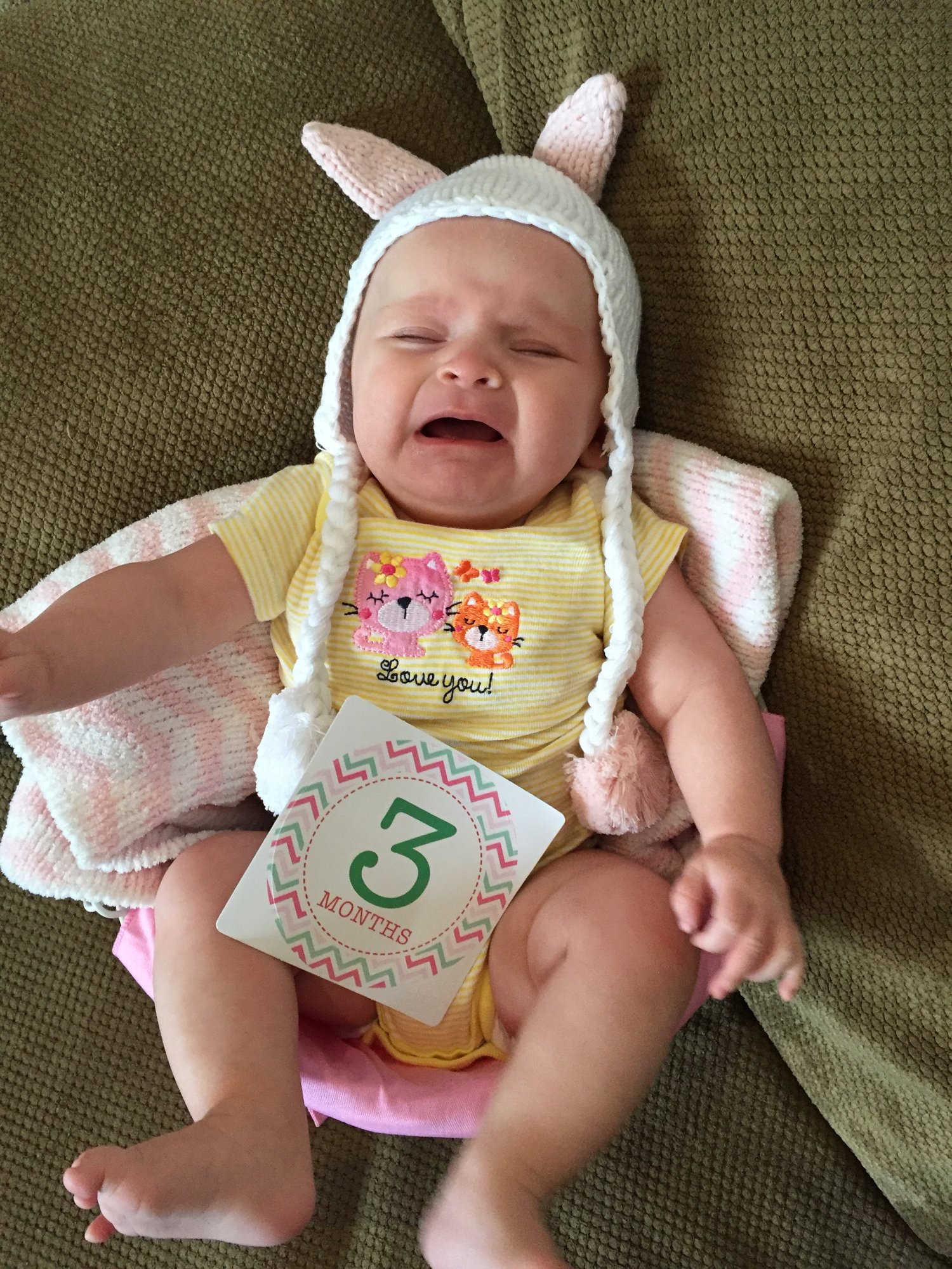Maeve was 3 months on March 11th. 10lbs 13oz. She can roll from tummy to back and back to tummy, grabs everything within her reach, and loves having "conversations" with anyone willing to talk to her.