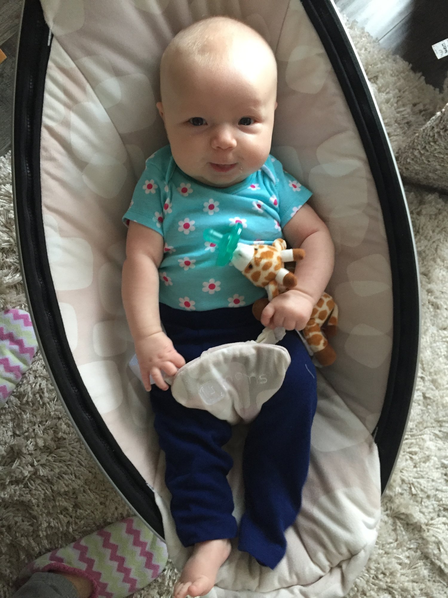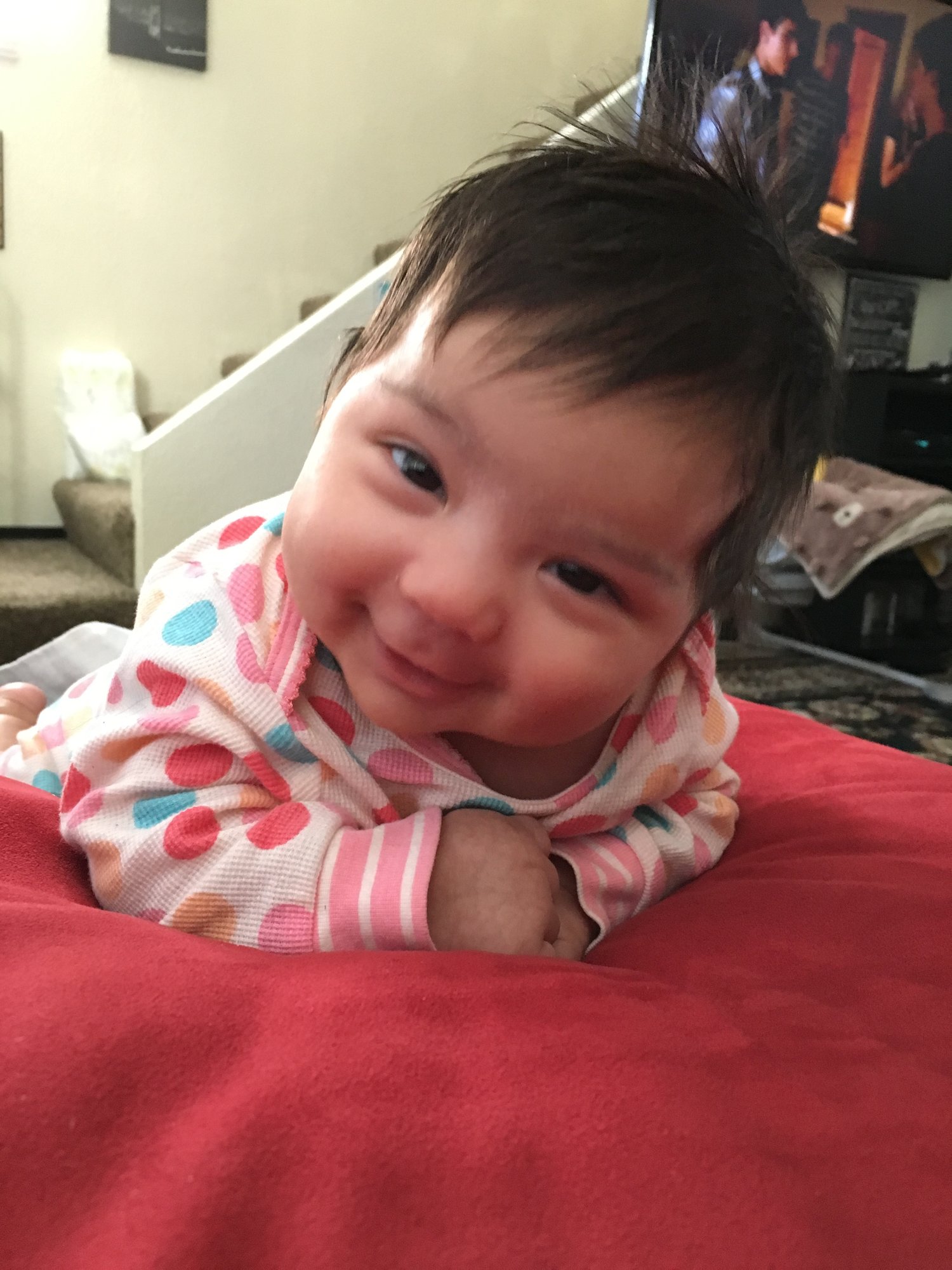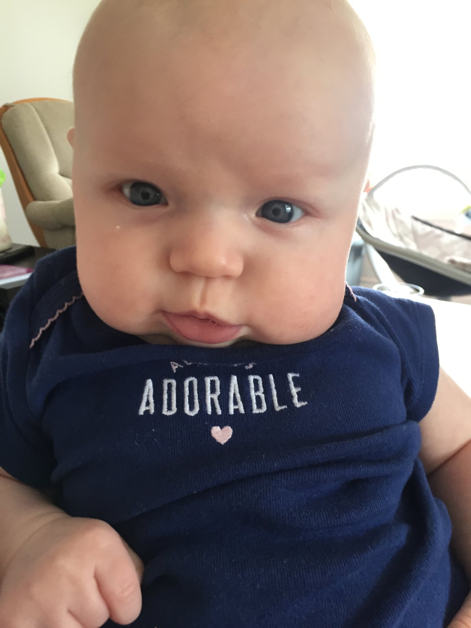 Ainsley is the light of mommy and daddy's life! Her face lights up when she hears and sees her daddy followed by squealing. She's a daddy's girl already! Her personality is shining through more and more each day. She almost has rolling from back to tummy down, very content baby still, & is still giving us full nights rest. She's starting to dislike car rides and dislikes her bottle being taken from her when going to burp her. (Added 1st photo in because it's hilarious...)