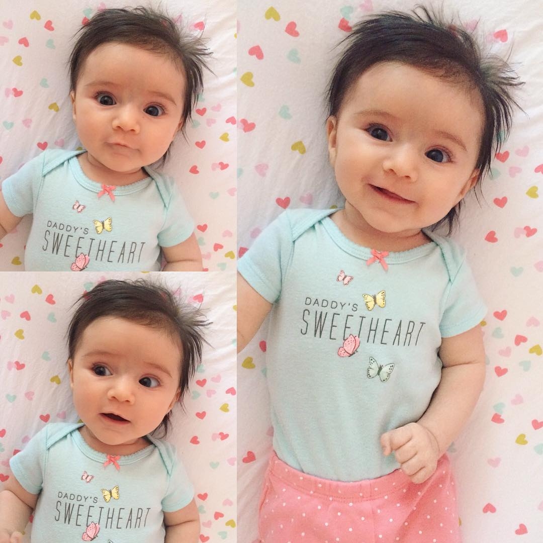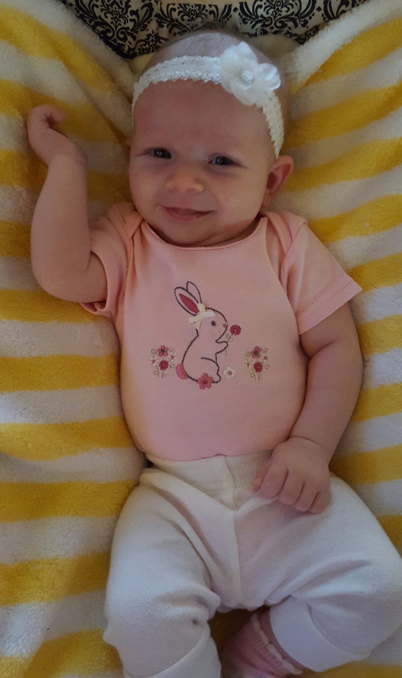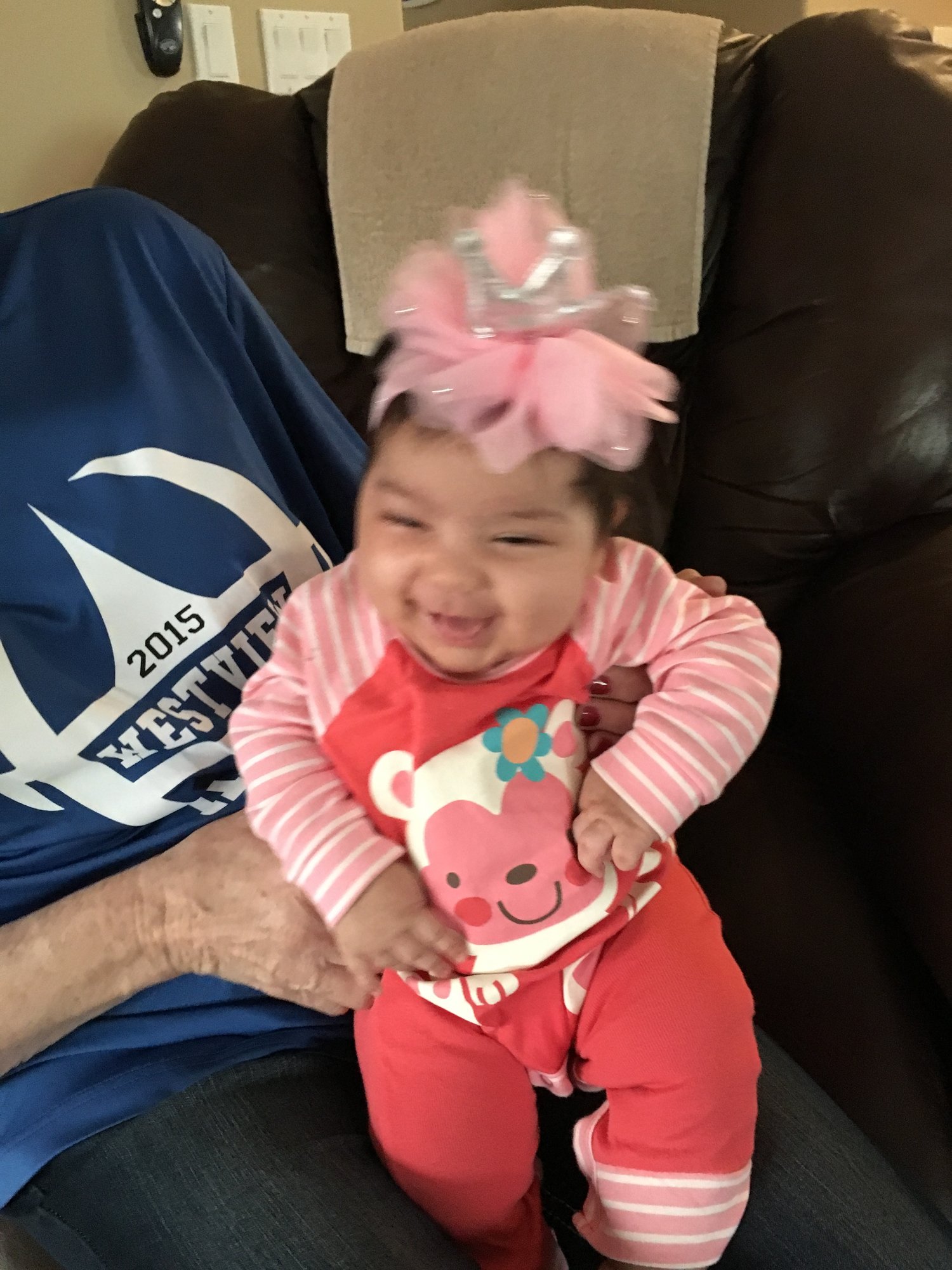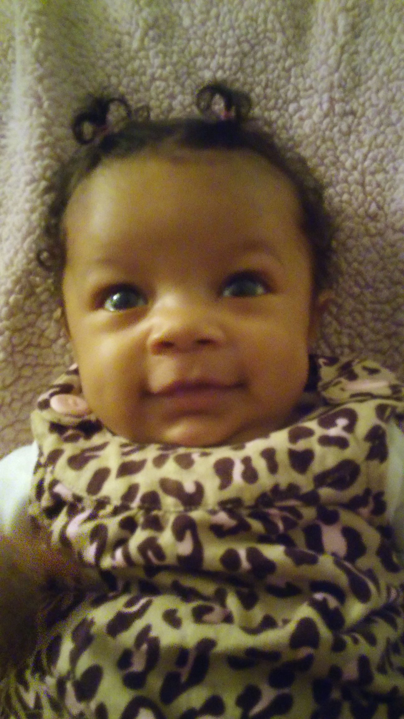 Ainsley is the light of mommy and daddy's life! Her face lights up when she hears and sees her daddy followed by squealing. She's a daddy's girl already! Her personality is shining through more and more each day. She almost has rolling from back to tummy down, very content baby still, & is still giving us full nights rest. She's starting to dislike car rides and dislikes her bottle being taken from her when going to burp her. (Added 1st photo in because it's hilarious...)