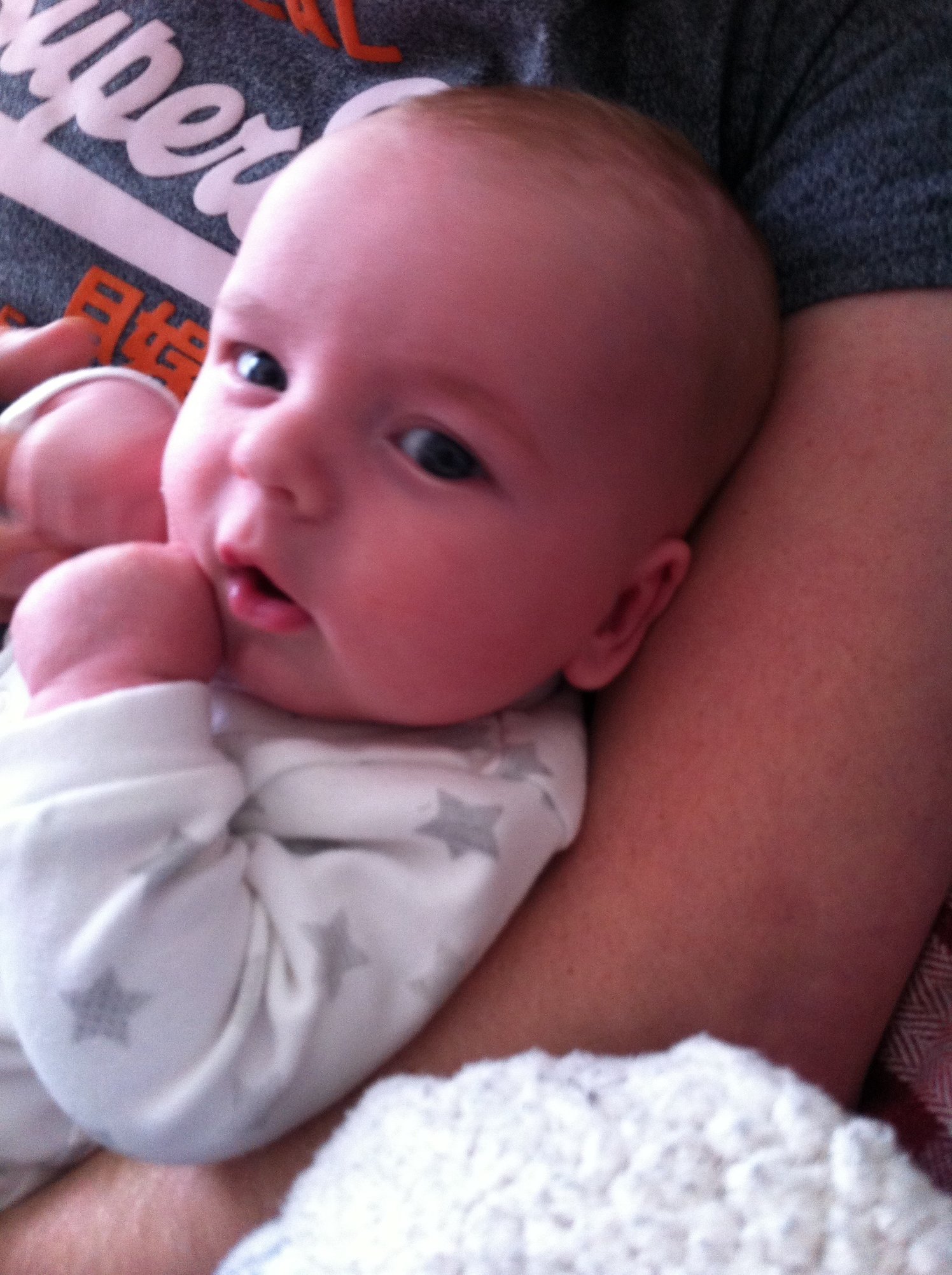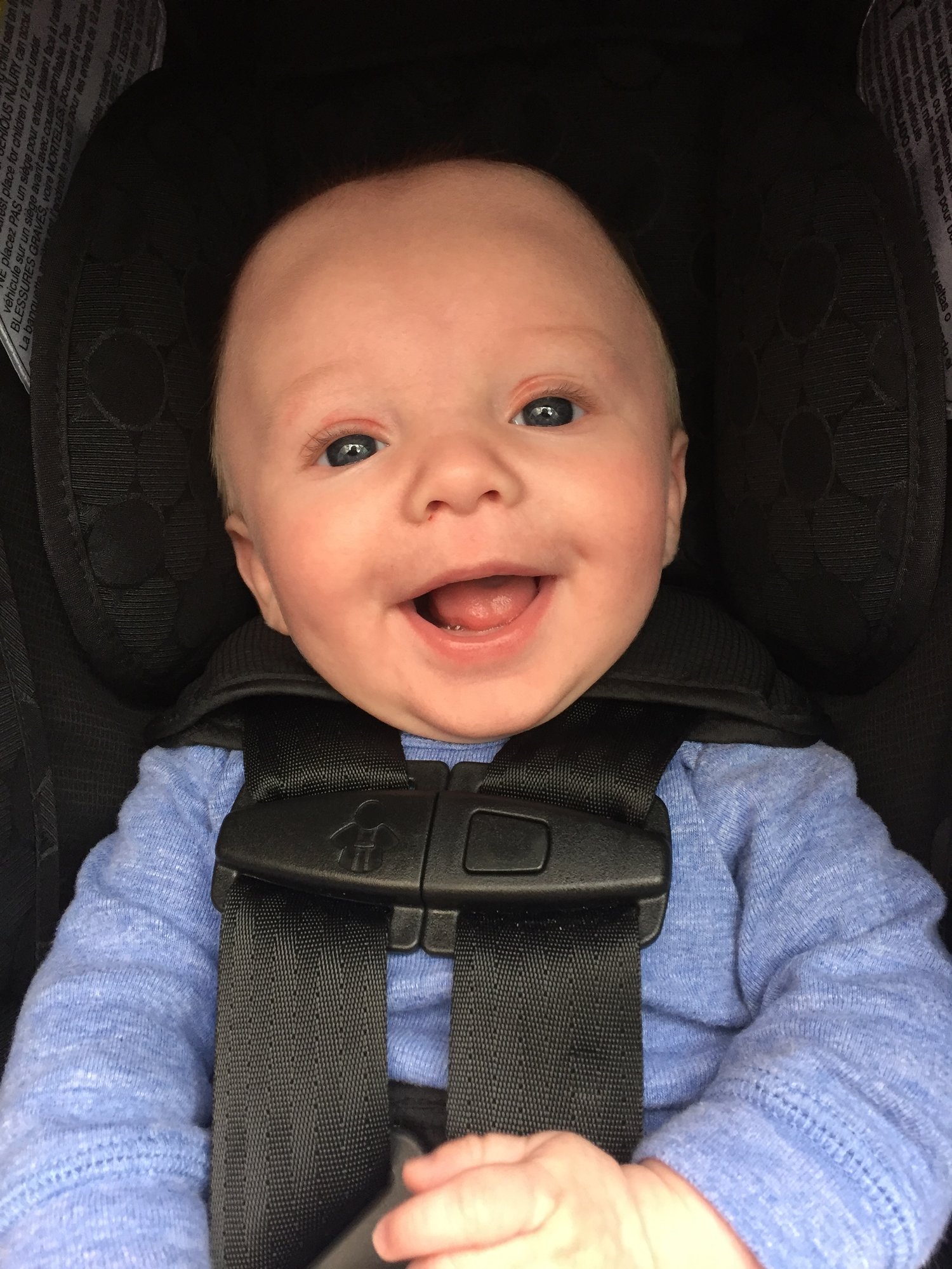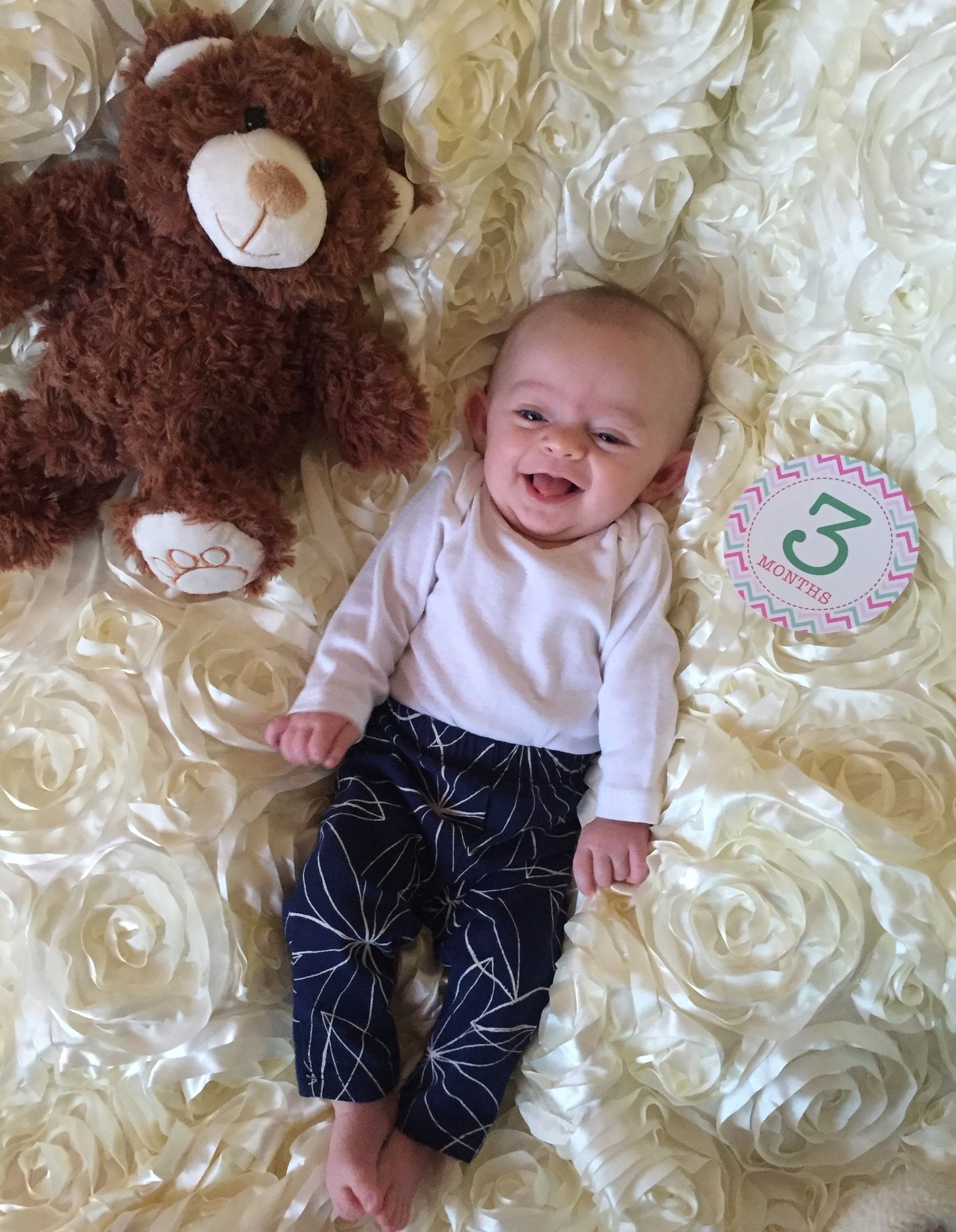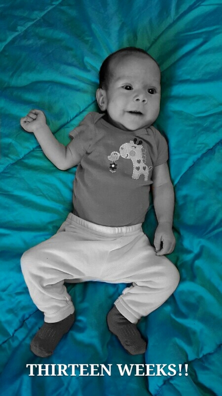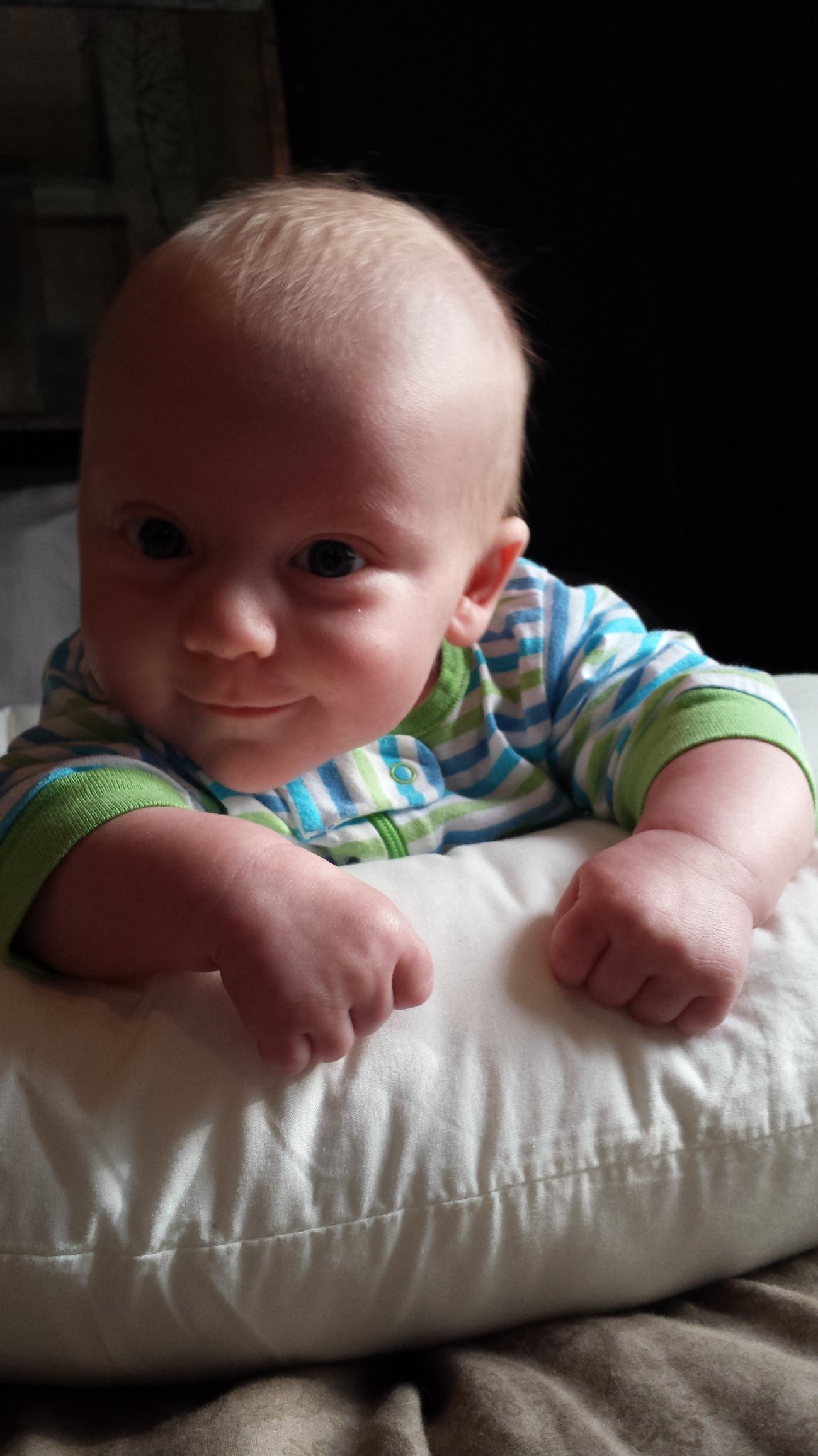 Jenson is almost 15 weeks old can roll over from front to back. He has a smile all day long, He is very content.. but is yet to give me a full night sleep! he is one hungry boy..