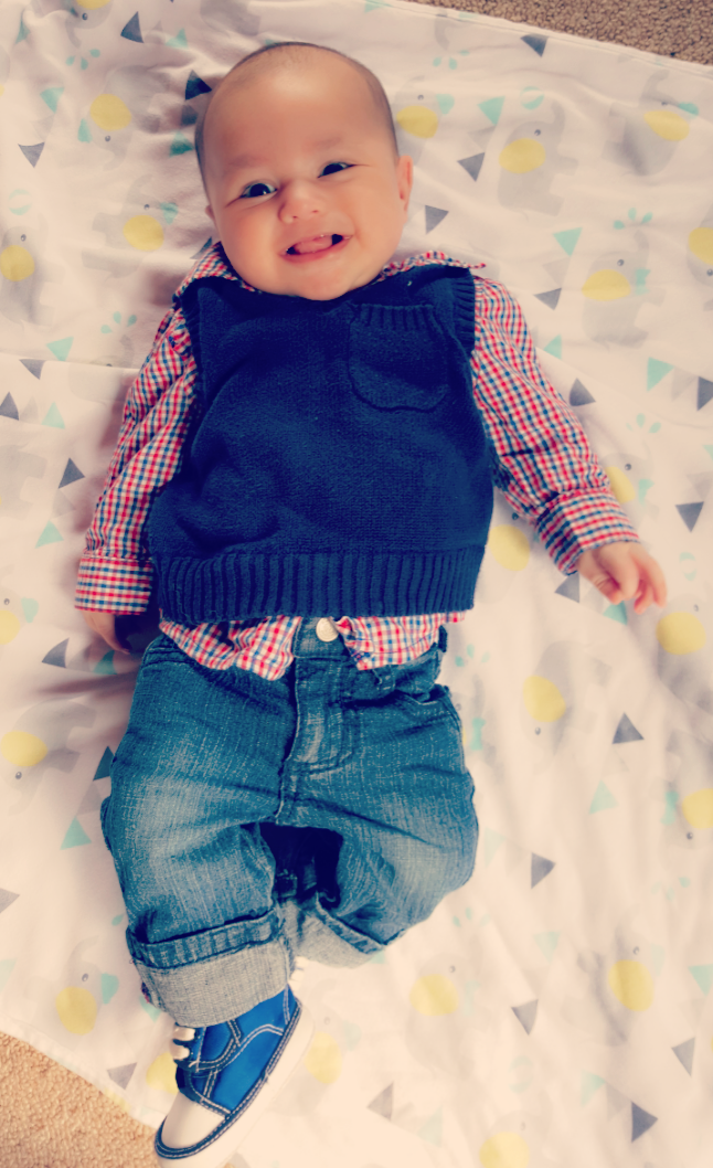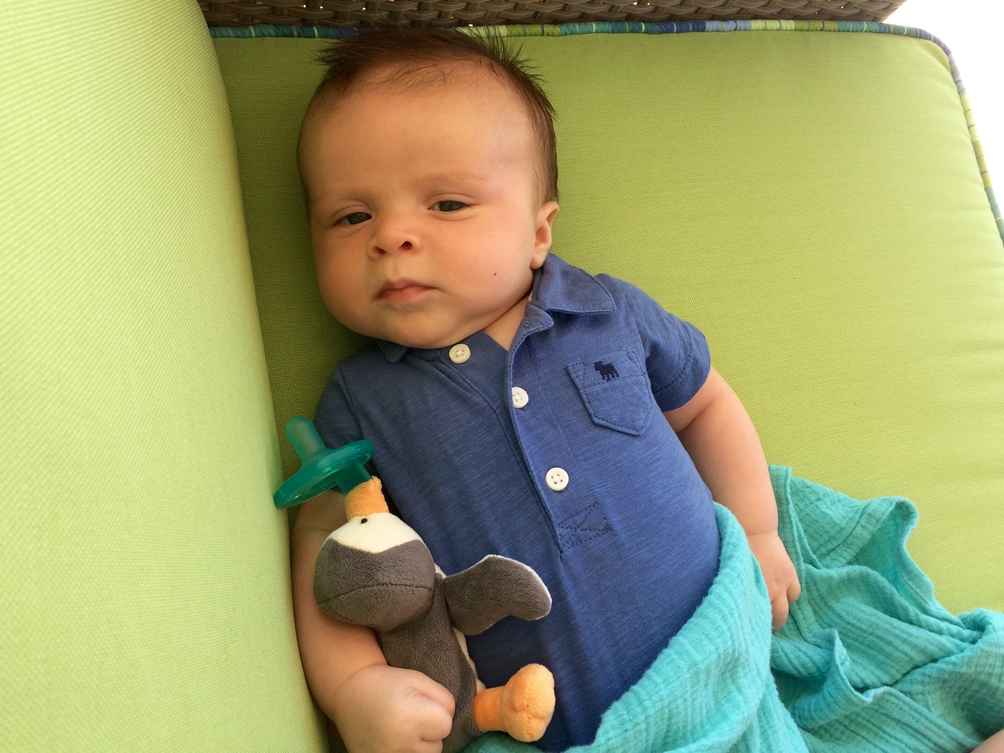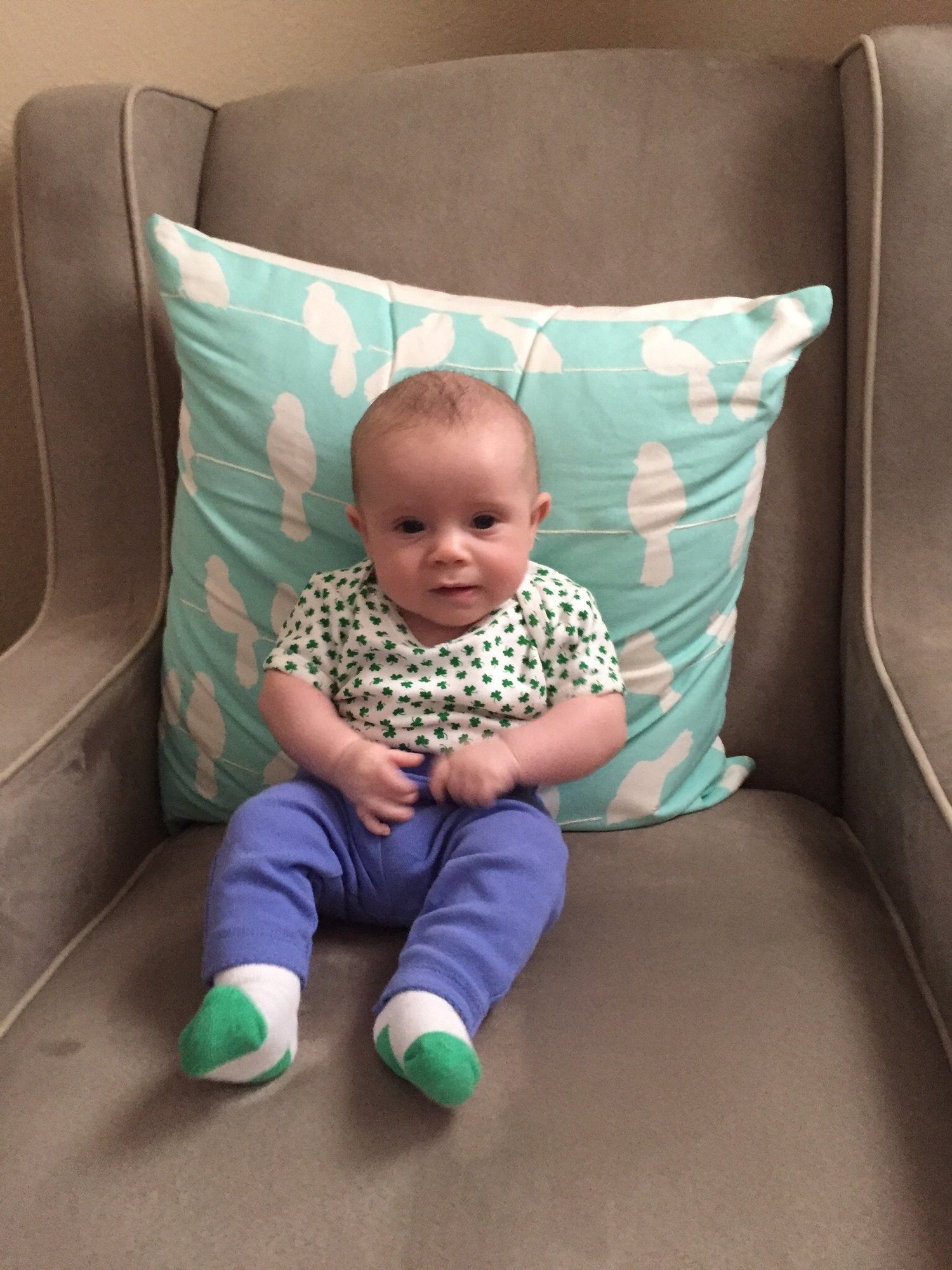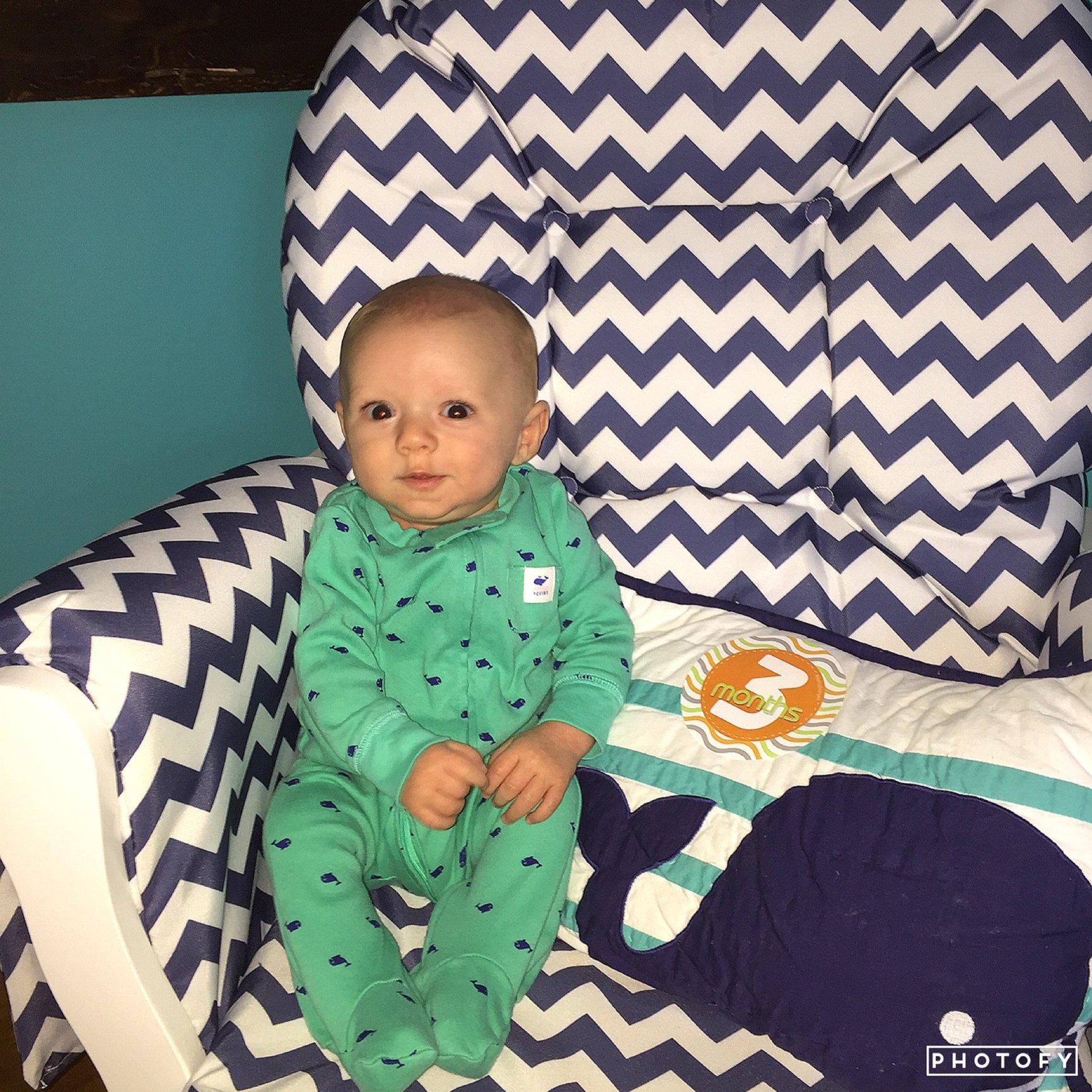 Jenson is almost 15 weeks old can roll over from front to back. He has a smile all day long, He is very content.. but is yet to give me a full night sleep! he is one hungry boy..