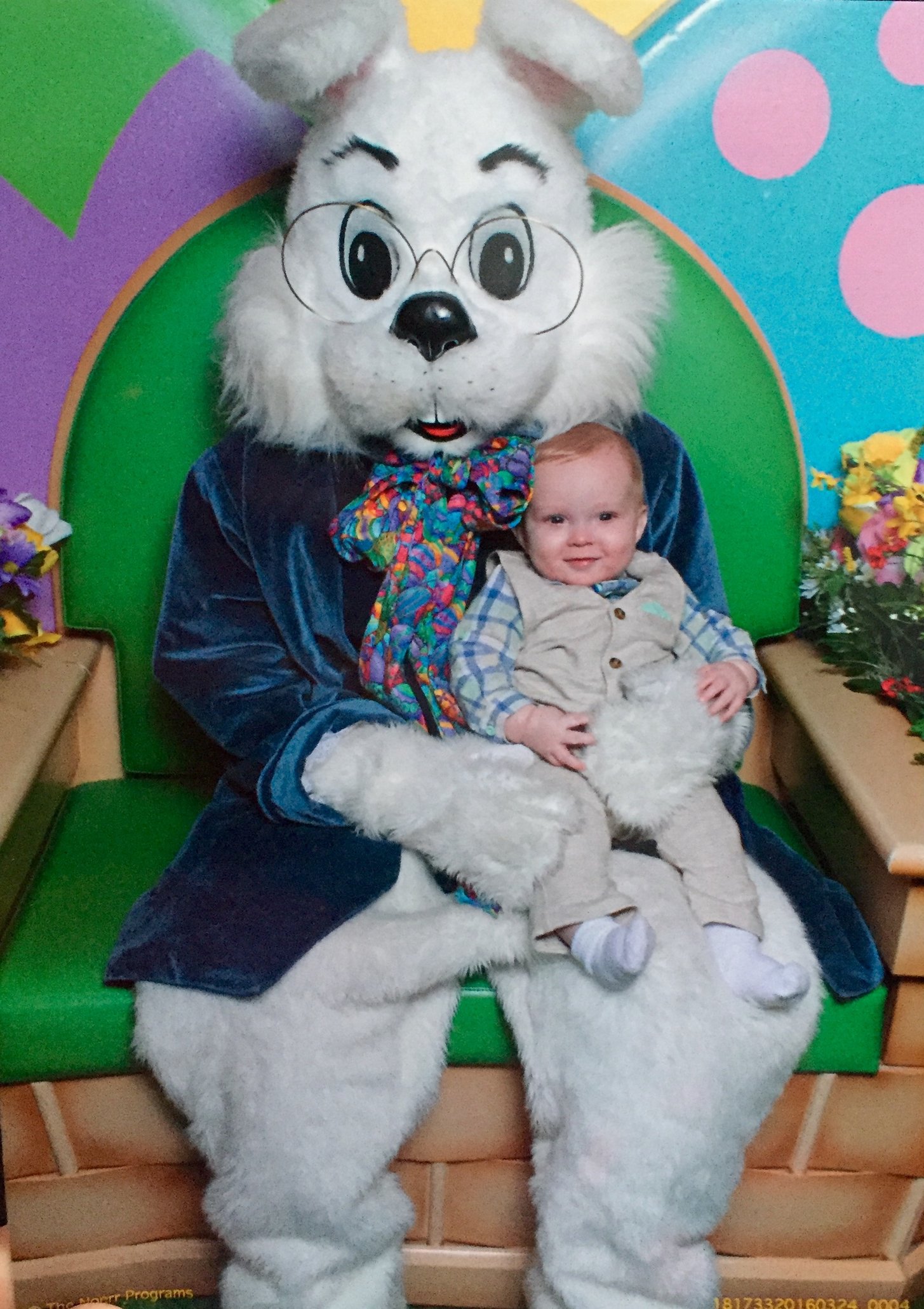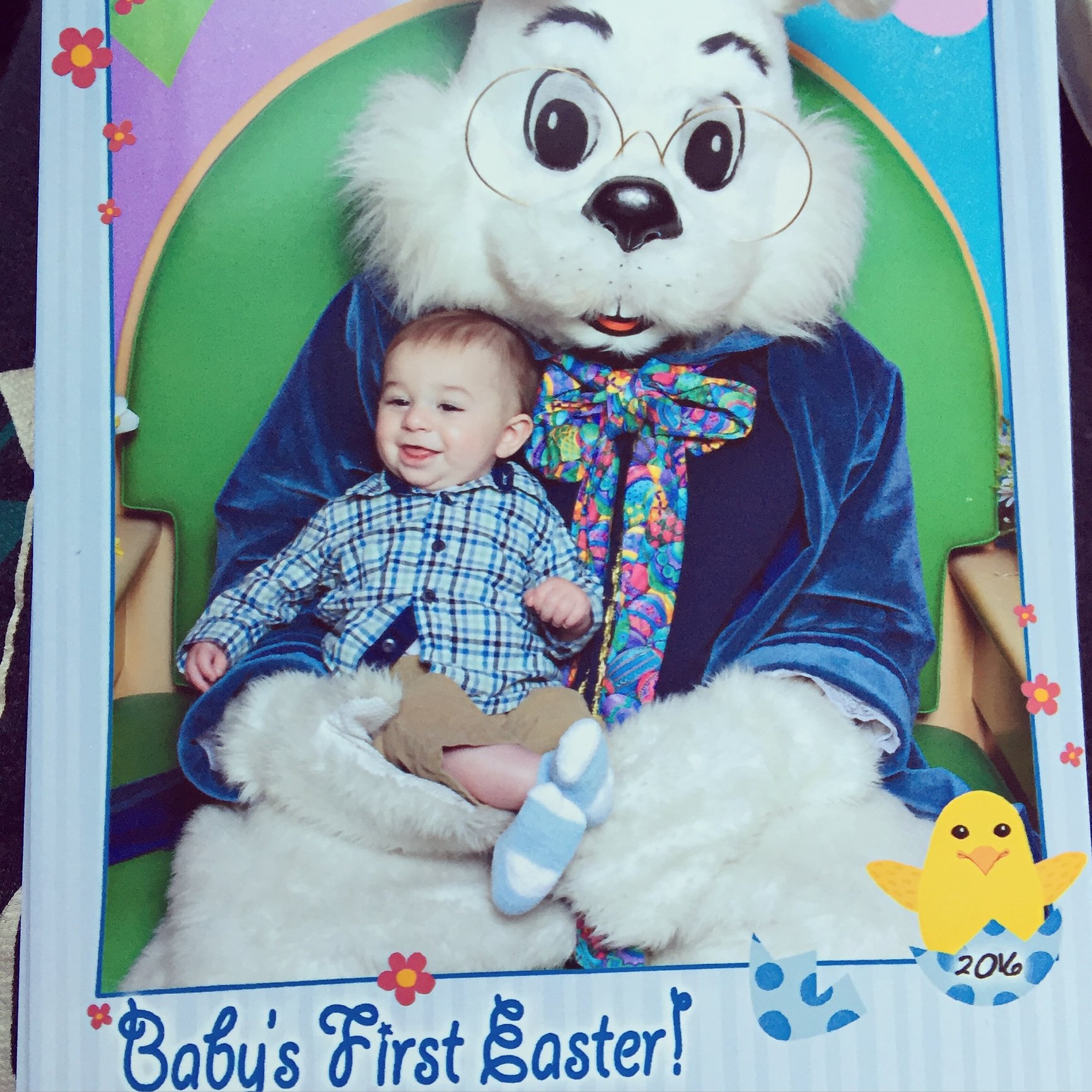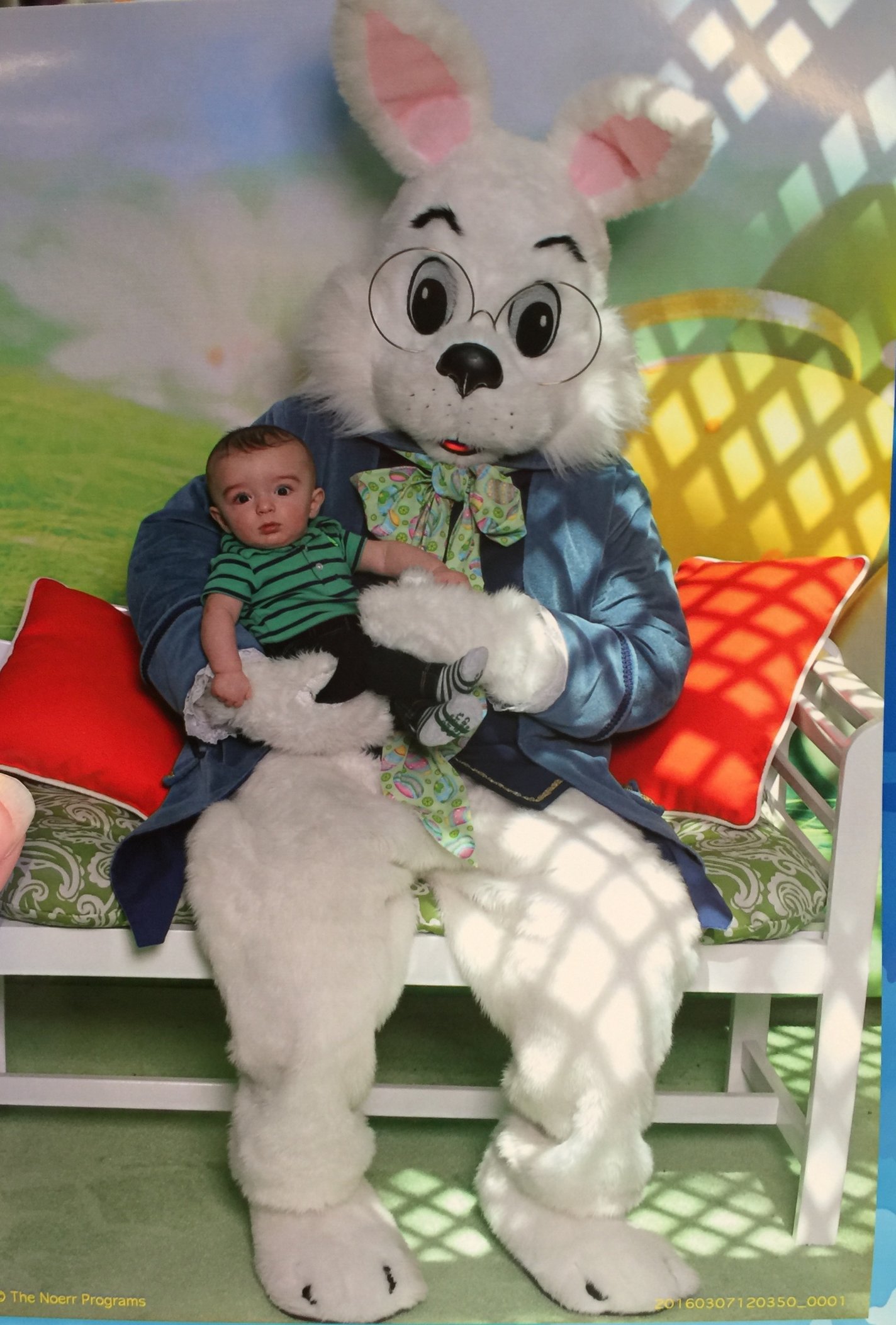 Two seconds in. He LOVED the Easter bunny! (Right after people had to comment on "is he ever not happy".....we ended this trip with crying the whole way home... Thanks bunny people. Thanks. Ha)