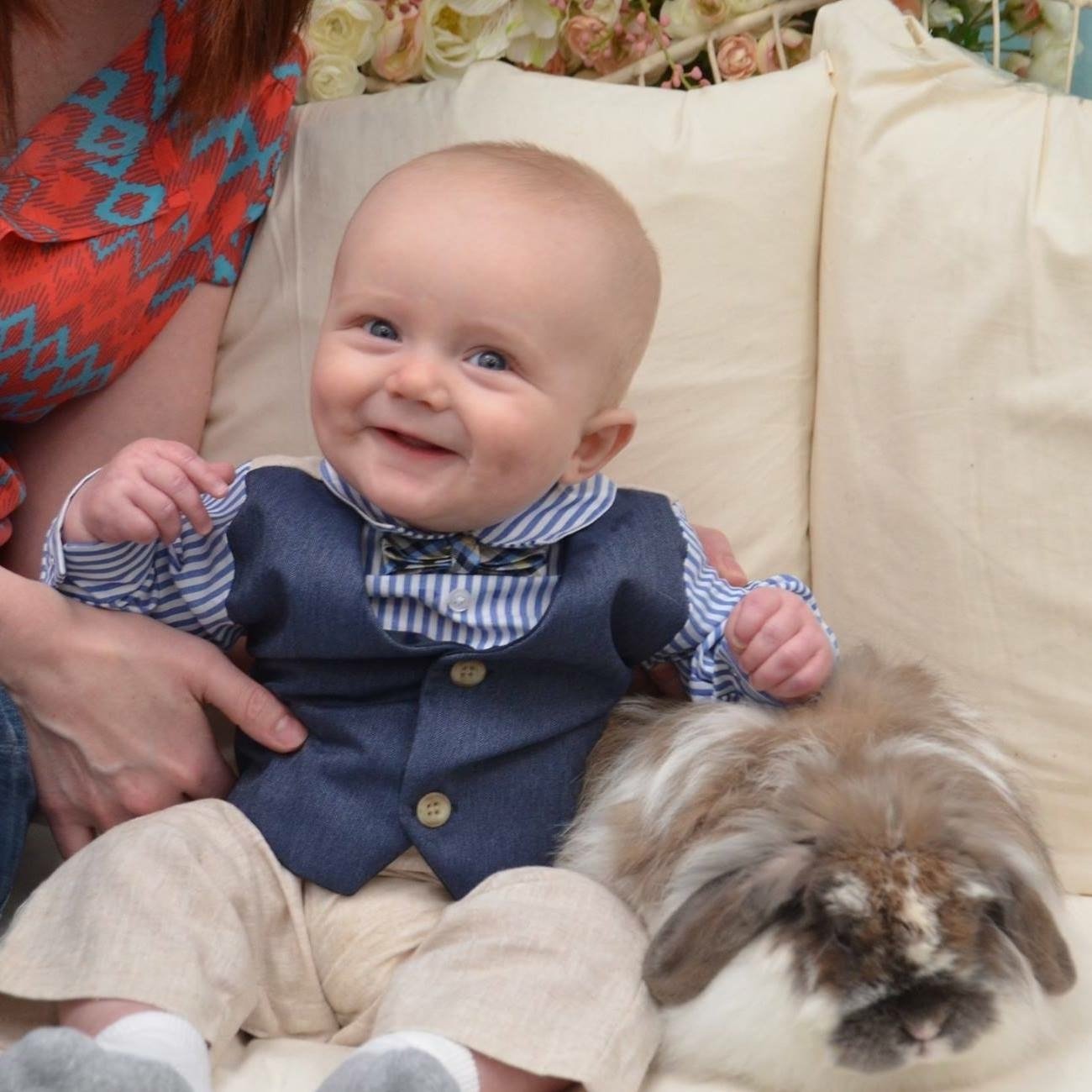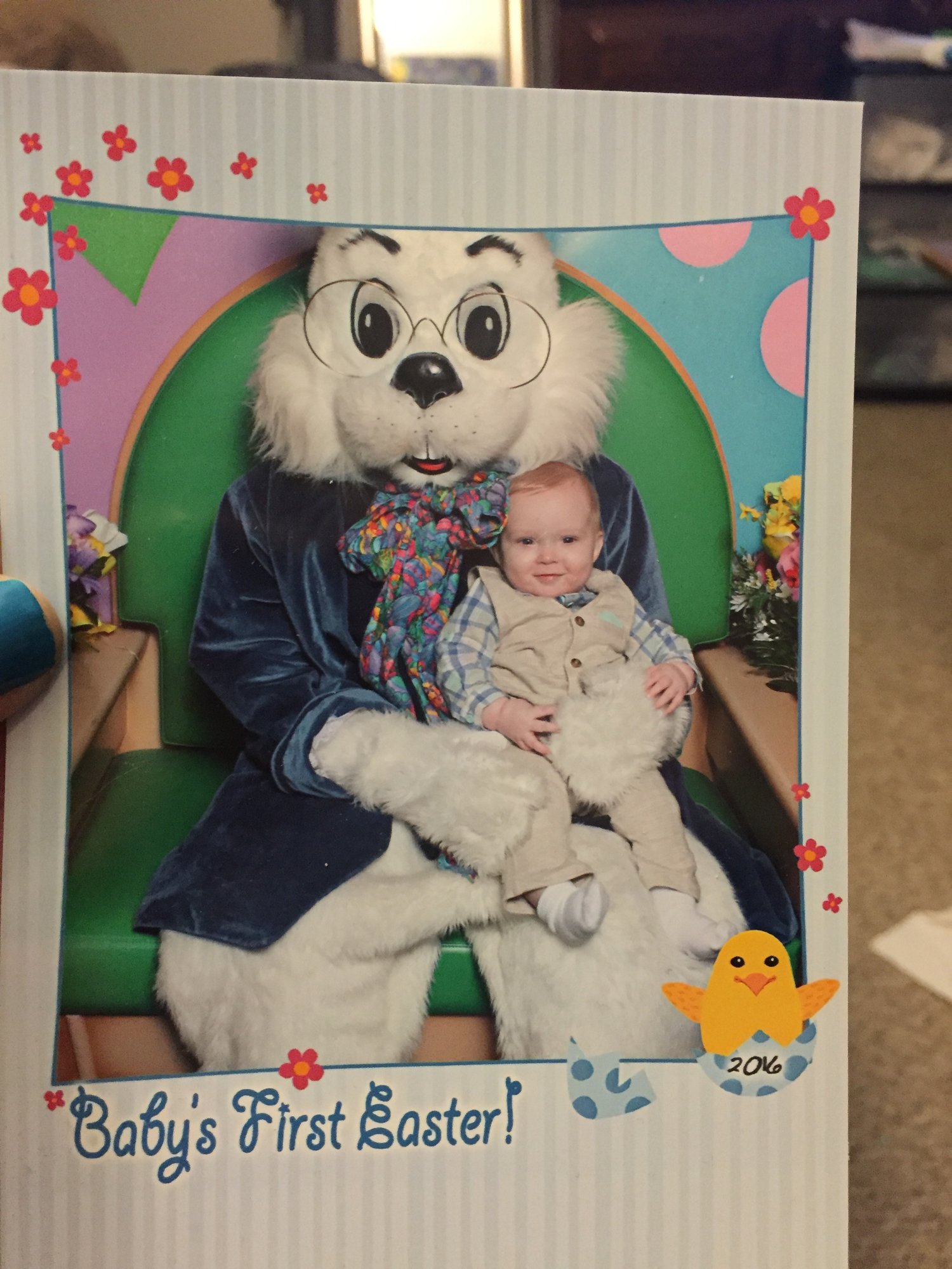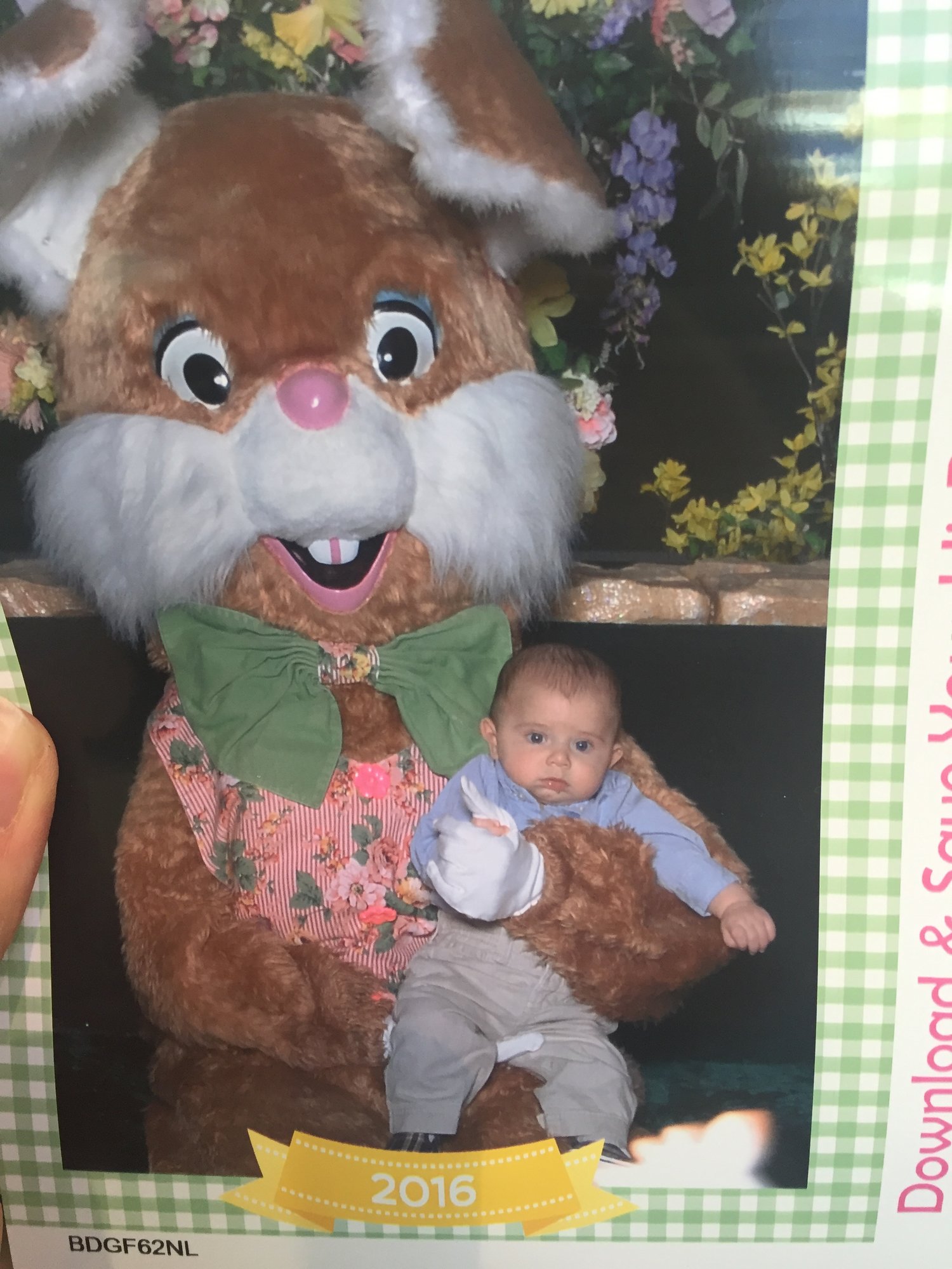 Two seconds in. He LOVED the Easter bunny! (Right after people had to comment on "is he ever not happy".....we ended this trip with crying the whole way home... Thanks bunny people. Thanks. Ha)