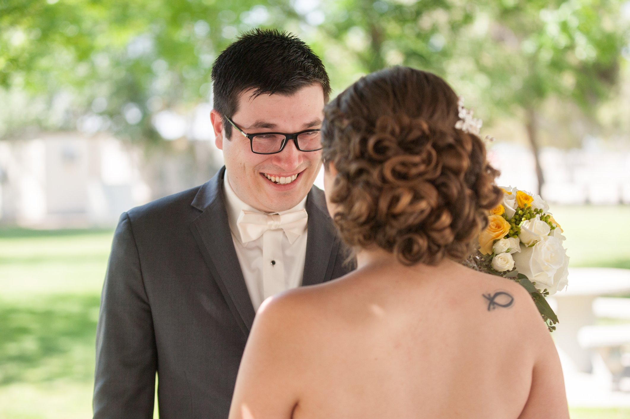 Okay well I don't know why the fuck it won't put my picture down here BUT. This is from our "first look." I think I love it so much because #1 we got so much flack for opting for this option. Everyone was telling us, "no. You'll regret it." "It's so much more special the 'right' way." We gave in until our photographer suggested it again for convenience purposes.