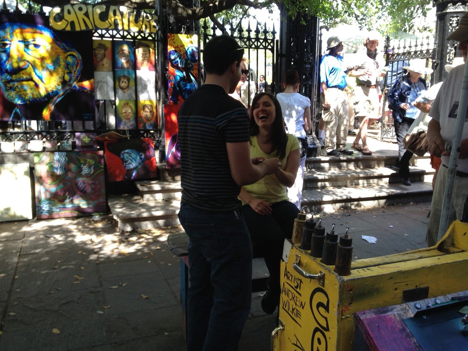 GTKY: Share one of your favorite candid photos of you and your SO, and tell us why you love it so much: It would have to be when DH proposed. He had a caricature done of us in Jackson Square in New Orleans and there were a ton of people walking by and some stopping to watch the artist draw it. I had no idea what it looked like but some people did stop and just watched the whole thing I guess as it became obvious what the artist was drawing (DH proposing). This was seconds after the proposal, snapped by a couple who watched the whole thing and were kind enough to send us (and take!) the photos. I'm tearing up thinking about it...darn pregnancy hormones!