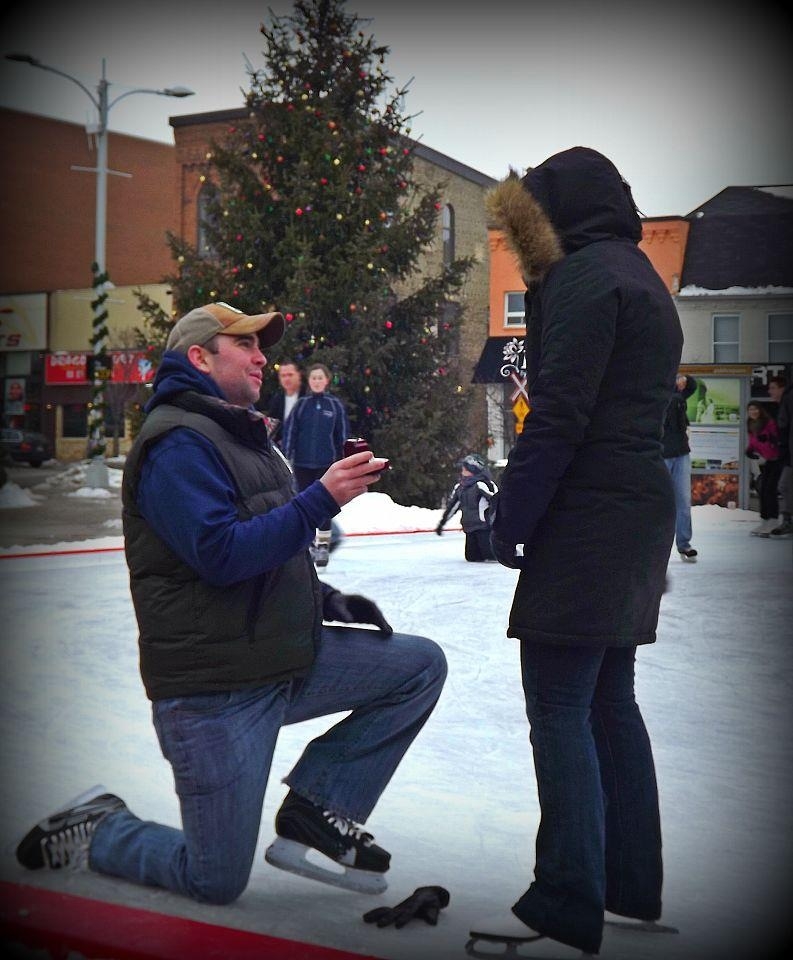 This GTKY had me stumped for a minute this morning, & then I remembered that I have this one. It's my favourite because I had no idea it was going to happen that day. We were spending the afternoon skating with our best friends & their daughters (who were later all in our wedding party), & everyone was in on it but me. I was completely shocked. He was worried because there were a lot of people around, but in the moment it was such a blur & I only saw him.
